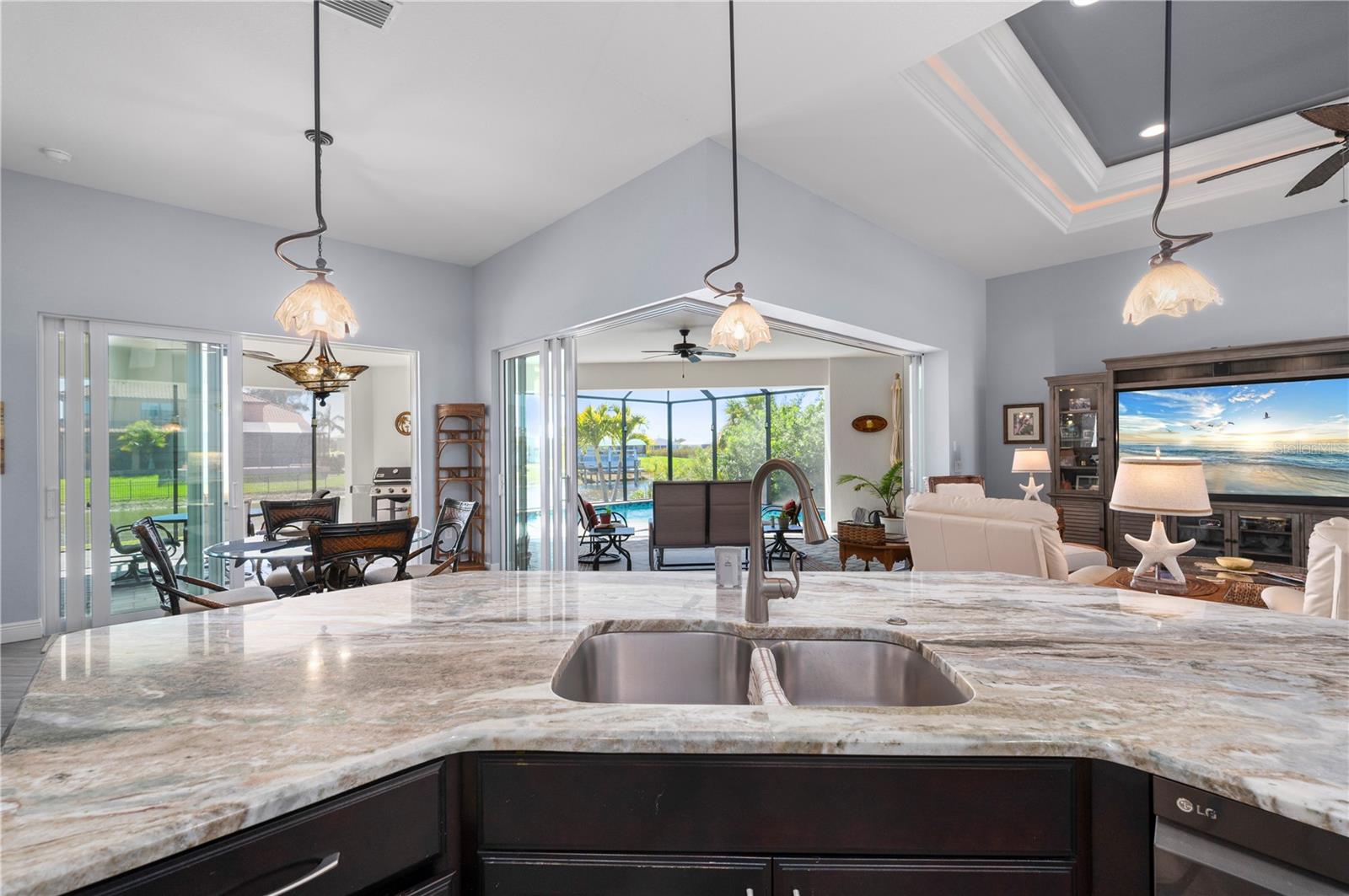 Open design. Intentional detail. Expansive water views. Built in 2017, designed with intention and priced to sell, this 3 bedroom, 2 bath waterfront pool home delivers over 1,900 square feet of open-concept living in the boating community of South Gulf Cove. With a concrete seawall and access to more than 55 miles of navigable canals leading toward Charlotte Harbor and the Gulf Islands, this is Florida waterfront living shaped around light, air, and connection. From the moment you step inside, porcelain driftwood-style plank flooring set on a diagonal guides your eye through the home, creating subtle movement and a cohesive, upscale finish throughout. Ceilings rise beyond 11 feet, amplifying the sense of space. In the living room, double tray ceilings with crown molding and ambient lighting add architectural dimension, while triple pocketing zero-edge sliders erase the wall between indoors and out. Push them open and the home expands. The pavered lanai area unfolds into multiple seating areas flanking a custom heated triangular pool, strategically designed to embrace long, tranquil water views. Custom "noseum" screen panels preserve the panorama while enhancing comfort. This is seamless indoor-outdoor entertaining, engineered for gatherings, quiet mornings, and sunset evenings alike. At the center of it all, the kitchen commands attention. Large granite countertops, an expansive island built for conversation, and staggered contrast wood cabinetry create depth and visual interest. Black stainless appliances complete the aesthetic. Whether hosting holidays or casual waterfront dinners, the flow between kitchen, dining, and living spaces makes entertaining effortless. The primary suite offers privacy and scale, with tray ceilings reaching 10 feet and direct slider access to the pool. The en-suite bath feels refined and spa-inspired, featuring a walk-around Roman-style shower with contrasting tile, dual vanities, and thoughtful finishes that echo the home's attention to detail. Two additional bedrooms are positioned on the opposite side for privacy, sharing a well-appointed bath with convenient pool access. The laundry room includes cabinetry for organized storage. A 3-car garage provides ample space for vehicles, tools, or hobbies. Built with durability in mind, the home features impact windows, Storm Smart electric hurricane screens, and a concrete tile roof for layered storm protection. Additional updates include: newer HVAC, new pool heater control panel, upgraded electric panel for generator hook-up and Conserva Irrigation system. The concrete seawall enhances the waterfront setting while reinforcing long-term value and an optional HOA keeps flexibility on your side. Situated in one of the fastest-growing waterfront communities in Charlotte County, and within reach of Southwest Florida's renowned beaches, boating routes, dining, and coastal destinations, this Gulf-access pool home combines modern construction, architectural detail, hurricane protection, and heated pool luxury into one cohesive Florida lifestyle opportunity. Clean sightlines. Water as your backdrop. A home that performs beautifully and lives even better.