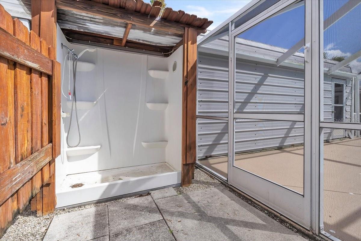 Exterior: Lighting, Outdoor Shower, Rain Gutters, Shade Shutter(s), Sliding Doors, Storage