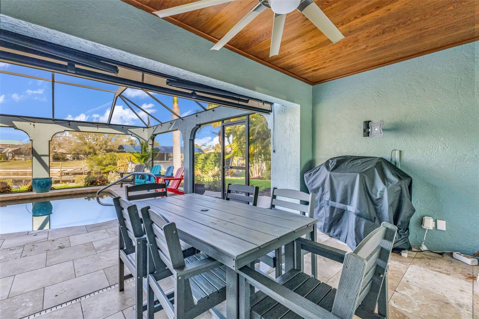 Come see this Key West-Style Pool Home with Dock & Boat Lift and see how you can live the Florida waterfront lifestyle! Located on the quaint and off the path 4255 Spire Street, this beautifully renovated Key West-style home is set on an oversized waterfront lot in Gulf Cove, a boating and riverfront comunity on the Myakka River. A true boater's dream, this home offers you your very own dock and lift--perfect for enjoying sunset cruises, fishing trips, and easy days on the water before coming home to jump in the saltwater pool to cool off. This spacious (over 2500 under air!) 4-bedroom, 4 bath residence offers the perfect combination of coastal charm, modern upgrades, and boating convenience. Once inside you will find beautiful wood flooring, French doors, and plantation shutters that bring warmth and character to the home. The thoughtful layout provides flexibility for family and guests alike, featuring two spacious bedrooms downstairs with 1 and a half baths, while the upper level includes an additional bedroom along with a very generous primary suit with a spacious bathroom with a stand alone Garden Soaking tub, seperate walk in shower, dual sinks and a window overlooking the street below.This home is full of standout features including a spiral staircase connecting the downstairs family room to the upstairs family room, adding a unique architectural feature and convenient access between the two living spaces. Outdoor living here is truly exceptional. Enjoy the heated saltwater pool with newer saltwater equipment for year-round swimming and entertaining. A motorized awning provide additional shade poolside if desired plus more than 50 high-end, color-changing LED landscape lights illuminating the palms and outdoor areas to set the mood, both remote controlled. There is an additional shed with electric for your tools, you will want the oversized garage with storage cabinets and extra work space for your boating gear, cars and toys! For boating enthusiasts, the home includes 90 feet of concrete seawall, a private dock, and a upgraded 10,000-lb boat lift with a new 12-foot canopy, making it easy to enjoy everything Southwest Florida waterways have to offer.A unique architectural feature is the walkaround deck that wraps from the front of the home to the back, designed as a walking balcony and previewing area, with stairs from both the front and rear of the home. No concerns for the Florida breeze ... All windows and sliders are impact glass for peace of mind and the home sits high and dry!Additional recent upgrades include ** Freshly painted exterior ** Driveway and sidewalks recently cleaned and sealed ** Downstairs A/C only 2 years old and the upstairs was replaced in 2021 ** Washer and dryer less than one year old with minimal use ** New garbage disposal ** New Irrigation system with wifi controls ** 50 plus Highend landscape lights with time control ** New landscaping in the back yard **This beautifully maintained waterfront home offers privacy, style, and the ultimate Florida boating lifestyle. Call your agent today, this home is a one of a kind and you wont want to miss this opportunity!Everything stays outside of a few personal items and favorites.. ask agent for the list.