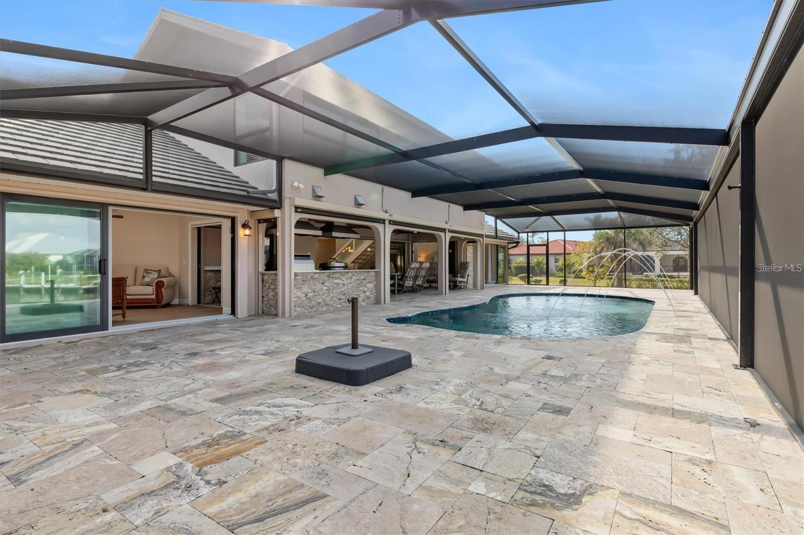 Experience unparalleled waterfront luxury in this sprawling 5-bedroom, 3.5-bathroom estate, offering over 4,100 sq. ft. of sophisticated living space on a rare double lot. BRAND NEW METAL ROOF JUST ADDED. With breathtaking water views and direct Charlotte Harbor access, this home is a boater's dream, featuring two docks and a 12,000lb boat lift just minutes from open water. From the moment you arrive, beautifully landscaped grounds and elegant pavers lead to an oversized three-car garage and impressive double front doors. Inside, dramatic two-story ceilings and an open-concept layout create a grand and airy atmosphere, with a loft overlooking the main living space. The chef's dream kitchen is equipped with top-of-the-line Miele appliances, a Subzero Wolf refrigerator and freezer, Fusion Granite countertops, and a stunning LED-lit onyx backsplash. Custom cherry wood cabinetry with soft-close features, a walk-in pantry, and a wet bar with a wine fridge and illuminated onyx accents make this kitchen both functional and exquisite. Designed for entertaining, the home seamlessly blends indoor and outdoor living. A 37-ft picture window frames uninterrupted waterfront vistas, while the resort-style saltwater pool, renovated just two years ago, features color-changing LED lights, four stream fountain jets, and an electric heater controlled via the Pentair App. The outdoor space is further enhanced by a fully equipped summer kitchen, complete with an Evo griddle, Twin Eagle BBQ, stainless steel vent hoods, and a granite bar with seating for four. Antique Onyx Travertine flooring extends from the pool deck to the pathway leading to the boat lift, creating a seamless transition between luxury and nature. A private outdoor shower with marine-grade fixtures and split-face Travertine accents adds to the home's resort-like ambiance. The expansive master suite is a true retreat, featuring travertine flooring, sliding doors to the lanai, and a luxurious spa-inspired bathroom. The master bath showcases an antique Onyx Travertine floor, a Jacuzzi tub with Brizio fixtures, and a dual-head marble shower, exuding elegance and relaxation. The additional bedrooms offer peaceful sanctuaries for guests, with one currently serving as a home office with lanai access. A guest bathroom features a marble-tiled soaking tub and granite slabs in the shower, adding to the home's sophisticated charm. Every detail has been carefully considered, from hurricane-rated doors, garage door, and windows to soft-close cabinetry and premium finishes throughout. Lush landscaping surrounds the property, including Valencia Pride and Alphonso mango trees, an avocado tree, and a banana tree, enhancing the tropical feel of this waterfront paradise. With unmatched craftsmanship, breathtaking water views, and direct access to Charlotte Harbor, this estate is the epitome of luxury coastal living. 1701 Casey Key Drive offers a rare opportunity to own an exceptional waterfront home in Punta Gorda Isles, where every day feels like a vacation.