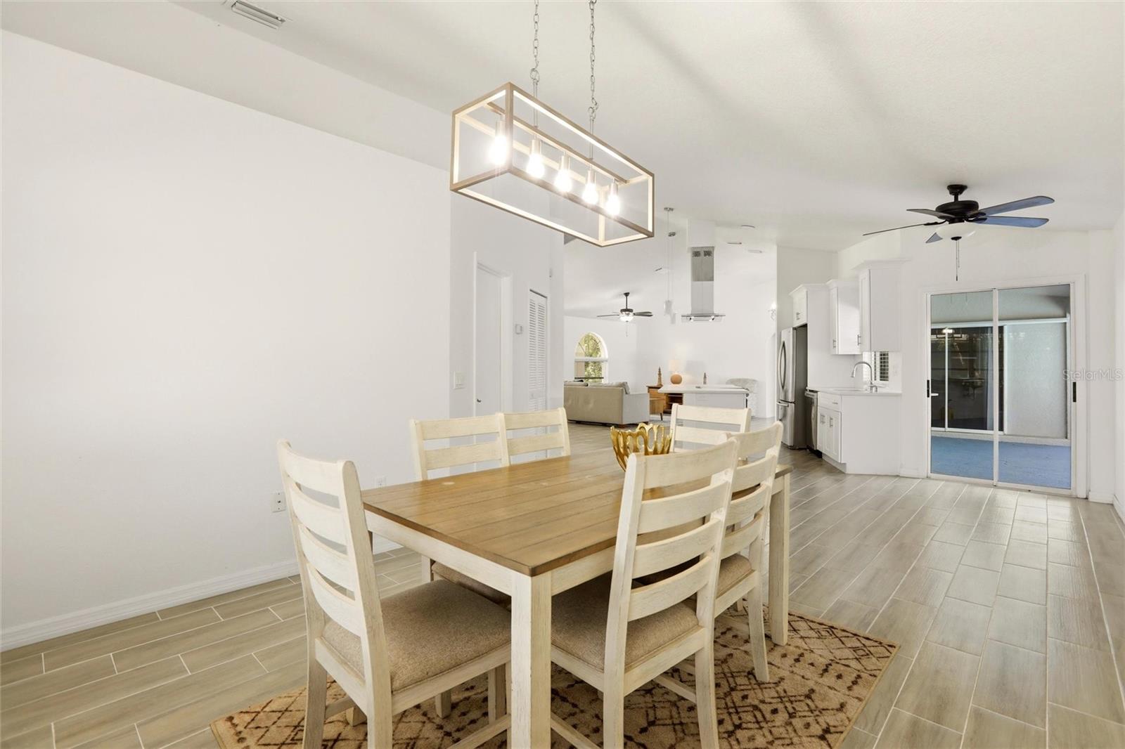 Welcome to this inviting Port Charlotte pool home offering four bedrooms, two bathrooms, and approximately 2,029 square feet of thoughtfully designed living space. This attractive single-story residence features a covered arched patio entryway, durable metal roof, and a paver driveway leading to a spacious two-car garage. Step inside to a bright, open-concept layout designed for both comfort and entertaining. The expansive great room showcases vaulted ceilings and stylish modern lighting, while oversized sliding glass doors flood the space with natural light and create a seamless indoor-outdoor connection to the screened pool and lanai. The living area flows effortlessly into the kitchen and dining spaces, making it ideal for gatherings or everyday living. Warm wood-look tile flooring, soft textures, and ceiling fans throughout add to the welcoming, year-round comfort. The beautifully designed open kitchen blends style and functionality with crisp white cabinetry, sleek quartz countertops, and a generous center island featuring a built-in microwave and range--perfect for casual meals or entertaining. Stainless steel appliances, modern pendant lighting, and a striking stainless range hood add a contemporary finish. Large windows provide abundant natural light and pleasant views of the outdoor space. The laundry room is conveniently located just off the kitchen and includes a washer, dryer, and utility sink. A versatile dining area offers flexibility to suit your lifestyle. Currently styled as a formal dining room, this light-filled space features modern lighting, neutral finishes, and seamless flow into the kitchen and living areas. With its generous size and open layout, it can easily be reimagined as a family room, additional living space, or casual gathering area.The primary suite is privately situated on one side of the home, providing a peaceful retreat complete with his-and-hers walk-in closets, a dual-sink vanity, and a spacious walk-in shower. On the opposite side of the home, three additional bedrooms--each with built-in closets--share a full guest bathroom. One bedroom offers direct access to the pool, making it ideal as a guest suite or private retreat. The guest bath also serves as a convenient pool bath and features a walk-in shower that mirrors the stylish design of the primary bathroom. Any of these bedrooms can easily function as a home office, guest room, gym, or flex space. Outside, your private backyard oasis awaits. The screened-in pool and expansive deck provide the perfect setting to relax and enjoy the Florida sunshine year-round. The home is connected to public water and sewer, eliminating the need for a well or septic system. Situated in a well-established neighborhood close to shopping, dining, schools, and all that Port Charlotte has to offer, this move-in-ready home is low-maintenance and thoughtfully designed for modern Florida living. **PLEASE ENJOY THE 3D INTERACTIVE VIRTUAL TOUR ASSOCIATED WITH THIS LISTING**
