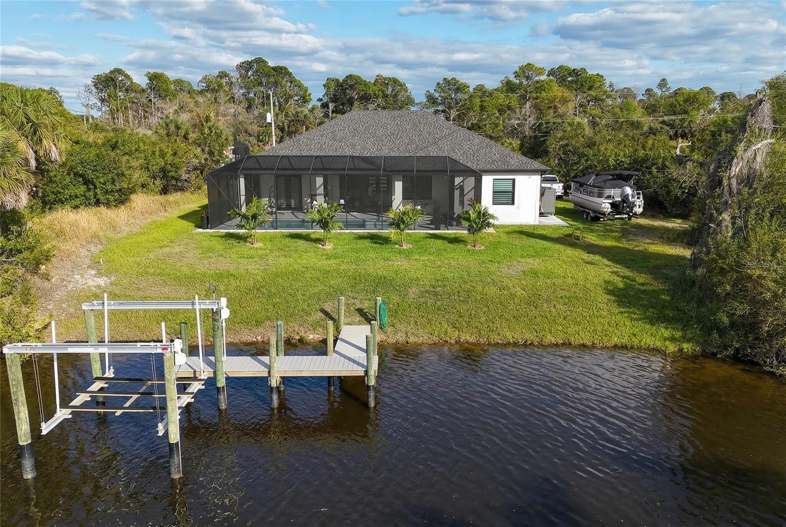 Welcome to a stunning 2024- custom built waterfront estate where modern design meets the ultimate Florida lifestyle. Offering 2,245 sq ft of living space (3,247 total), this meticulously crafted home features 3 bedrooms, 2.5 bathrooms, a private office, formal dining room, and a cozy breakfast nook, all designed with comfort and perfection in mind. Step inside and immediately notice the 12-foot ceilings, 8-foot interior doors, and an abundance of natural light that enhances the home's expansive open-concept layout. The engineered hardwood flooring over premium cork underlayment provides superior sound insulation and a soft, luxurious feel underfoot. The chef's kitchen is both functional and elegant, featuring: Two full-size refrigerators, Quartz countertops throughout with huge waterfall island, Extra-deep 15" upper cabinets, Commercial-grade 950 CFM range hood, Spacious walk-in pantry with quartz counters & 20-amp outlets Perfect for entertaining or everyday convenience. Enjoy your private backyard oasis with: Saltwater heated pool & spa, Screened lanai with outdoor kitchen, Paver pool deck installed over a solid concrete base, 10,000 lb boat lift. Private fishing deck with water hookup. Located on a saltwater canal with access to the Myakka River and Gulf of America, offering the ultimate boating lifestyle. Reach Fishermen's Village in approximately 30 minutes by boat. Premium Upgrades & Features: Hurricane-impact windows and exterior doors, Whole-house Kinetico reverse osmosis system, Whole-house generator connection, Private well with sprinkler/irrigation system, Garage with LVT flooring, pre-wired for future mini-split A/C. This home offers a rare combination of new construction, high-end finishes, and true Gulf-access waterfront living--perfect as a primary residence, vacation retreat, or investment opportunity. Schedule your private showing today and start living the Florida dream.