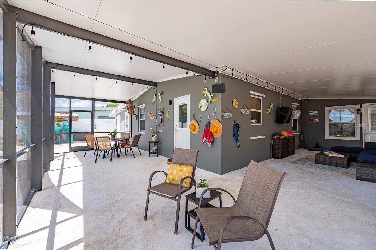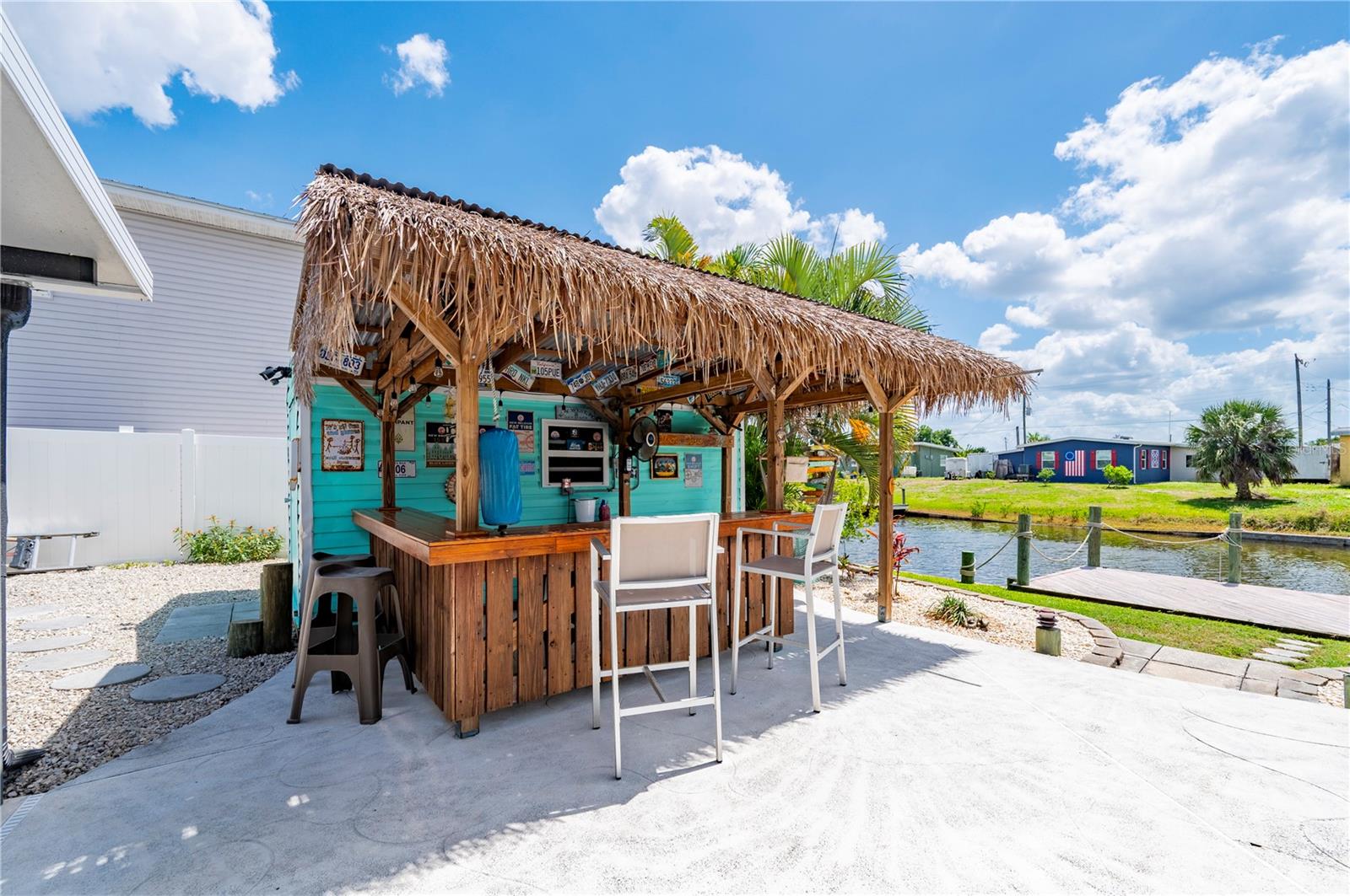 Morning light filters softly through the skylit foyer as you step inside this turnkey waterfront home in Port Charlotte, where every space is designed to flow with the rhythm of relaxed coastal living. The open great room brings together living, dining, and kitchen areas in one inviting sweep, finished with ceramic tile throughout. In the kitchen, stainless steel appliances and granite counters create a polished yet practical hub, while the primary suite offers a private retreat with a beautiful walk in shower, and direct access to the pool. Two additional guest rooms provide flexibility for visitors or extended stays, with one offering its own entrance to the outdoor living area, adding a layer of comfort and privacy. Step outside and the atmosphere shifts into a true tropical escape built for entertaining. The oversized covered and screened lanai opens to a resort-style pool reaching up to six feet deep, complete with a tiki bar, sunshade, and outdoor grilling area that invites long afternoons and unforgettable evenings. Beyond the pool, the fenced yard steps down into a green space for pets or play before leading down to the canal, where a private dock and 8,000 pound, covered boat lift place you within about 10 minutes of open water, connecting seamlessly to Charlotte Harbor and Gulf access boating and fishing. A side front porch, an extended carport and double gate access to a dedicated boat/RV parking on crushed gravel/limestone, make everyday living as functional as it is enjoyable with no deed restrictions. Set in Port Charlotte with easy access to Tamiami Trial near golf courses, Sunseeker Resort, downtown Punta Gorda dining, shopping, medical facilities, Punta Gorda Airport, and I 75, this property delivers the kind of Florida lifestyle that feels effortless from the moment you arrive.