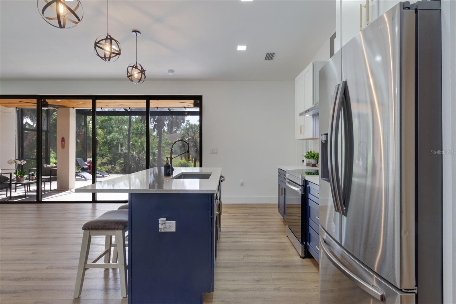 Come take a walk through your new home with the 3D interactive virtual tour! Modern design meets Florida lifestyle in this beautifully updated 3-bedroom, 2-bathroom POOL HOME with an OVERSIZED GARAGE, offered as seen. Situated on a FRESHWATER CANAL with peaceful views and a quiet setting, this home offers over 1,750 sq ft of thoughtfully designed living space. From the moment you arrive, clean modern lines, a METAL ROOF, HURRICANE IMPACT WINDOWS, wood-accent exterior, and a striking prismatic glass front door set the tone. Lush tropical landscaping with curbing, fresh mulch, and blooming hibiscus guide you to a covered front porch with a WOOD CEILING. Inside, the open living and dining area features a SHIPLAP ACCENT WALL, and luxury vinyl plank flooring throughout for style and easy maintenance. The main living space is ideal for everyday living and entertaining, highlighted by designer sphere lighting, recessed lighting, and a full wall of sliding glass doors opening seamlessly to the lanai. The gourmet chef's kitchen is a standout with QUARTZ countertops, ornate tile backsplash, soft-close cabinetry, two built-in pantries, and a large center island with seating. What more could you want? How about all of the stainless steel appliances being included, along with a wine fridge and coffee bar. The spacious primary suite offers a large walk-in closet with built-in shelving and a spa-inspired bathroom featuring dual sinks, updated vanity, and a custom textured tile shower. The split-bedroom floor plan provides privacy, with two additional bedrooms and a full bathroom perfect for guests or family. Enjoy indoor-outdoor living with a full-width sliding glass opening leading to a covered lanai featuring a beautiful WOOD CEILING detail. The covered lanai is the picture perfect spot to dine outdoors and it's open to your own private, HEATED SALTWATER POOL (just 2 years old) with built-in steps and bench seating, overlooking the peaceful FRESHWATER CANAL, creating a private and relaxed setting. A CLEARVIEW SCREEN enclosure allows uninterrupted wildlife views, while the outdoor bar area makes entertaining easy. Additional features include an interior laundry room with utility sink, finished garage, and a separate enclosed mechanical room housing the water heater, electrical panel, and A/C system. Over $100K in upgrades including the pool, blinds throughout, updated fixtures, hardware, custom primary closet, and epoxied garage floor. Washer/dryer, gym equipment, garage shelving, gardening tools, and patio furniture are included. Built with ICF (insulated concrete form) CONSTRUCTION, steel framing, and steel roof trusses, this home offers exceptional STRENGTH, energy efficiency, and durability, along with IMPACT WINDOWS and a METAL ROOF for added peace of mind. No deed restrictions, no HOA fees, and no flood insurance required. Conveniently located in North Port near shopping, dining, golf, fishing, medical facilities, spring training stadiums, Wellen Park, Sunseeker Resort, and Gulf beaches. If you're searching for a modern North Port pool home with high-end finishes and true indoor-outdoor living, this is one you don't want to miss. Schedule your showing today!