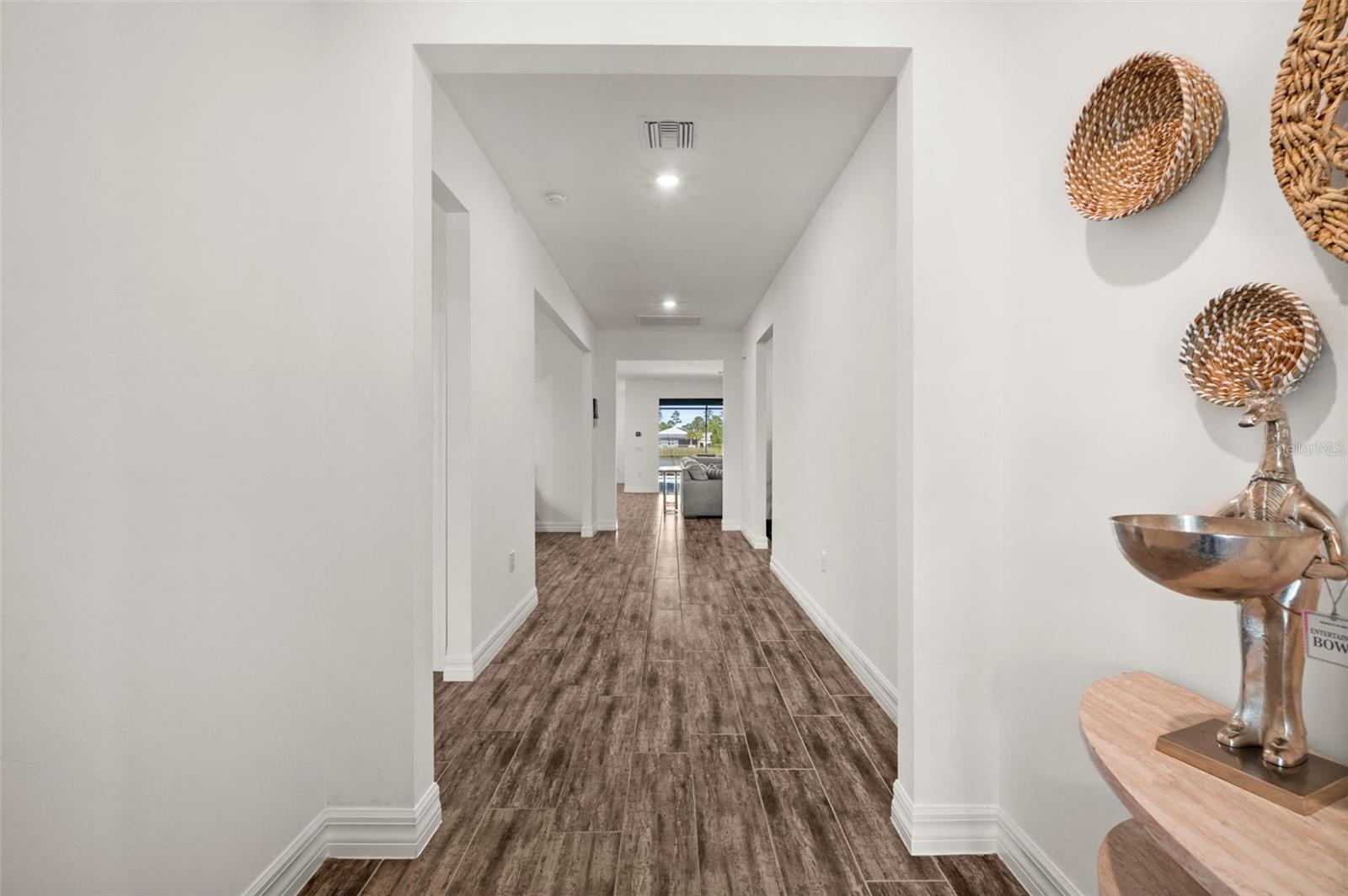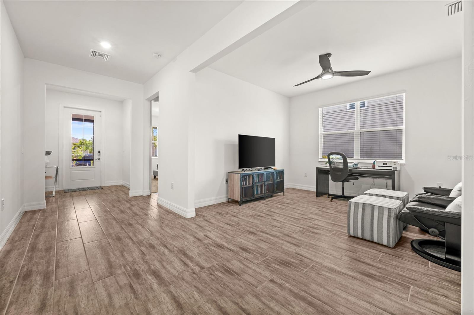 Welcome to this well-appointed home in the sought-after Lake Babcock neighborhood of Babcock Ranch. With an inviting front porch, peaceful pond view, and thoughtfully selected upgrades throughout, this property offers comfort, style, and Florida living. This single-story Willet model by Meritage Homes features just under 2500 square feet and a versatile layout designed for everyday living, working from home, and hosting guests. Wood-look tile flooring runs through the main living areas, adding both style and durability. The kitchen is designed with both function and style in mind, featuring quartz countertops, an electric cooktop, wall-mounted hood, combination oven and microwave, and a walk-in pantry. The primary suite includes a frameless glass shower and quartz countertops in the bath. Step outside to the screened lanai, where a freeform saltwater pool and raised spa overlook the tranquil pond, creating an ideal setting for outdoor living and entertaining. Additional highlights include spray foam insulation and dehumidifier in the attic for energy efficiency, a 3-car garage, whole-house gutters, privacy wood blinds, and screened front entry. Located in Babcock Ranch, residents enjoy access to community amenities, walking trails, charter schools, fiber internet, and a vibrant community setting. This move-in-ready home offers an opportunity to enjoy one of Babcock Ranch's most popular floorplans with exceptional upgrades already in place.