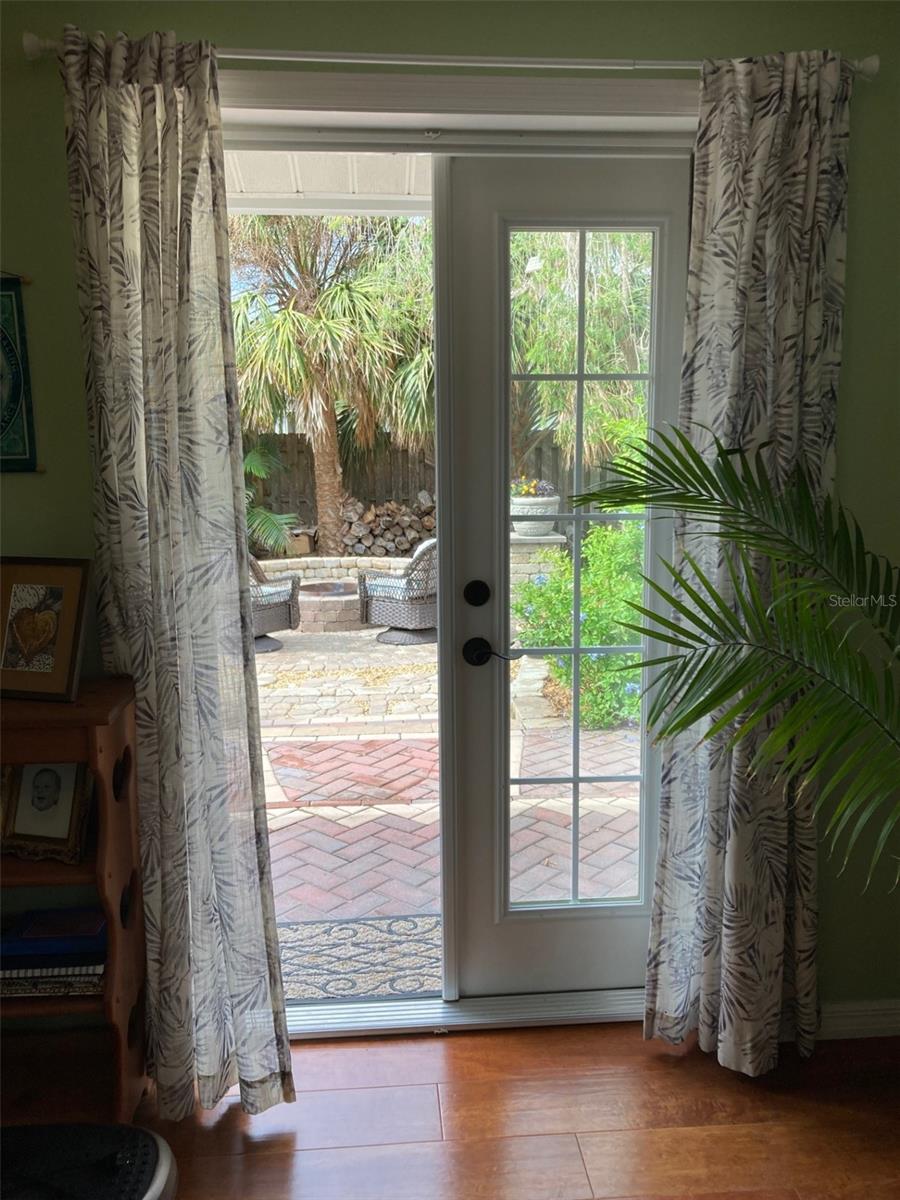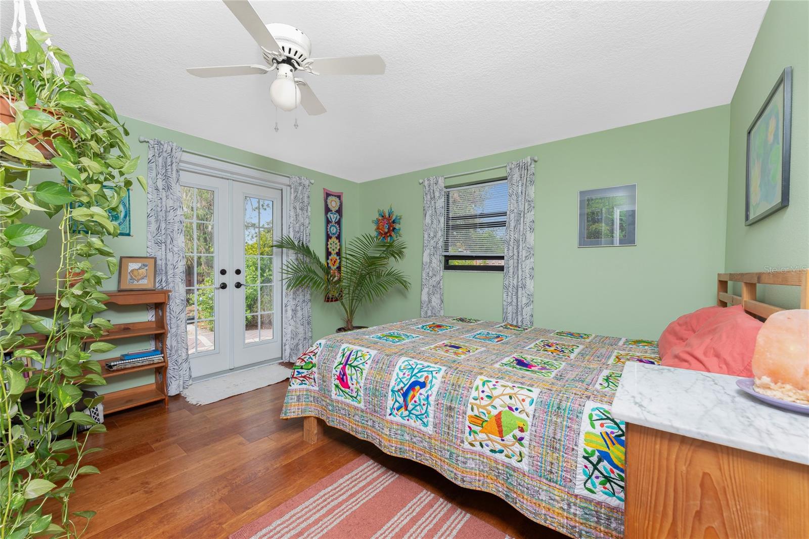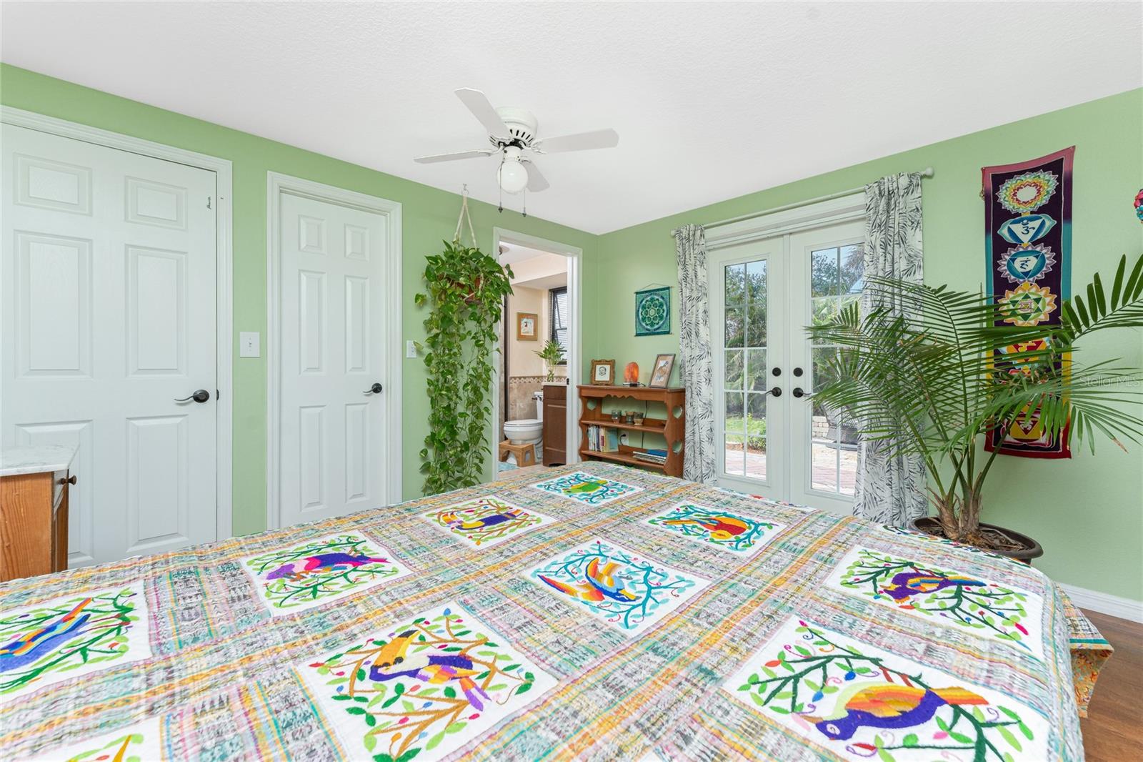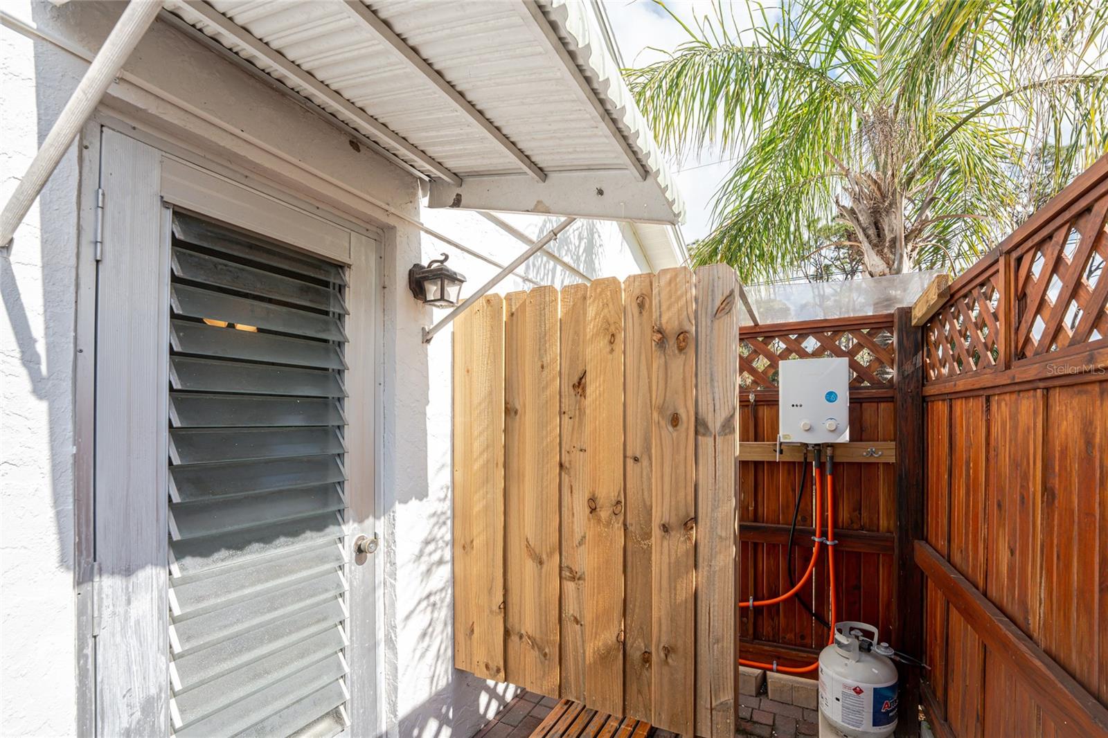Exterior: French Doors, Garden, Lighting, Outdoor Shower, Sidewalk, Sliding Doors, Storage