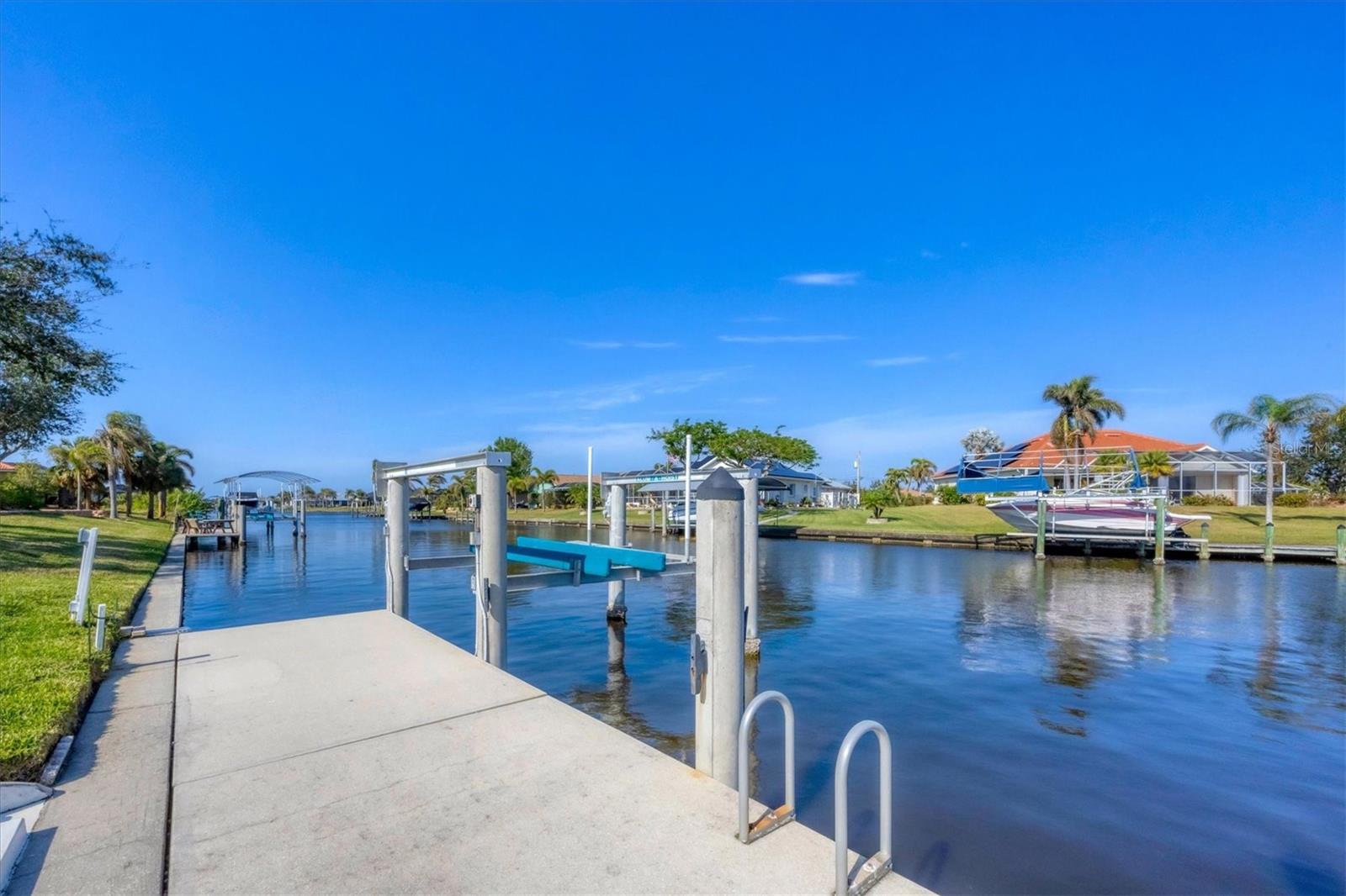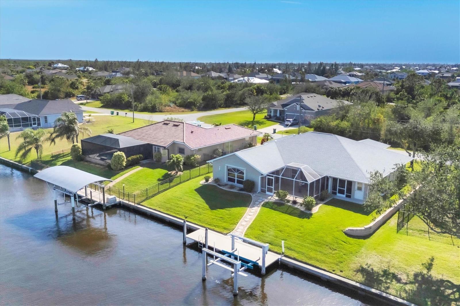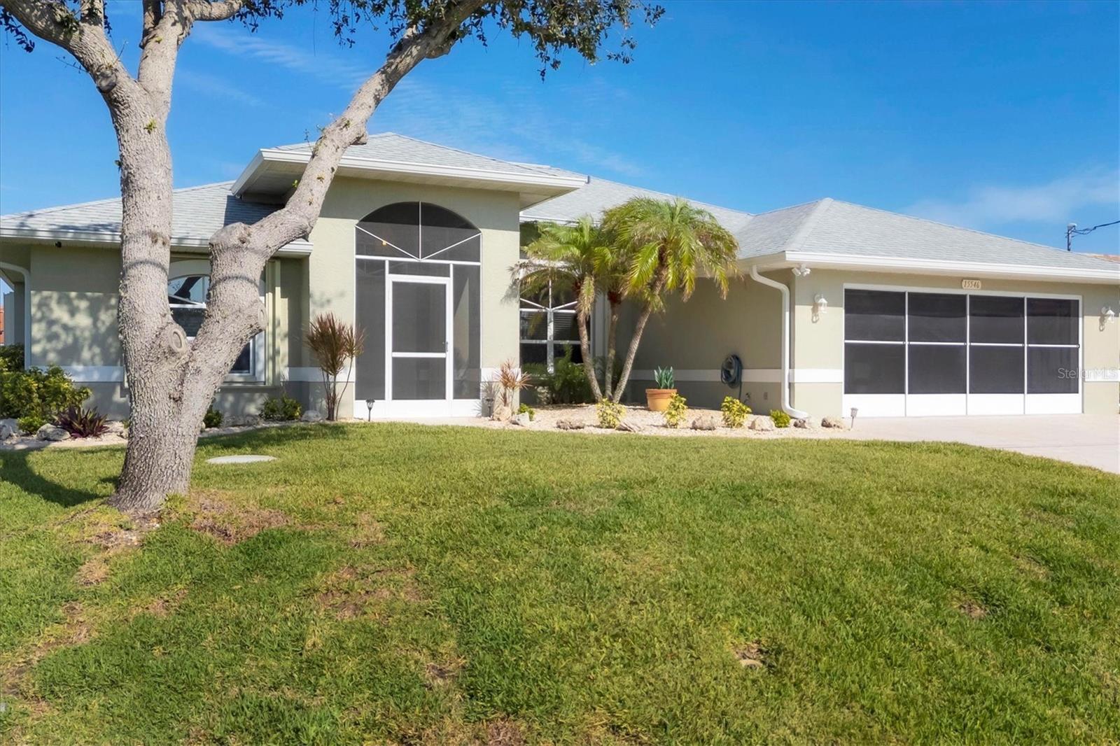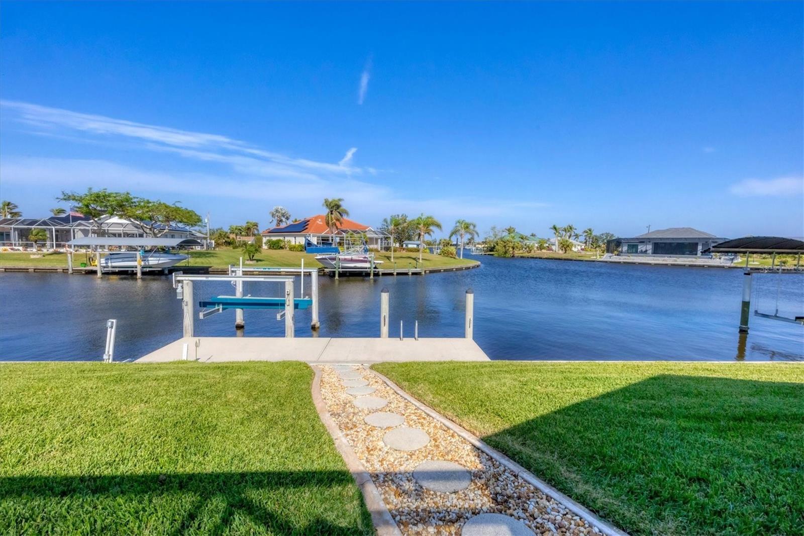 Discover this charming 3 bedroom, 2.5 bathroom waterfront home nestled in the coveted Section 93 of South Gulf Cove, offering breathtaking intersecting canal views. This residence provides direct access to the Gulf, making it a boater's paradise. Equipped with a seawall, cement dock, and lift, it ensures seamless and quick boating access through the nearby lock.Step inside and you'll be welcomed by a spacious, light-filled interior, where every room frames serene water vistas. A front screened entry with double doors leads you into a bright and airy living space, featuring volume ceilings and new tile flooring throughout.The renovated kitchen, updated in 2016, boasts Quartz countertops and backsplash, soft-close doors and drawers, complemented by a suite of newer stainless appliances. Designed for seamless entertaining, the home offers sliders from both the formal living and family rooms, providing easy access to the lanai. The expansive primary suite is designed to accommodate large furniture and features dual closets for ample storage. Sliders offer direct access to the lanai, allowing you to enjoy the beautiful outdoors with ease. The en-suite bathroom has been thoughtfully updated and boasts two sinks and a walk-in shower, creating a spa-like retreat.Guest bedrooms are thoughtfully situated on the opposite side of the home, with a conveniently located, updated bathroom between them, ensuring privacy and comfort for all occupants.Step outside to discover a large outdoor space featuring an extended lanai and pool bath, perfect for enjoying the Florida lifestyle. This versatile area can be enjoyed as is or offers plenty of room to add a custom pool of your own. The oversized two-car garage is complete with a utility sink and garage screen, creating a comfortable workspace or hobby area. Recent upgrades include a new roof installed in 2021, a new air conditioner in 2022, and a new generator added in 2023, ensuring modern comfort and reliability. With its open layout and picturesque views, this home is perfect for hosting gatherings or enjoying tranquil moments by the water. BONUS, house comes furnished, ask realtor for details!