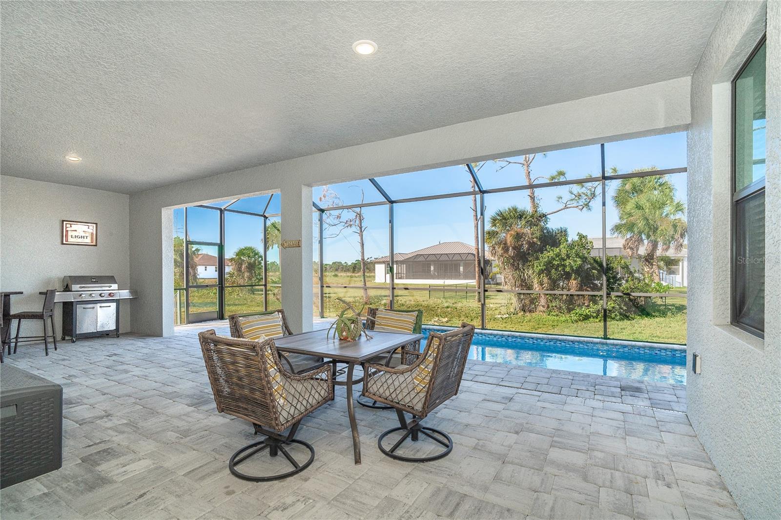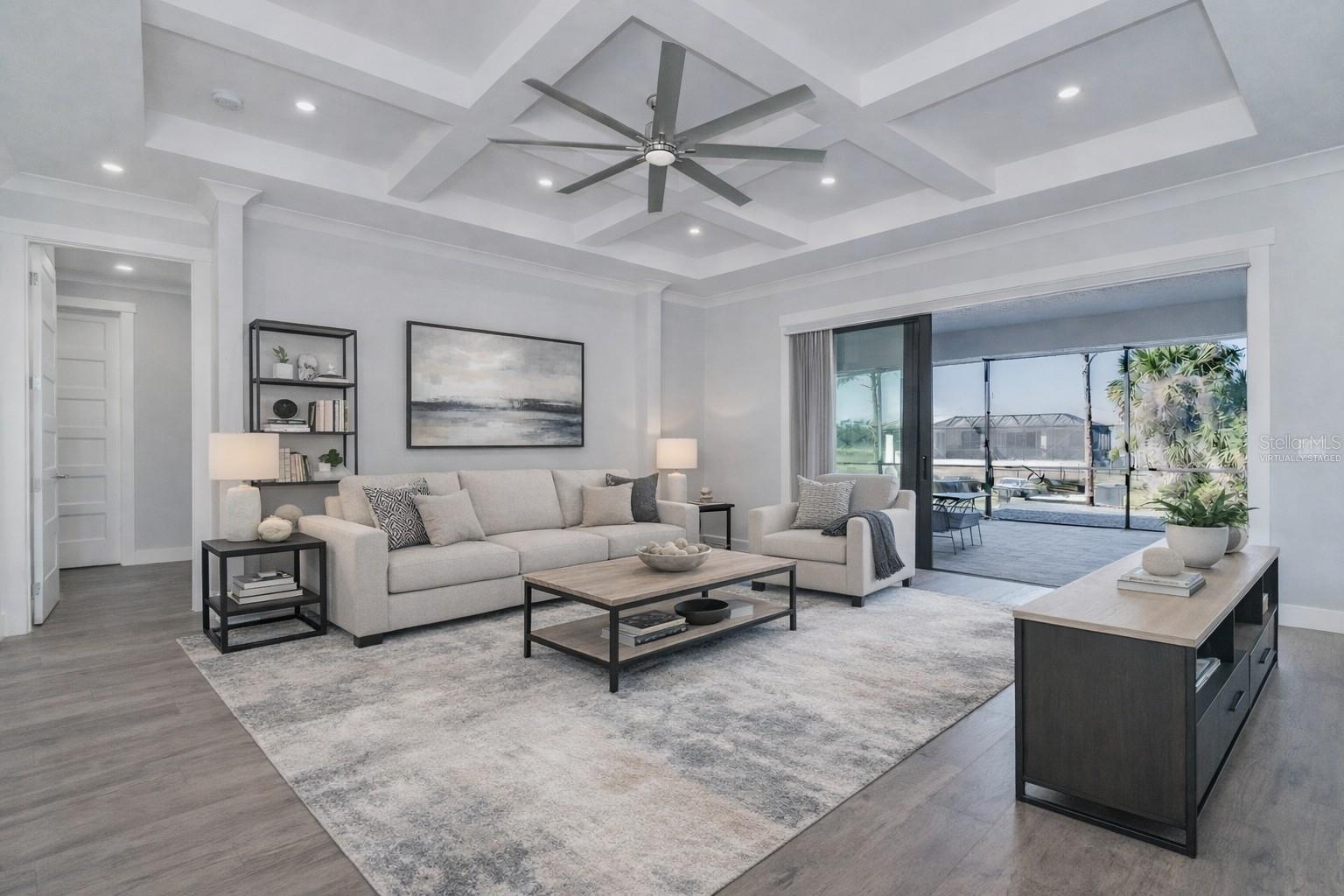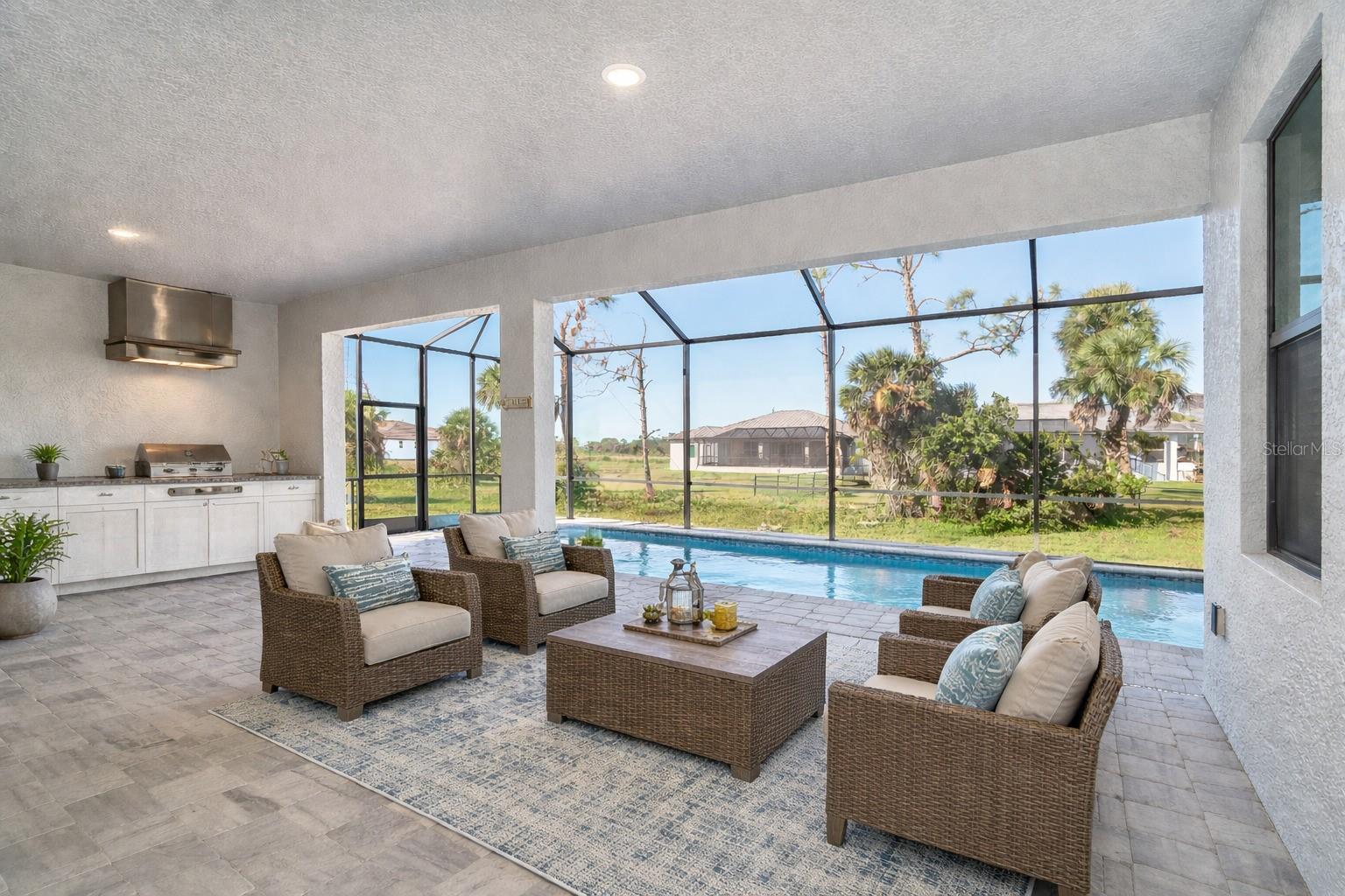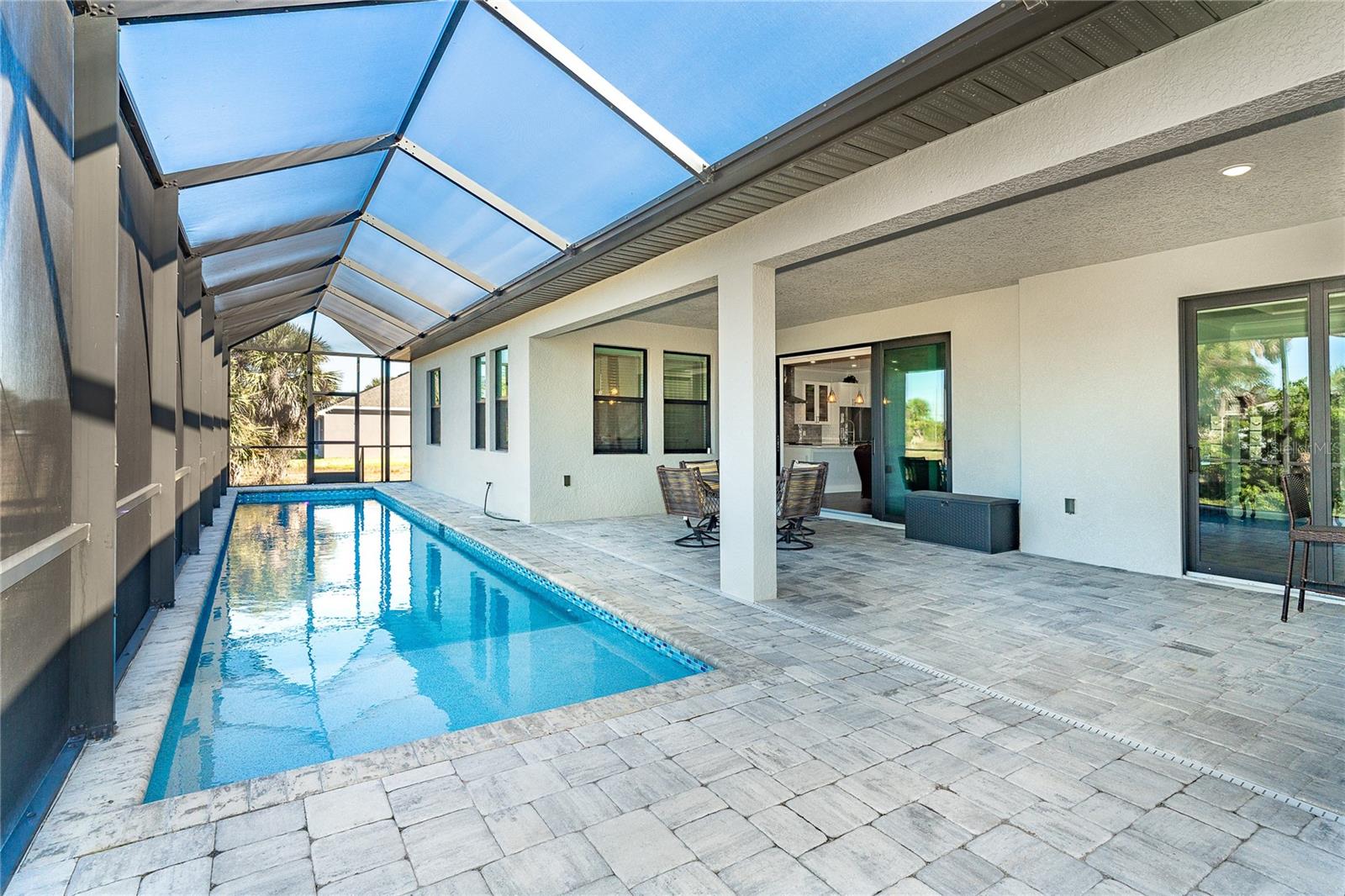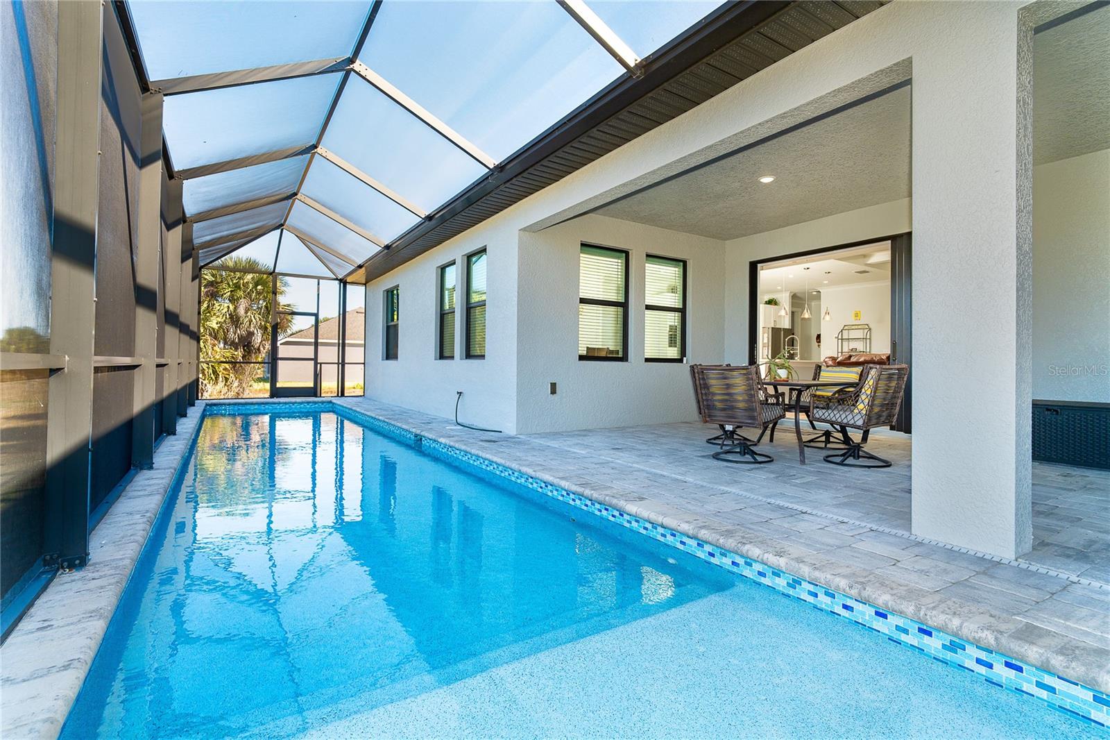 One or more photo(s) has been virtually staged. Prepare to be impressed when you step into your new home! Thoughtfully designed with soaring ceilings, 8-foot Doors, Coffered Ceilings, and Crown Molding throughout. This home offers a refined yet inviting atmosphere filled with natural light. The open-concept living area flows into a Chef's Kitchen featuring a Bertazzoni range and top-of-the-line Bosch appliances, including a Built-in wall oven that also functions as a microwave. The luxurious primary suite is a true retreat, showcasing a spa-inspired bathroom with a stunning walk-in shower and soaking tub. A versatile fourth bedroom with double doors can easily serve as a home office or den. A stylish guest bathroom featuring double sinks is conveniently located between two additional guest bedrooms. Outdoors, enjoy your own private oasis with a spectacular Lap Pool complete with Lighting, Sun Shelf, and pool heater. The oversized screened lanai is the perfect place to spend your evenings relaxing or entertaining. This exceptional home is truly Move-in Ready. Schedule your private showing today.