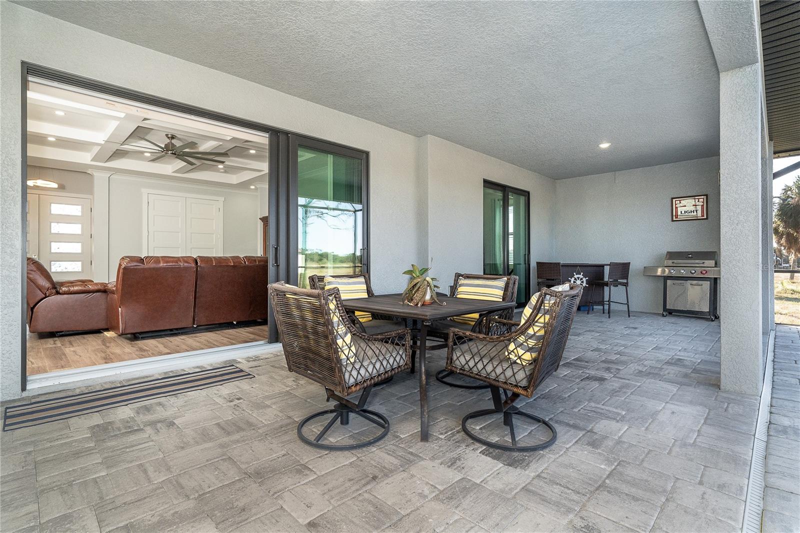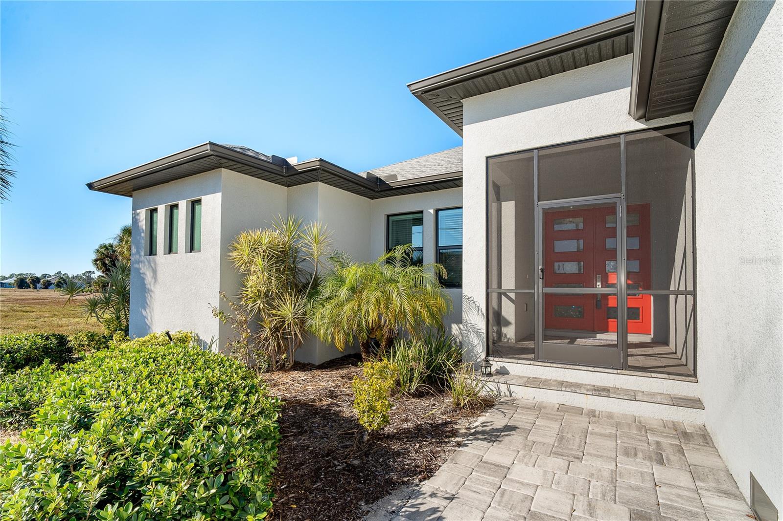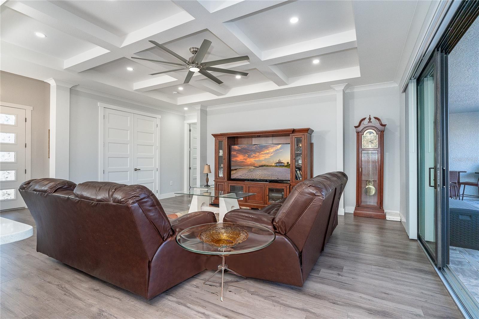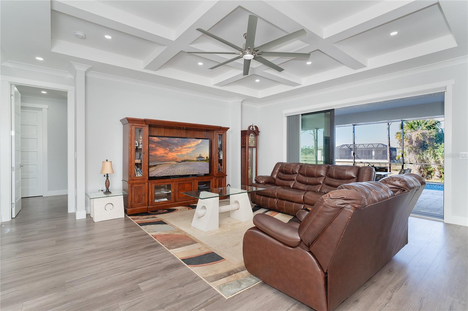 One or more photo(s) has been virtually staged. Prepare to be impressed when you step into your new home! Thoughtfully designed with soaring ceilings, 8-foot Doors, Coffered Ceilings, and Crown Molding throughout. This home offers a refined yet inviting atmosphere filled with natural light. The open-concept living area flows into a Chef's Kitchen featuring a Bertazzoni range and top-of-the-line Bosch appliances, including a Built-in wall oven that also functions as a microwave. The luxurious primary suite is a true retreat, showcasing a spa-inspired bathroom with a stunning walk-in shower and soaking tub. A versatile fourth bedroom with double doors can easily serve as a home office or den. A stylish guest bathroom featuring double sinks is conveniently located between two additional guest bedrooms. Outdoors, enjoy your own private oasis with a spectacular Lap Pool complete with Lighting, Sun Shelf, and pool heater. The oversized screened lanai is the perfect place to spend your evenings relaxing or entertaining. This exceptional home is truly Move-in Ready. Schedule your private showing today.