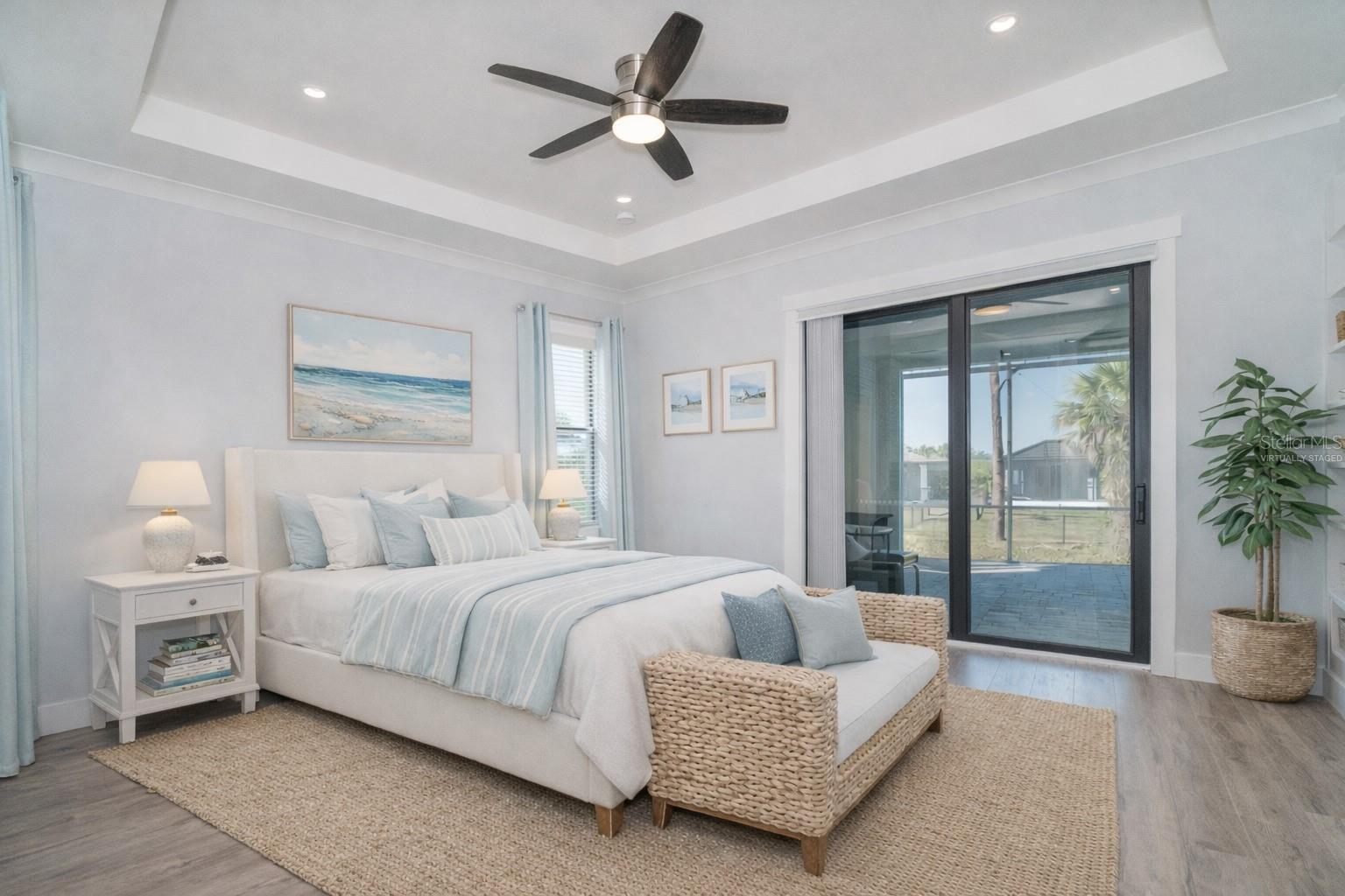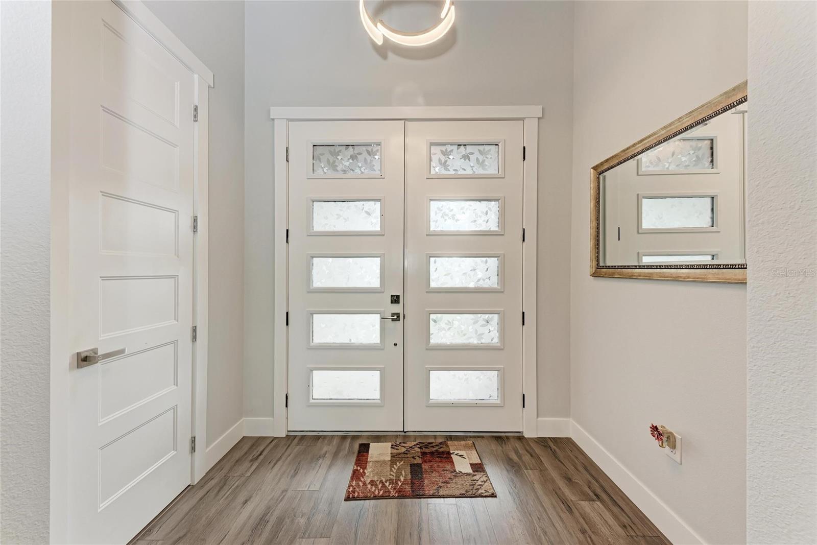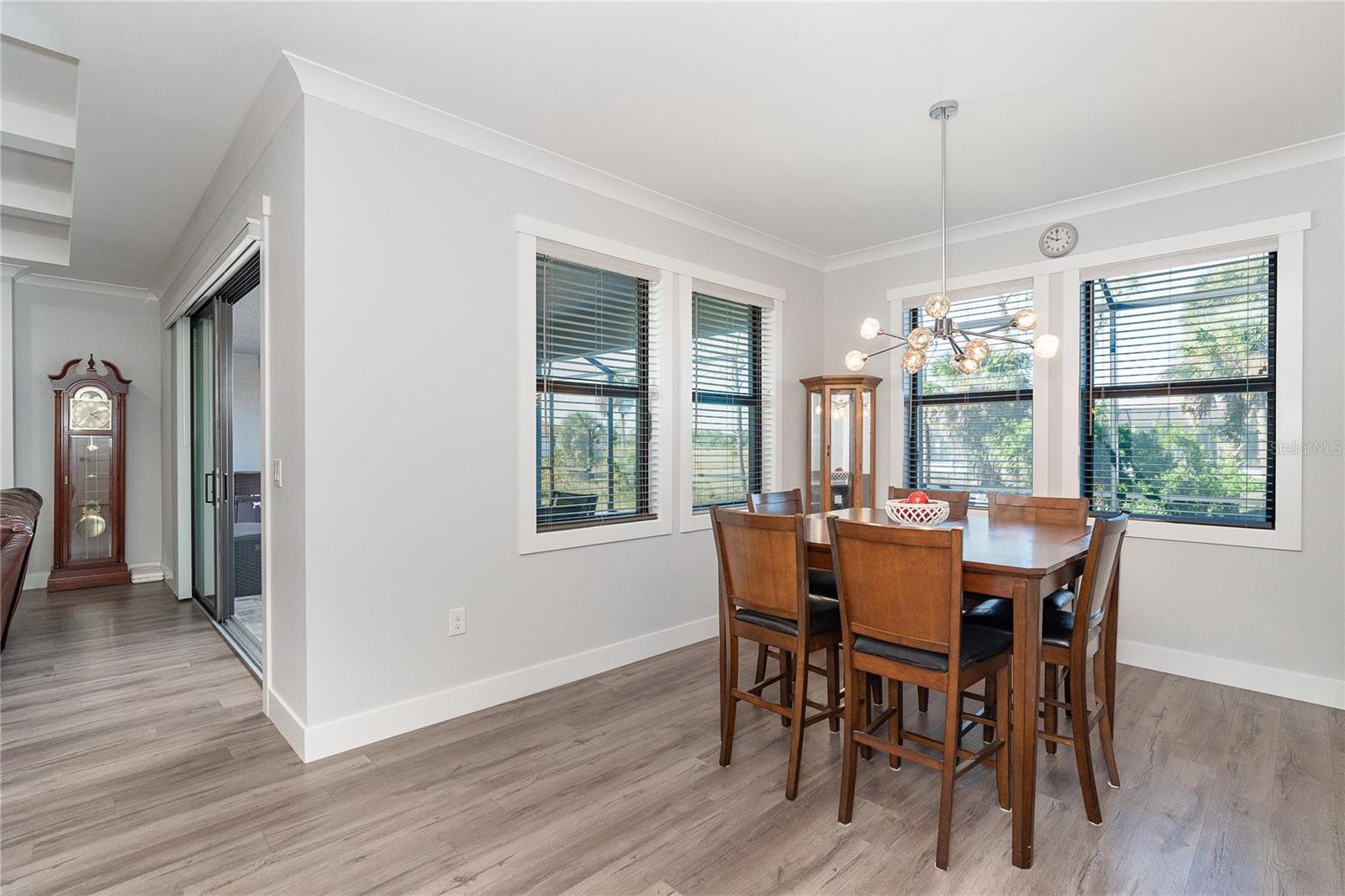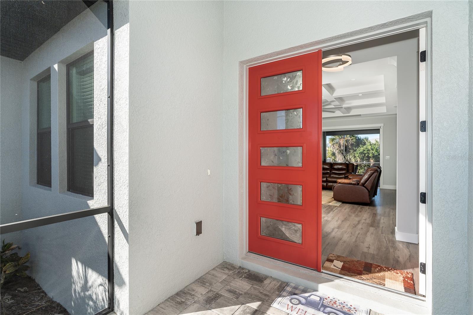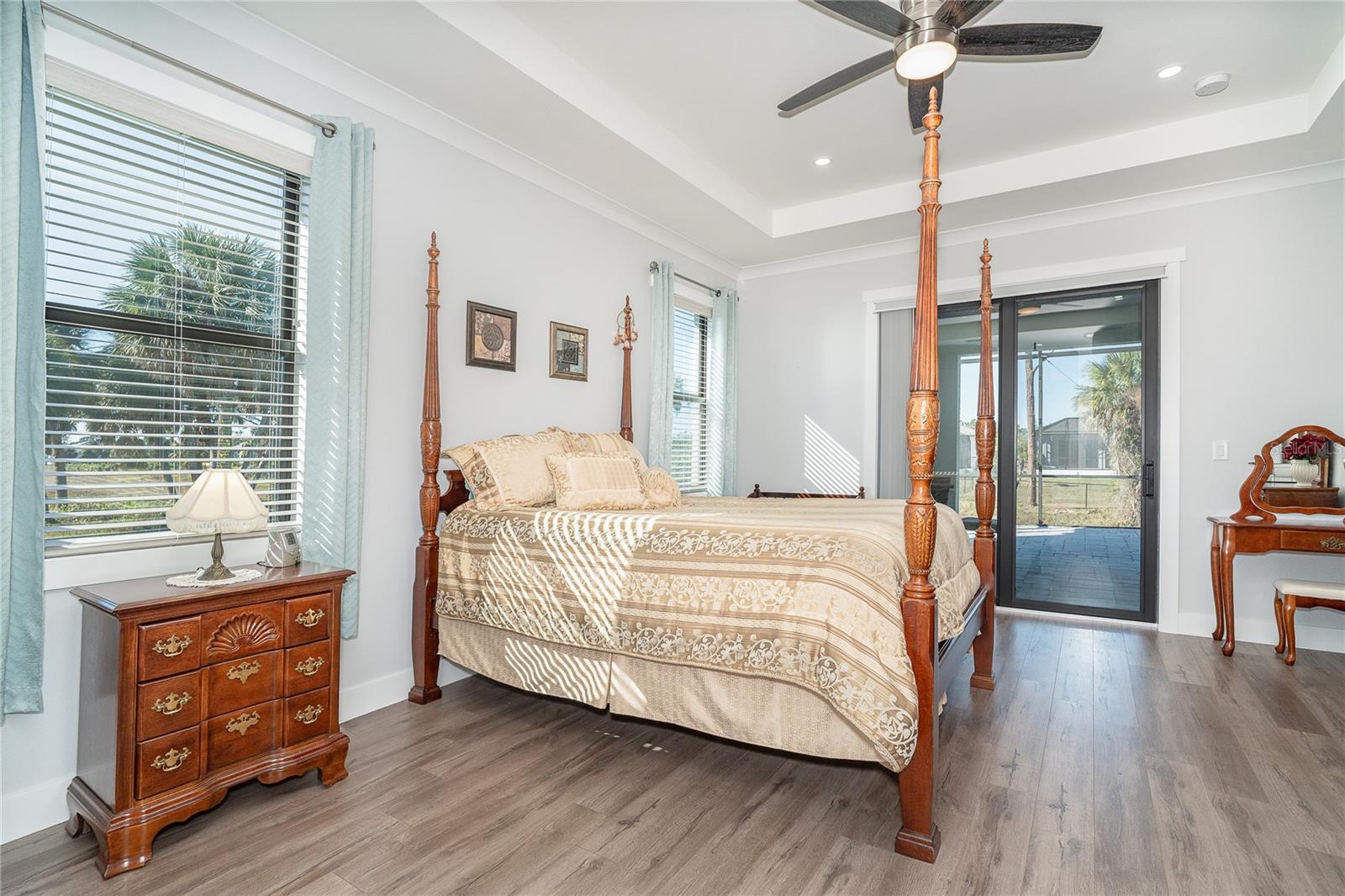 One or more photo(s) has been virtually staged. Prepare to be impressed when you step into your new home! Thoughtfully designed with soaring ceilings, 8-foot Doors, Coffered Ceilings, and Crown Molding throughout. This home offers a refined yet inviting atmosphere filled with natural light. The open-concept living area flows into a Chef's Kitchen featuring a Bertazzoni range and top-of-the-line Bosch appliances, including a Built-in wall oven that also functions as a microwave. The luxurious primary suite is a true retreat, showcasing a spa-inspired bathroom with a stunning walk-in shower and soaking tub. A versatile fourth bedroom with double doors can easily serve as a home office or den. A stylish guest bathroom featuring double sinks is conveniently located between two additional guest bedrooms. Outdoors, enjoy your own private oasis with a spectacular Lap Pool complete with Lighting, Sun Shelf, and pool heater. The oversized screened lanai is the perfect place to spend your evenings relaxing or entertaining. This exceptional home is truly Move-in Ready. Schedule your private showing today.