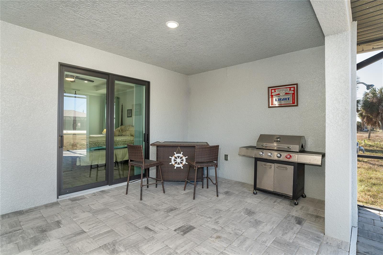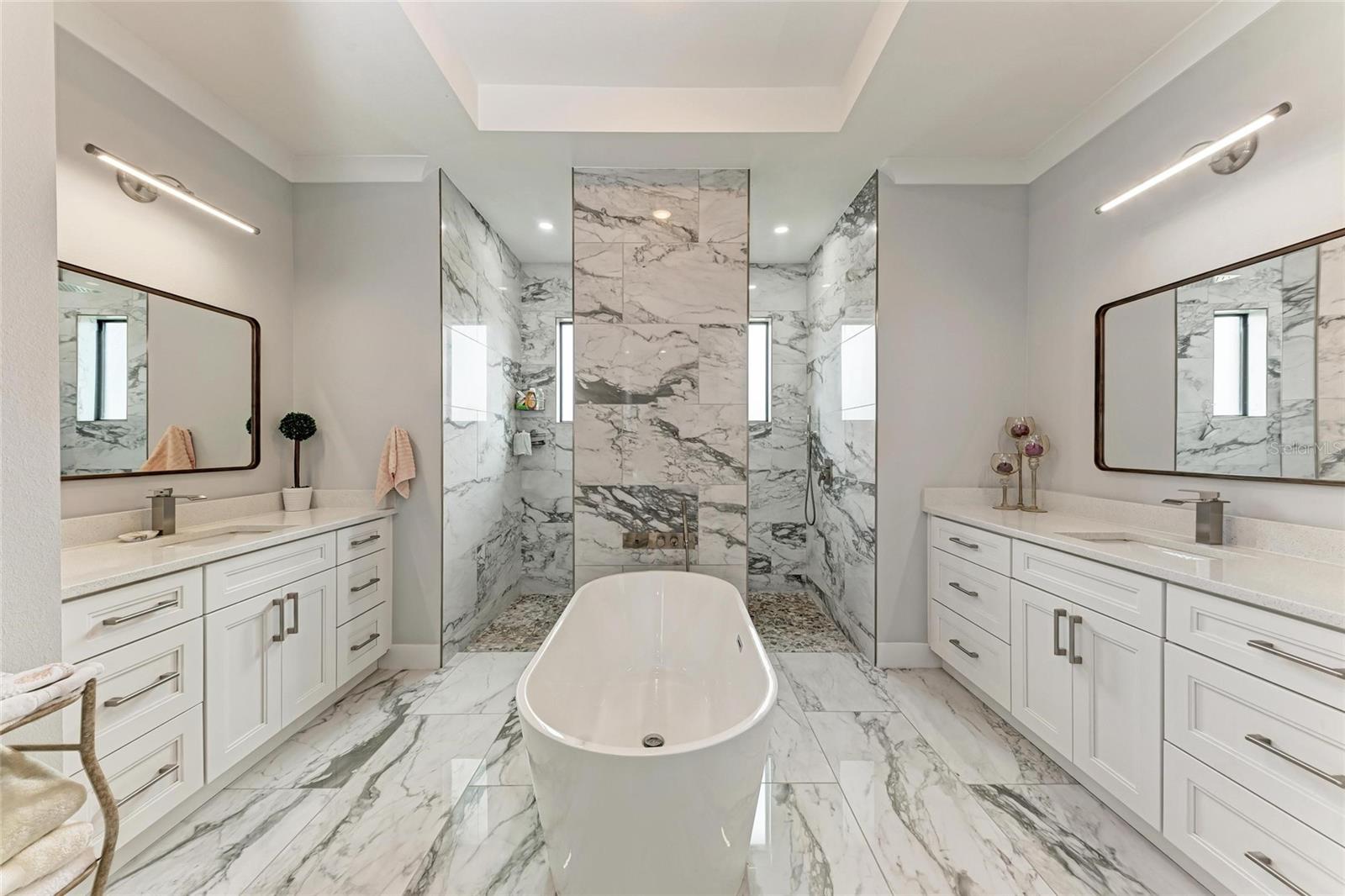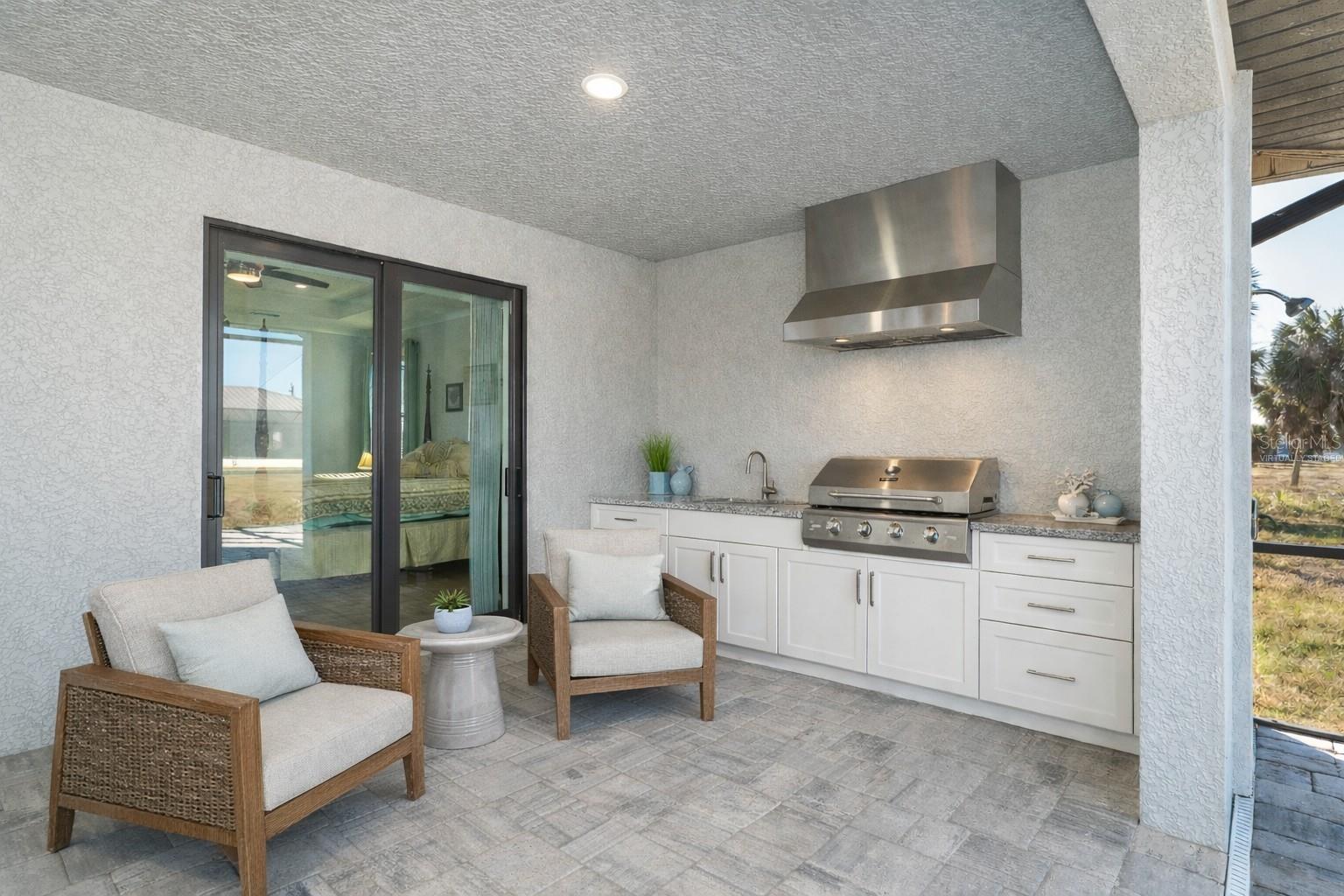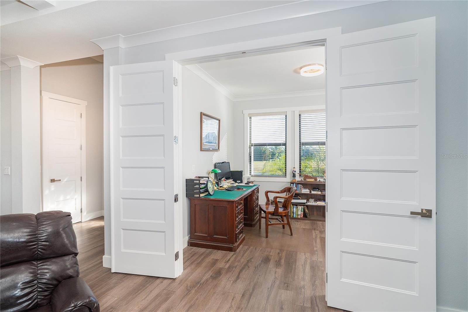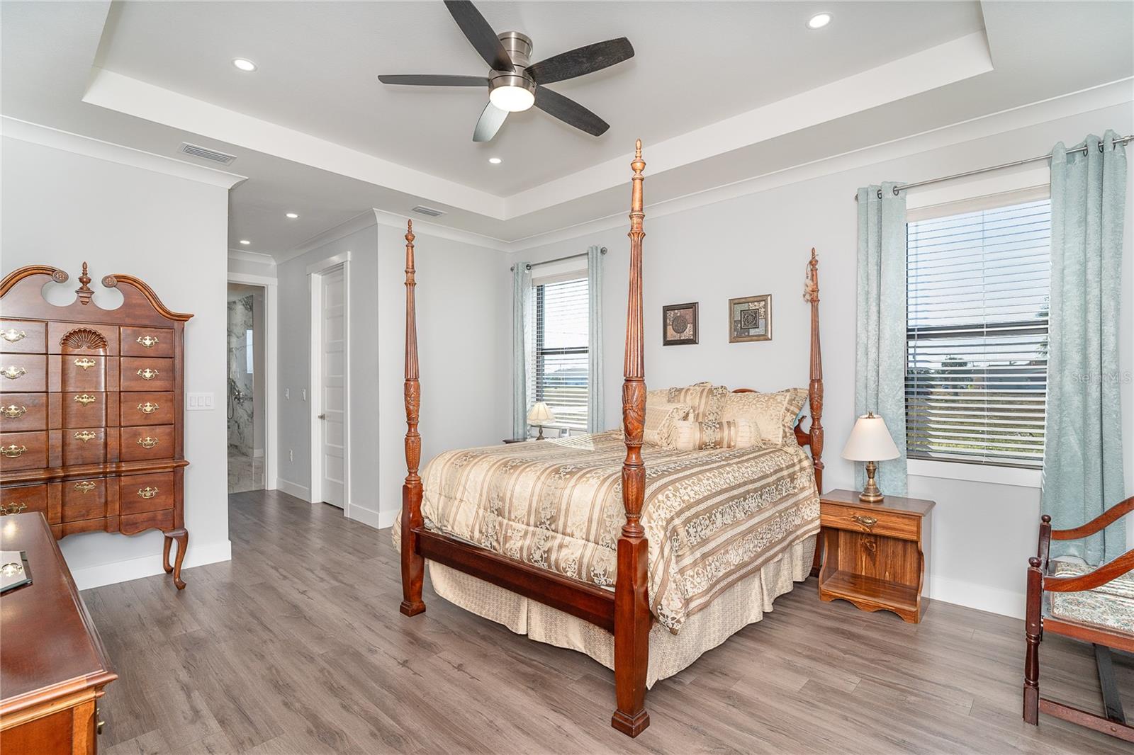 One or more photo(s) has been virtually staged. Prepare to be impressed when you step into your new home! Thoughtfully designed with soaring ceilings, 8-foot Doors, Coffered Ceilings, and Crown Molding throughout. This home offers a refined yet inviting atmosphere filled with natural light. The open-concept living area flows into a Chef's Kitchen featuring a Bertazzoni range and top-of-the-line Bosch appliances, including a Built-in wall oven that also functions as a microwave. The luxurious primary suite is a true retreat, showcasing a spa-inspired bathroom with a stunning walk-in shower and soaking tub. A versatile fourth bedroom with double doors can easily serve as a home office or den. A stylish guest bathroom featuring double sinks is conveniently located between two additional guest bedrooms. Outdoors, enjoy your own private oasis with a spectacular Lap Pool complete with Lighting, Sun Shelf, and pool heater. The oversized screened lanai is the perfect place to spend your evenings relaxing or entertaining. This exceptional home is truly Move-in Ready. Schedule your private showing today.