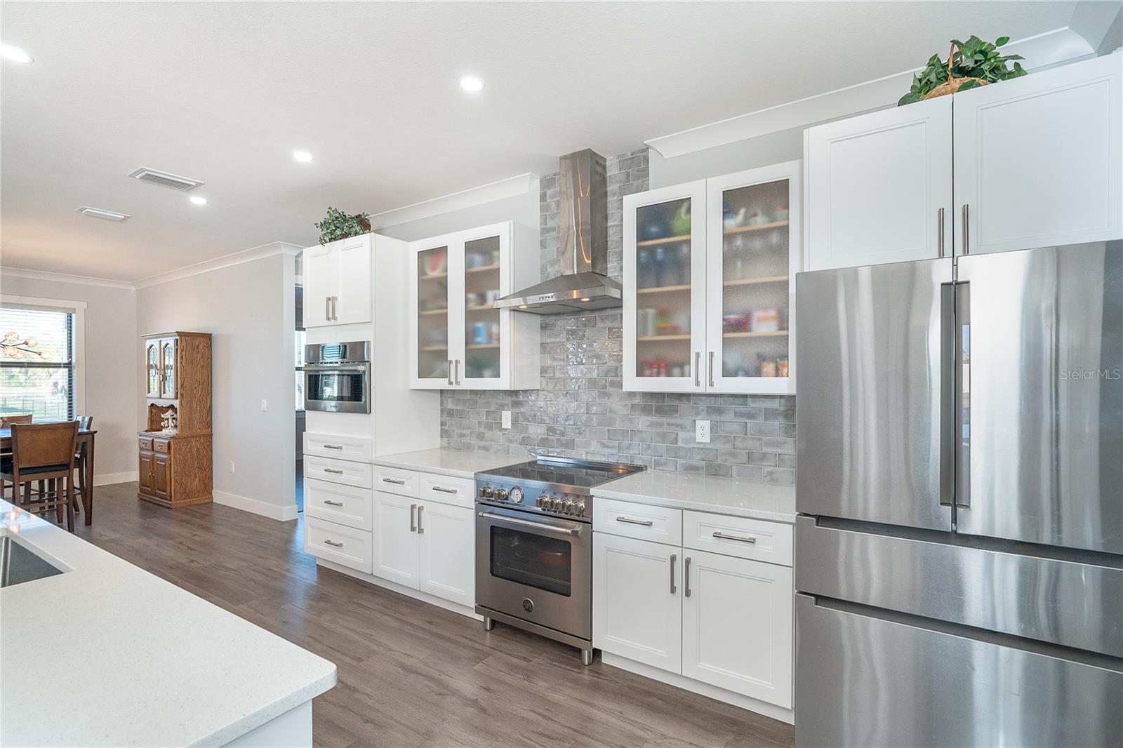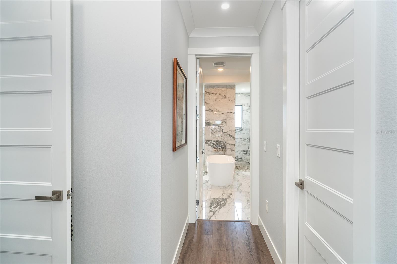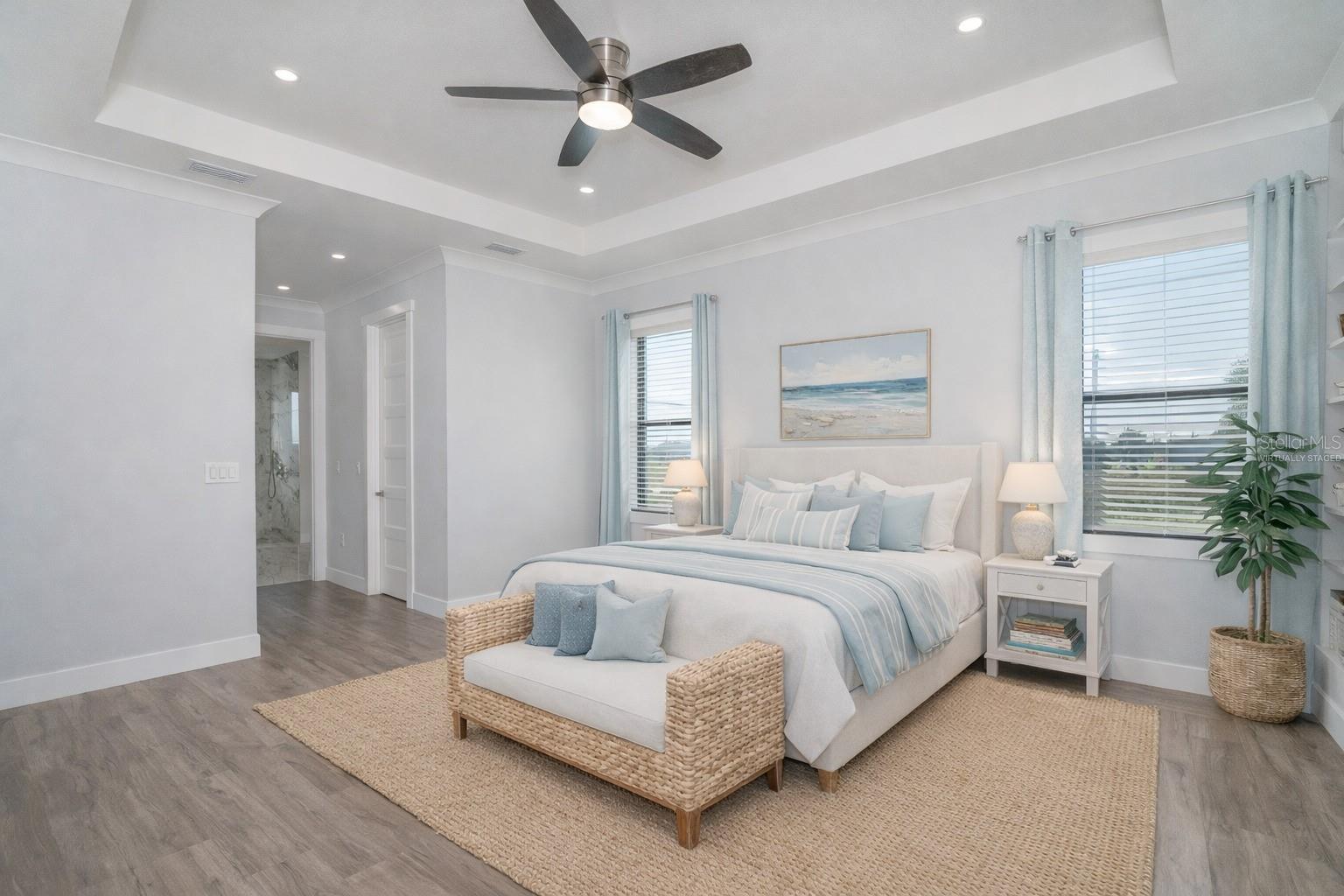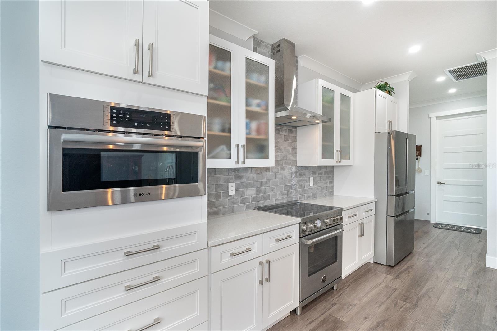 One or more photo(s) has been virtually staged. Prepare to be impressed when you step into your new home! Thoughtfully designed with soaring ceilings, 8-foot Doors, Coffered Ceilings, and Crown Molding throughout. This home offers a refined yet inviting atmosphere filled with natural light. The open-concept living area flows into a Chef's Kitchen featuring a Bertazzoni range and top-of-the-line Bosch appliances, including a Built-in wall oven that also functions as a microwave. The luxurious primary suite is a true retreat, showcasing a spa-inspired bathroom with a stunning walk-in shower and soaking tub. A versatile fourth bedroom with double doors can easily serve as a home office or den. A stylish guest bathroom featuring double sinks is conveniently located between two additional guest bedrooms. Outdoors, enjoy your own private oasis with a spectacular Lap Pool complete with Lighting, Sun Shelf, and pool heater. The oversized screened lanai is the perfect place to spend your evenings relaxing or entertaining. This exceptional home is truly Move-in Ready. Schedule your private showing today.