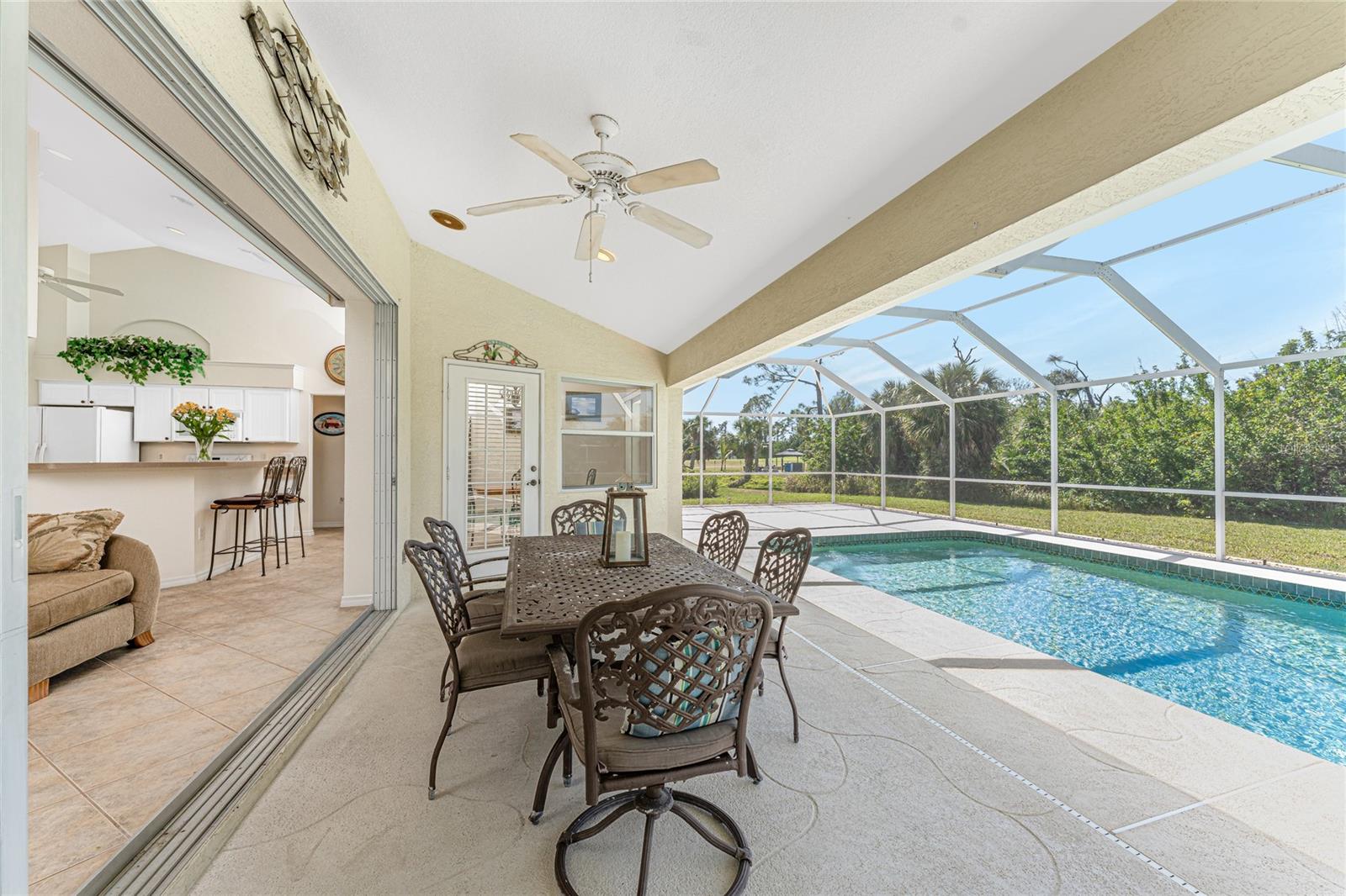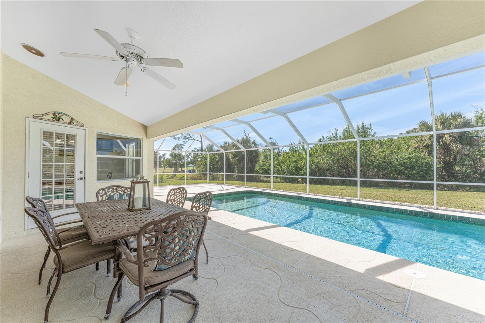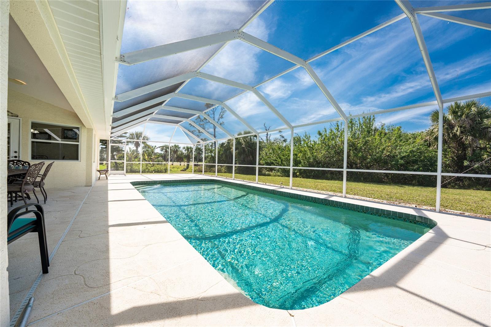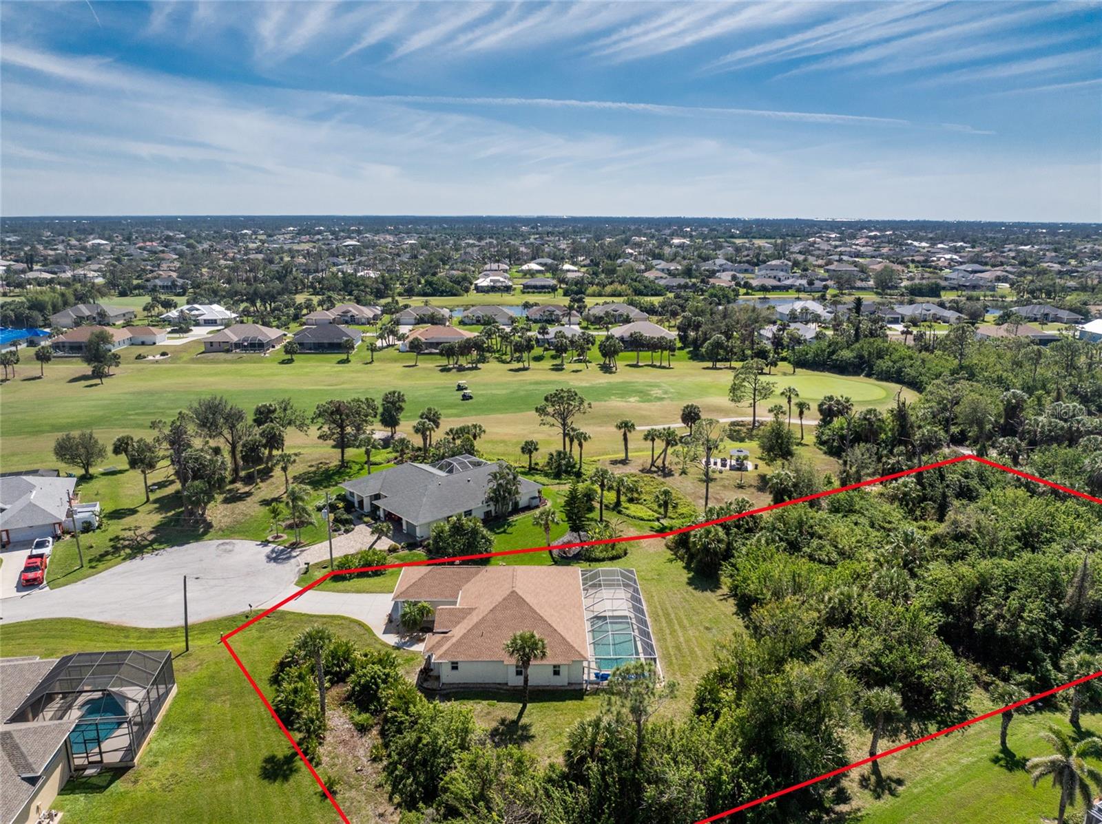 A rare and exceptional opportunity to own nearly an acre in the Long Meadow Section of Rotonda West! This cul-de-sac property offers partial golf course views and includes a unique additional lot bordering the Long Marsh Golf Course. The wooded space enhances privacy and creates a serene setting with uninterrupted views, but also provides the ability to transform it to additional outdoor entertaining space if desired. Step inside this bright and airy three-bedroom, two-bath home, where soaring ceilings and quadruple pocketing sliders welcome you with stunning pool views from the moment you enter. Tile flooring in the main living areas and bathrooms ensures easy maintenance, while the kitchen offers ample white cabinetry, plant shelves, a breakfast bar, and a convenient pocket door leading to the formal dining room. A large window in the breakfast nook overlooks the backyard, and a French door provides direct access to the lanai. The spacious primary suite features dual walk-in closets, a tray ceiling, French doors to the pool, and an expansive ensuite bath with dual vanities, a garden tub, and a walk-in shower. The split-bedroom design ensures privacy, with two additional bedrooms offering reach-in closets and a shared guest bath with a tub-shower combo. A large interior laundry room has a built-in cabinet with utility sink, countertop space and shelving. The outdoor living space includes an oversized pool with a western exposure that invites you to unwind and enjoy breathtaking sunsets with a glass of wine. Additional highlights include a 2023 roof, new pool cage screening (2023), a 2022 water heater, a 2024 garage door opener, and a private well-fed irrigation system. As another added bonus, the Seller's flood insurance policy is transferable! Best of all, this home is being sold turnkey furnished, just pack your bags and move in! Located in deed-restricted Rotonda West, this community offers five golf courses, a clubhouse, tennis, hiking, clubs, and 26 miles of scenic waterways. A short drive takes you to pristine beaches, boating in Lemon Bay and Boca Grande, world-class fishing, shopping, local restaurants, tiki bars, medical facilities and so much more. Don't miss this rare blend of space, privacy, and resort-style living - schedule your private showing today!