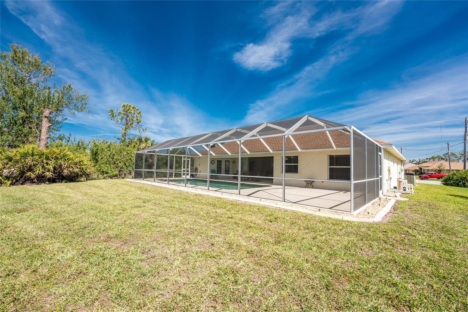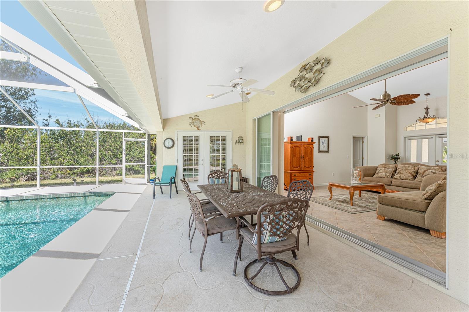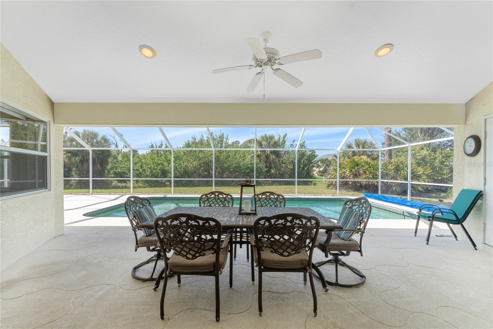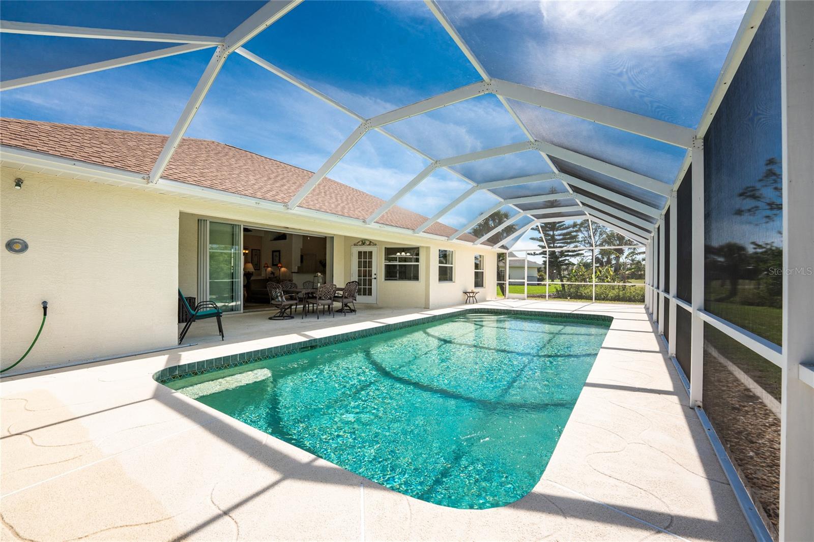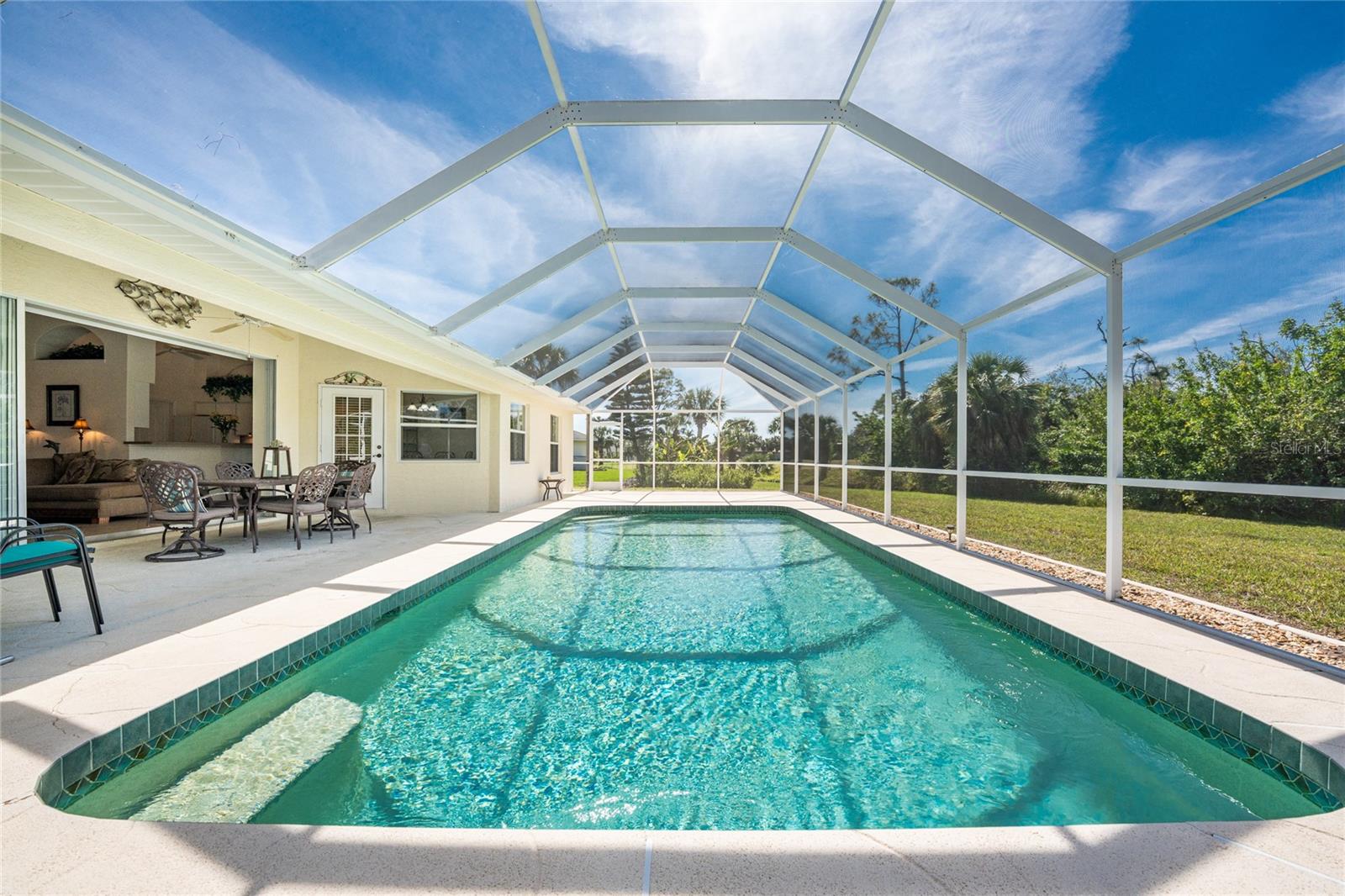 A rare and exceptional opportunity to own nearly an acre in the Long Meadow Section of Rotonda West! This cul-de-sac property offers partial golf course views and includes a unique additional lot bordering the Long Marsh Golf Course. The wooded space enhances privacy and creates a serene setting with uninterrupted views, but also provides the ability to transform it to additional outdoor entertaining space if desired. Step inside this bright and airy three-bedroom, two-bath home, where soaring ceilings and quadruple pocketing sliders welcome you with stunning pool views from the moment you enter. Tile flooring in the main living areas and bathrooms ensures easy maintenance, while the kitchen offers ample white cabinetry, plant shelves, a breakfast bar, and a convenient pocket door leading to the formal dining room. A large window in the breakfast nook overlooks the backyard, and a French door provides direct access to the lanai. The spacious primary suite features dual walk-in closets, a tray ceiling, French doors to the pool, and an expansive ensuite bath with dual vanities, a garden tub, and a walk-in shower. The split-bedroom design ensures privacy, with two additional bedrooms offering reach-in closets and a shared guest bath with a tub-shower combo. A large interior laundry room has a built-in cabinet with utility sink, countertop space and shelving. The outdoor living space includes an oversized pool with a western exposure that invites you to unwind and enjoy breathtaking sunsets with a glass of wine. Additional highlights include a 2023 roof, new pool cage screening (2023), a 2022 water heater, a 2024 garage door opener, and a private well-fed irrigation system. As another added bonus, the Seller's flood insurance policy is transferable! Best of all, this home is being sold turnkey furnished, just pack your bags and move in! Located in deed-restricted Rotonda West, this community offers five golf courses, a clubhouse, tennis, hiking, clubs, and 26 miles of scenic waterways. A short drive takes you to pristine beaches, boating in Lemon Bay and Boca Grande, world-class fishing, shopping, local restaurants, tiki bars, medical facilities and so much more. Don't miss this rare blend of space, privacy, and resort-style living - schedule your private showing today!