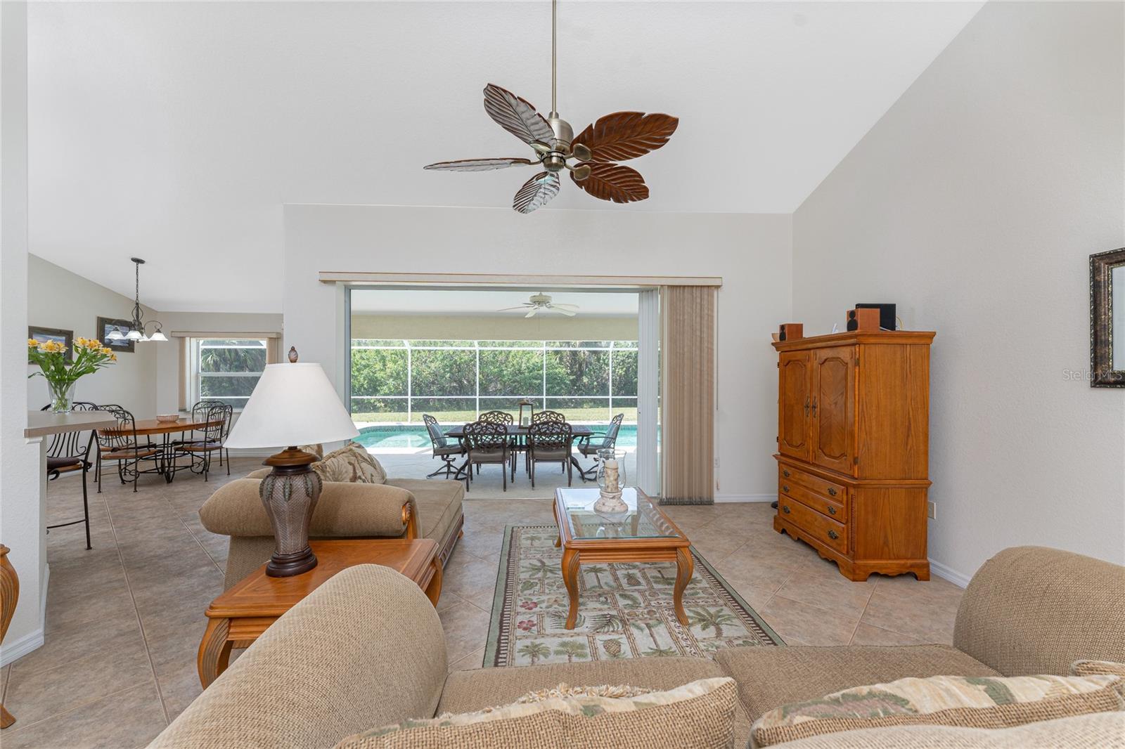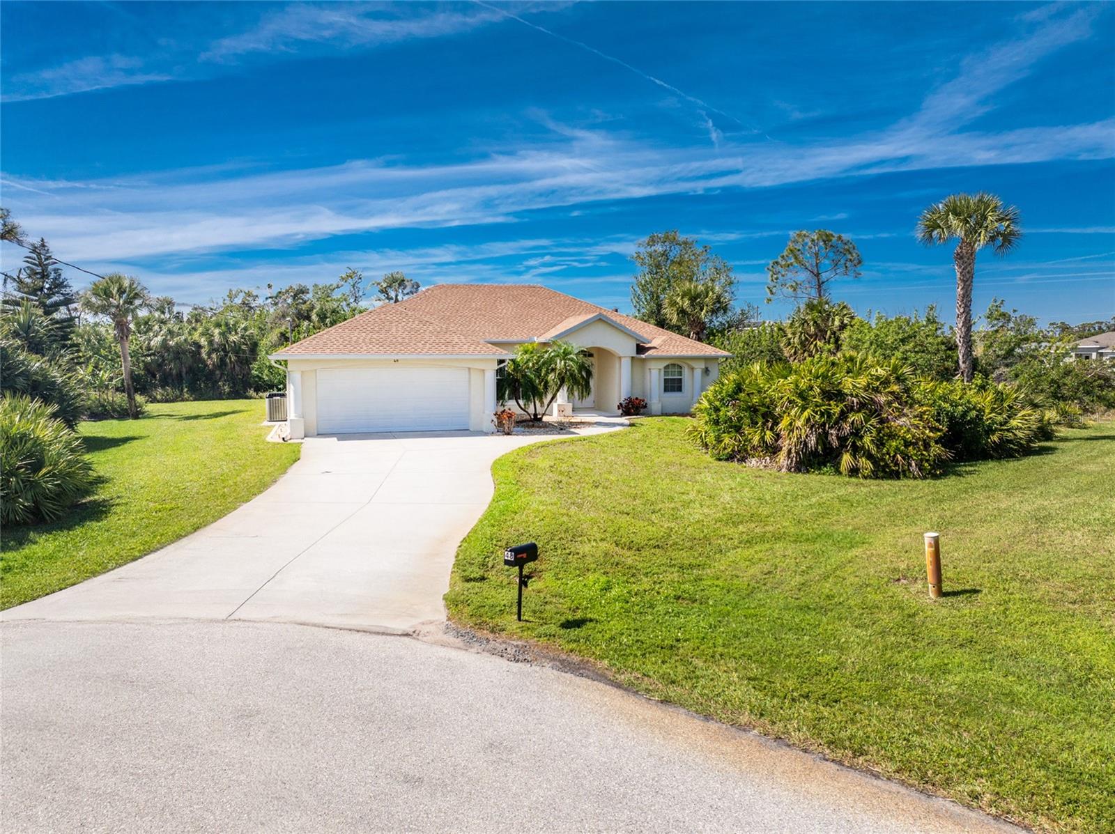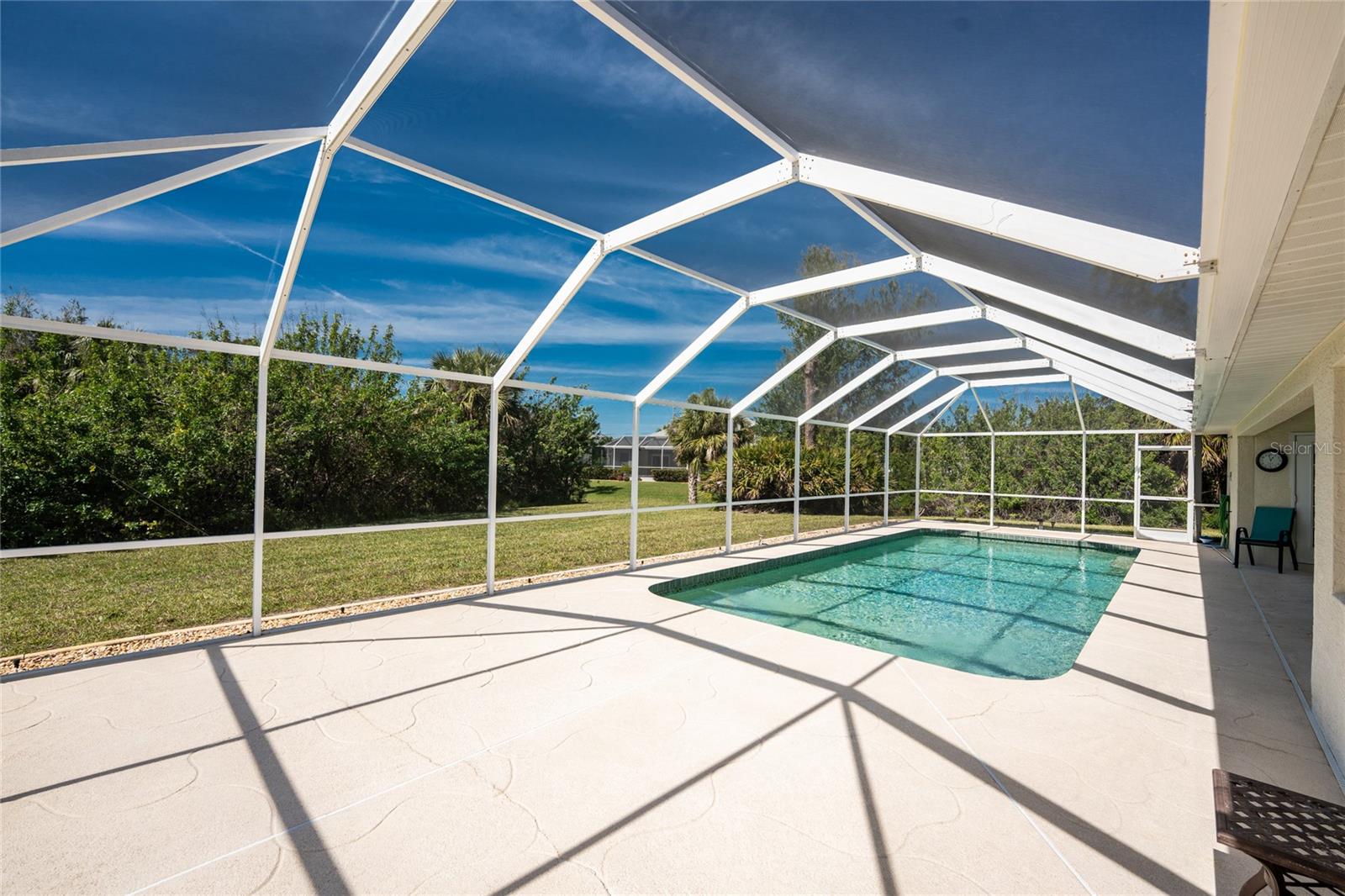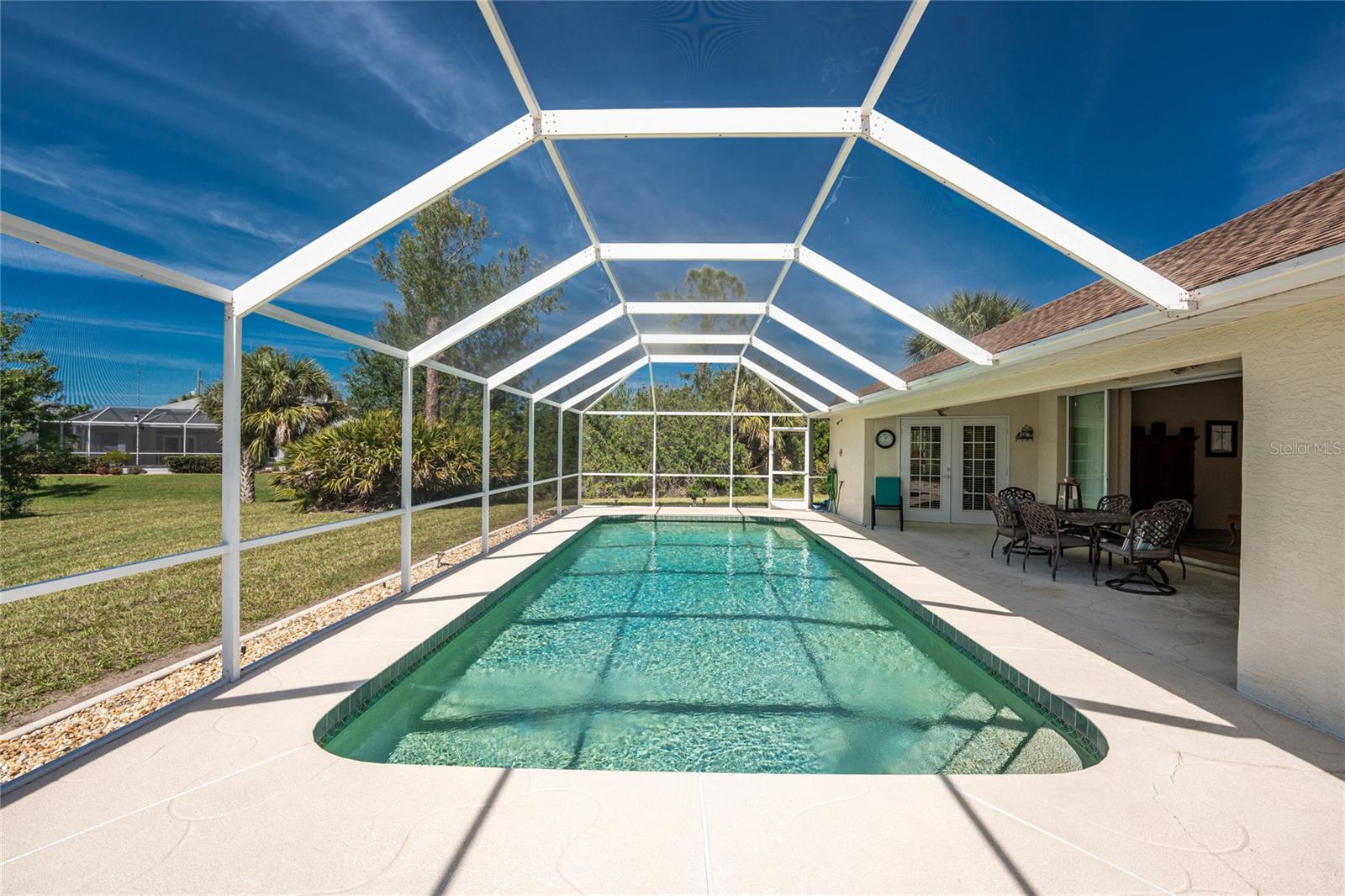 A rare and exceptional opportunity to own nearly an acre in the Long Meadow Section of Rotonda West! This cul-de-sac property offers partial golf course views and includes a unique additional lot bordering the Long Marsh Golf Course. The wooded space enhances privacy and creates a serene setting with uninterrupted views, but also provides the ability to transform it to additional outdoor entertaining space if desired. Step inside this bright and airy three-bedroom, two-bath home, where soaring ceilings and quadruple pocketing sliders welcome you with stunning pool views from the moment you enter. Tile flooring in the main living areas and bathrooms ensures easy maintenance, while the kitchen offers ample white cabinetry, plant shelves, a breakfast bar, and a convenient pocket door leading to the formal dining room. A large window in the breakfast nook overlooks the backyard, and a French door provides direct access to the lanai. The spacious primary suite features dual walk-in closets, a tray ceiling, French doors to the pool, and an expansive ensuite bath with dual vanities, a garden tub, and a walk-in shower. The split-bedroom design ensures privacy, with two additional bedrooms offering reach-in closets and a shared guest bath with a tub-shower combo. A large interior laundry room has a built-in cabinet with utility sink, countertop space and shelving. The outdoor living space includes an oversized pool with a western exposure that invites you to unwind and enjoy breathtaking sunsets with a glass of wine. Additional highlights include a 2023 roof, new pool cage screening (2023), a 2022 water heater, a 2024 garage door opener, and a private well-fed irrigation system. As another added bonus, the Seller's flood insurance policy is transferable! Best of all, this home is being sold turnkey furnished, just pack your bags and move in! Located in deed-restricted Rotonda West, this community offers five golf courses, a clubhouse, tennis, hiking, clubs, and 26 miles of scenic waterways. A short drive takes you to pristine beaches, boating in Lemon Bay and Boca Grande, world-class fishing, shopping, local restaurants, tiki bars, medical facilities and so much more. Don't miss this rare blend of space, privacy, and resort-style living - schedule your private showing today!