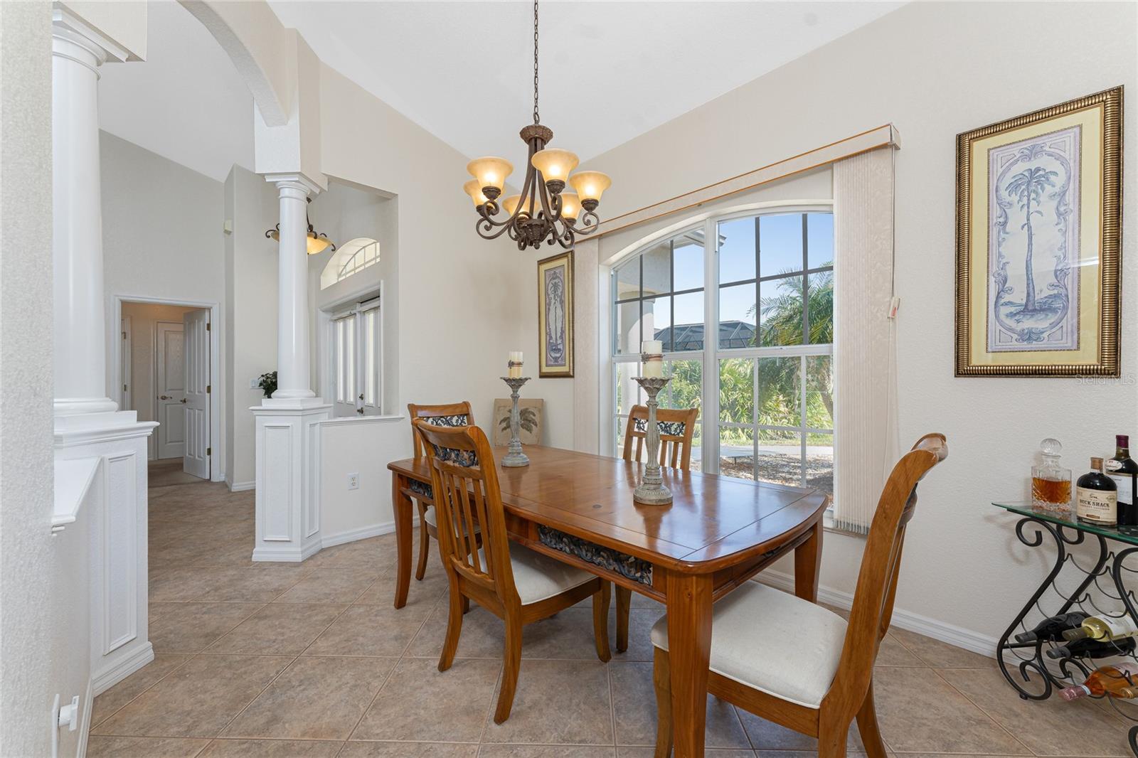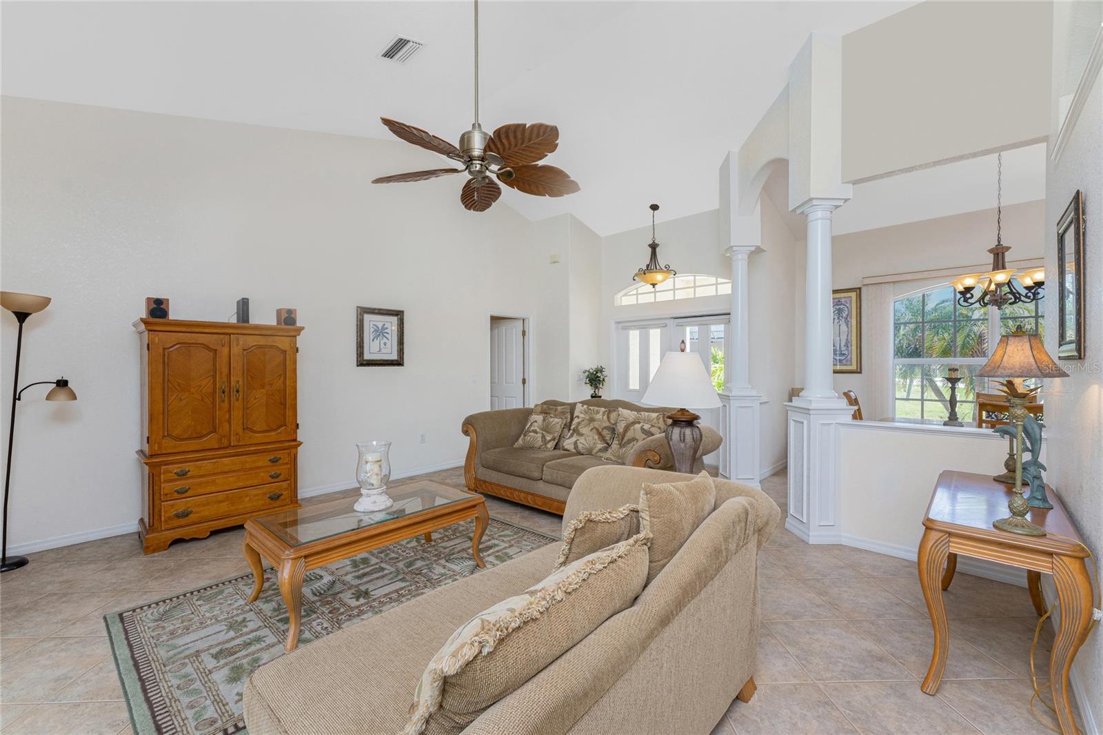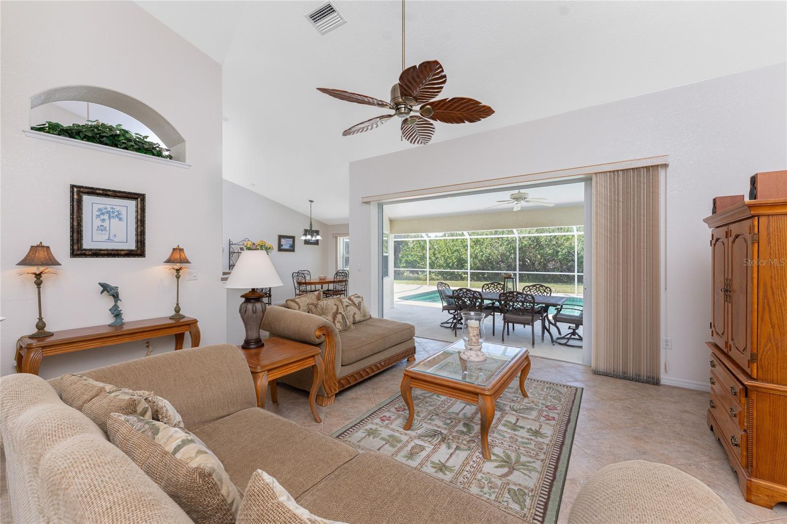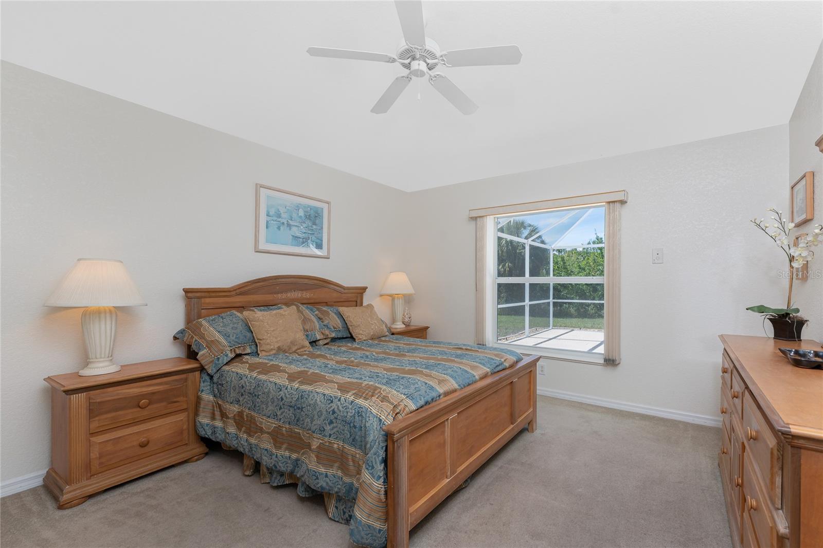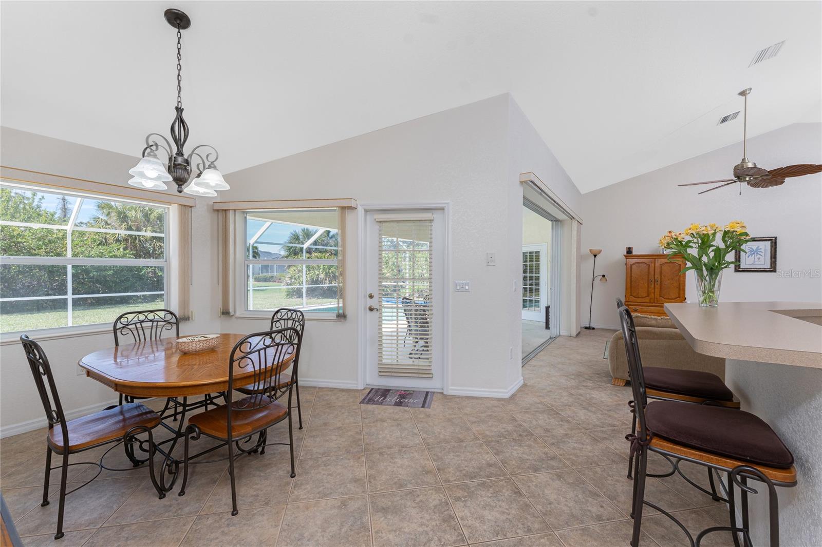 A rare and exceptional opportunity to own nearly an acre in the Long Meadow Section of Rotonda West! This cul-de-sac property offers partial golf course views and includes a unique additional lot bordering the Long Marsh Golf Course. The wooded space enhances privacy and creates a serene setting with uninterrupted views, but also provides the ability to transform it to additional outdoor entertaining space if desired. Step inside this bright and airy three-bedroom, two-bath home, where soaring ceilings and quadruple pocketing sliders welcome you with stunning pool views from the moment you enter. Tile flooring in the main living areas and bathrooms ensures easy maintenance, while the kitchen offers ample white cabinetry, plant shelves, a breakfast bar, and a convenient pocket door leading to the formal dining room. A large window in the breakfast nook overlooks the backyard, and a French door provides direct access to the lanai. The spacious primary suite features dual walk-in closets, a tray ceiling, French doors to the pool, and an expansive ensuite bath with dual vanities, a garden tub, and a walk-in shower. The split-bedroom design ensures privacy, with two additional bedrooms offering reach-in closets and a shared guest bath with a tub-shower combo. A large interior laundry room has a built-in cabinet with utility sink, countertop space and shelving. The outdoor living space includes an oversized pool with a western exposure that invites you to unwind and enjoy breathtaking sunsets with a glass of wine. Additional highlights include a 2023 roof, new pool cage screening (2023), a 2022 water heater, a 2024 garage door opener, and a private well-fed irrigation system. As another added bonus, the Seller's flood insurance policy is transferable! Best of all, this home is being sold turnkey furnished, just pack your bags and move in! Located in deed-restricted Rotonda West, this community offers five golf courses, a clubhouse, tennis, hiking, clubs, and 26 miles of scenic waterways. A short drive takes you to pristine beaches, boating in Lemon Bay and Boca Grande, world-class fishing, shopping, local restaurants, tiki bars, medical facilities and so much more. Don't miss this rare blend of space, privacy, and resort-style living - schedule your private showing today!