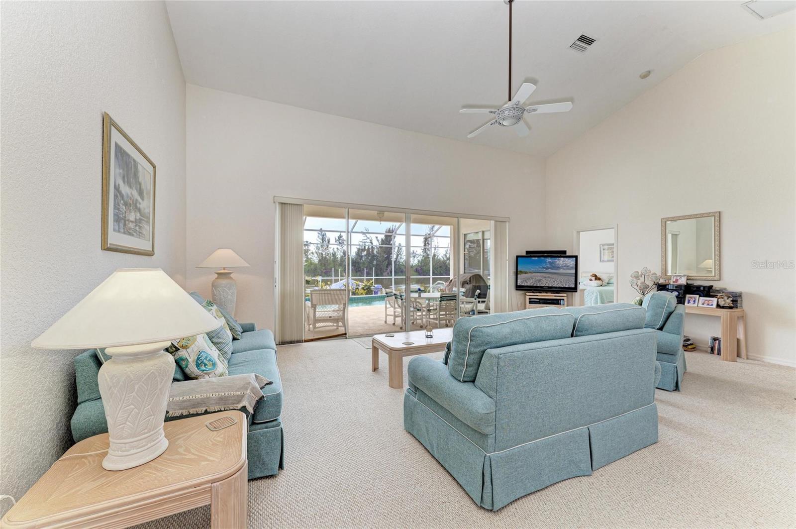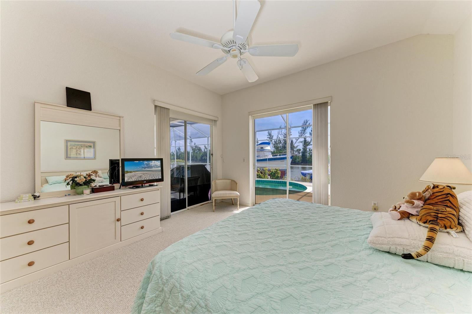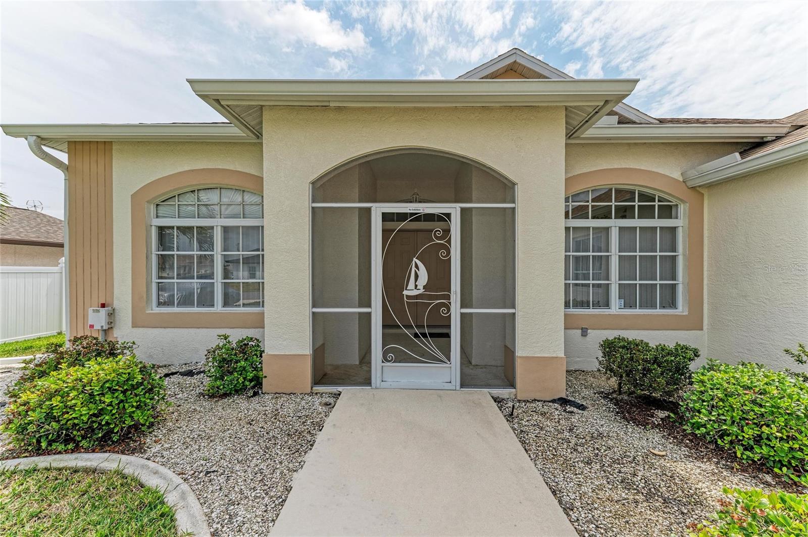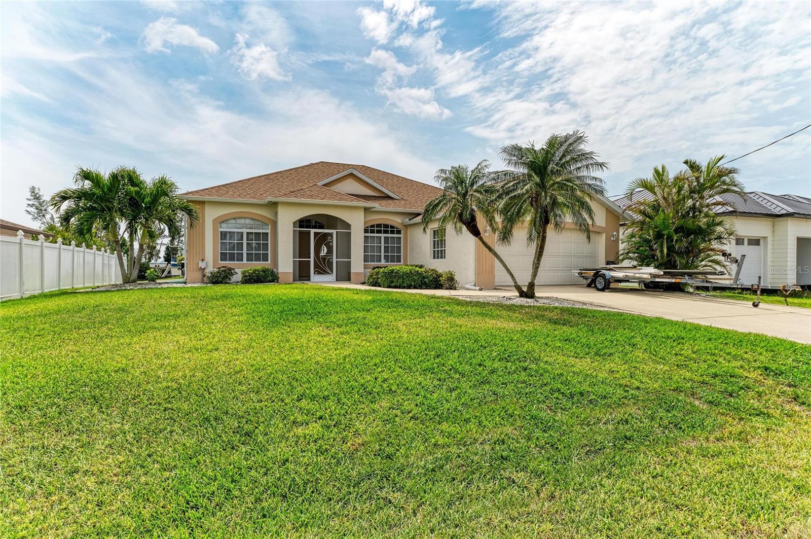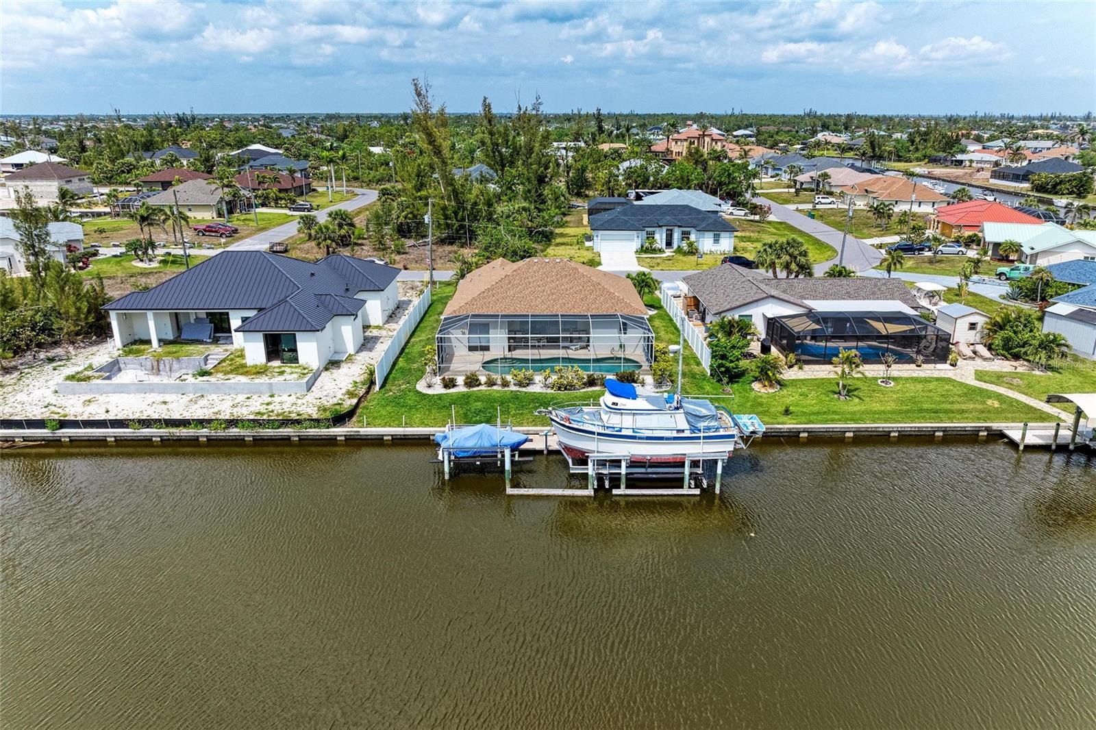 This waterfront home offers breathtaking, unobstructed views across the serene Santa Cruz Canal to a designated preserve area, ensuring privacy and tranquility. Abutting sailboat waters, this property provides the ideal setting for waterfront living.Upon arriving, you're greeted by a pristine white vinyl fence that runs from the front down both sides of the home, leading to the spacious lanai. Step through double doors into a tiled entryway, where natural light pours in through the transom above, illuminating the soaring cathedral ceiling. The expansive open floor plan flows seamlessly between the kitchen, dinette, and great room, creating an inviting and airy space perfect for both everyday living and entertaining.The kitchen-dinette combo features rectangular tile floors, a convenient pantry, breakfast bar, and all essential appliances. The adjacent great room is carpeted and opens up through sliders, inviting in fresh air and sunlight, enhancing the light, bright ambiance of the home.For privacy, two guest bedrooms are tucked away behind a pocket door, creating a quiet retreat. One of these rooms boasts an ensuite bath with a shower stall, single vanity, and serves as the pool bath with convenient access from the lanai. The second guest bath, located in the hallway, features a single vanity and a combo tub/shower unit.The spacious primary bedroom, located on the opposite side of the home, is a private sanctuary with two sets of sliders leading directly to the lanai and pool area. The suite also offers his-and-her walk-in closets and an ensuite bath with a double vanity, separate tub, and shower, all accented with wall to wall carpet.Step outside to discover your own private oasis--an oversized heated pool (approximately 36' x 12') with a cool deck that promises comfort underfoot. The lanai (22' x 11') and pool area are screened, ensuring peaceful enjoyment of the beautiful views and refreshing breezes.At water's edge, a two-tiered dock (26' x 6') with dual boat lifts (40K lbs & 6K lbs) awaits your watercraft, making this home a true boater's dream. The canal waters also flow through the property's sprinkler system, keeping your landscaping lush and vibrant year-round.Recent upgrades include a new pool pump, irrigation pump, and water heater all replaced in 2025, and a new roof installed in 2022. With several airports in southwest Florida nearby, as well as a wealth of dining, hiking and biking trails, and Gulf Coast beaches, this location provides both convenience and recreation. The area is renowned for world-class tarpon fishing and abundant outdoor activities.This is a great opportunity to own a waterfront property that blends comfort and privacy with nature's beauty. Bring your vision to life and start living the waterfront lifestyle you deserve.