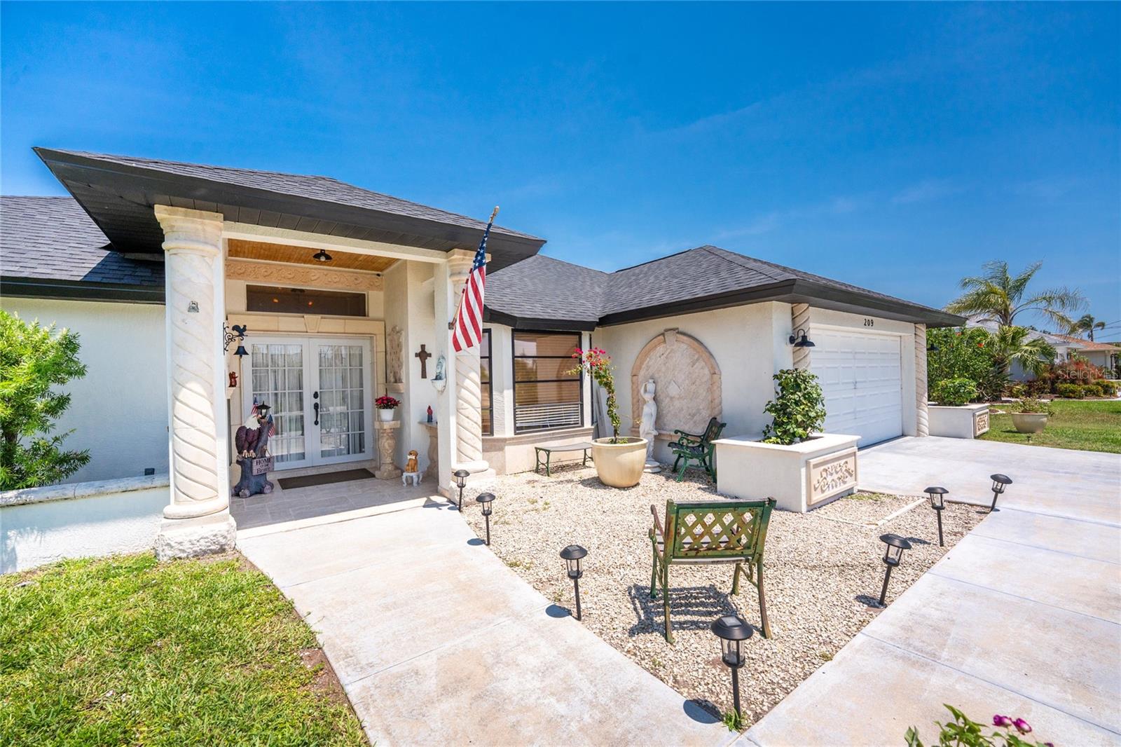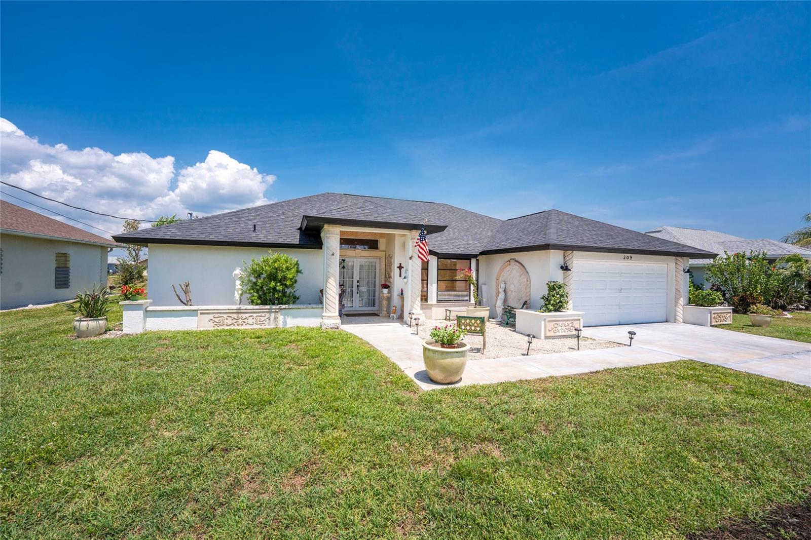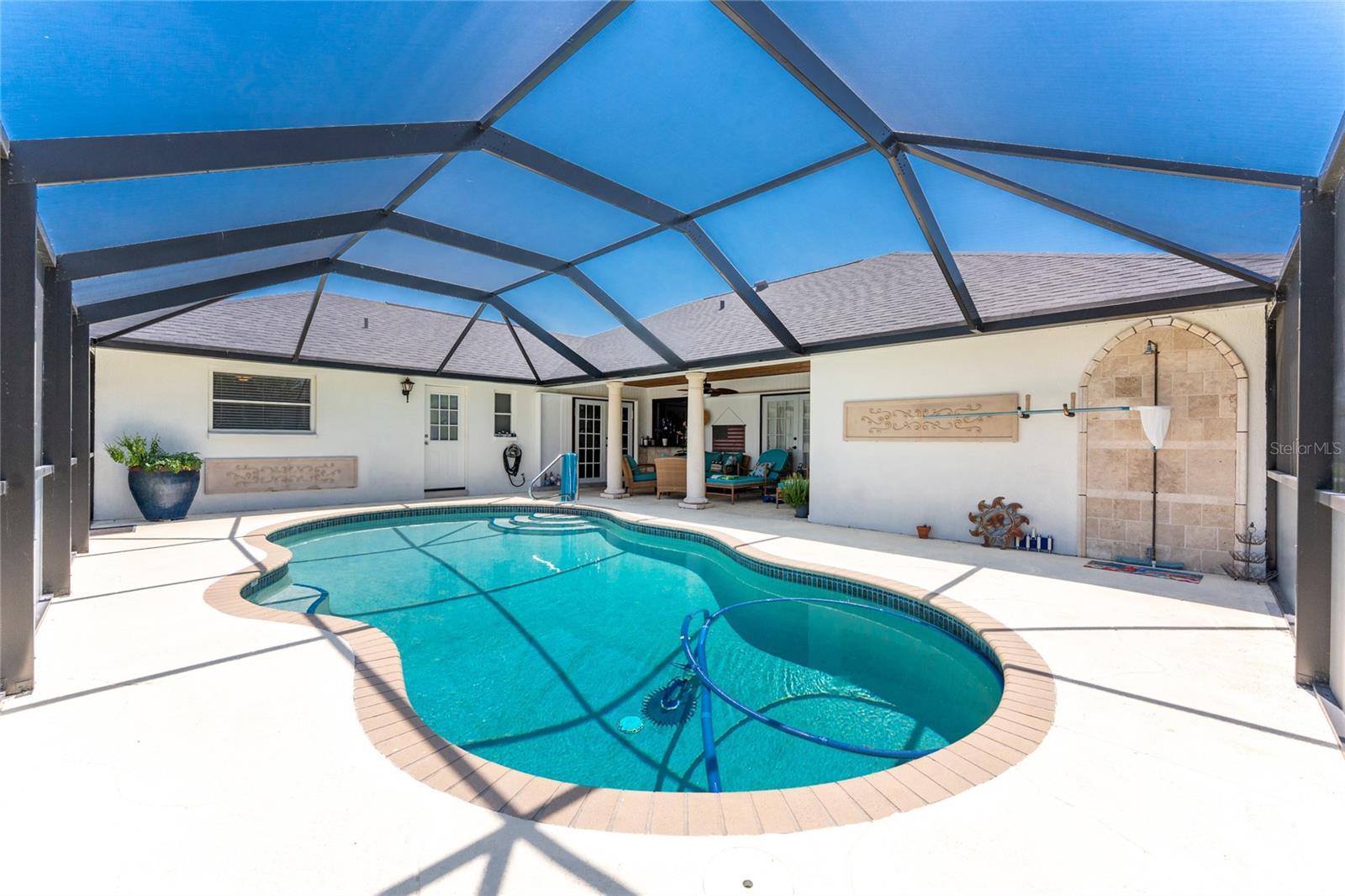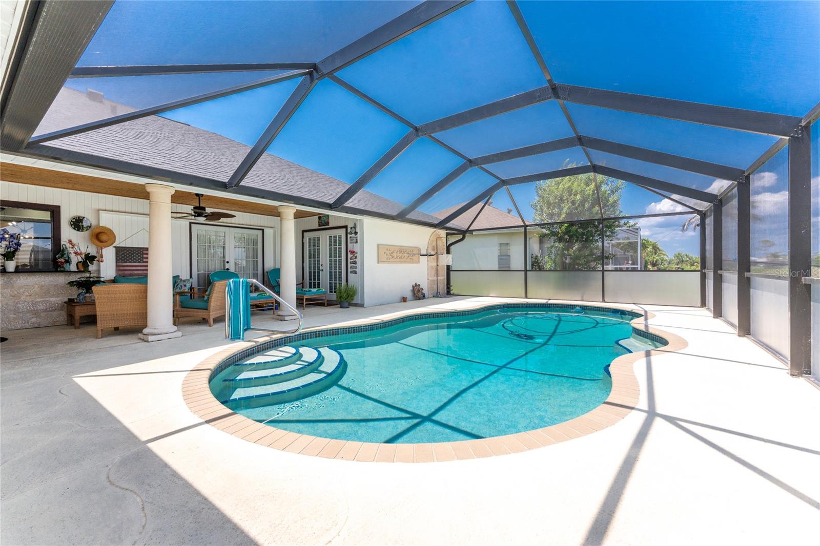 IMMACULATE & FULLY UPDATED, turnkey furnished, waterfront home located in the desirable deed restricted community of Rotonda West. Within the last year, the home has been re-pipped, new pool cage with lower panels featuring privacy screening, new electrical panel, exterior of the home was painted, new gutters on front and side of home, and new roof installed. This one-of-a-kind home features custom built stone columns on the garage door and the grand entry along with french doors and wood-inlay ceiling leading inside. With a myriad of elegant architectural features including vaulted ceilings, stylish mouldings, travertine flooring, upgraded lighting throughout, high end finishes, three sets of french doors leading to your private pool, & SO much more --you will find everything you could ever want in a home and more! This open floor plan is desirable for every occasion featuring a large formal living and dining room with the living area boasting wood flooring and an abundance of natural lighting. The spacious eat-in kitchen area--recently remodeled w/ wood cabinetry including soft-close cabinets and drawers, new recessed lighting, ceiling fan, under cabinet lighting, wood inlay tray ceiling, a farmhouse sink, quality stainless steel appliances, beautiful granite countertops, and a new bay window overlooking the picturesque pool. Entertaining in this home is a breeze with a spacious family room that allows you to expand your living space outside by opening up the new french doors to your private backyard oasis! Enjoy the sun and shade, and cool off in your 28' x 16' POOL with stunning canal views, bathroom access, and lets not forget the added bonus of a fully fenced backyard! There is plenty of room inside with the "split" bedroom layout--the primary suite is separate with a spacious bedroom featuring travertine floors, crown molding & custom moldings around the french doors, two roomy walk-in closets & the spacious ensuite bathroom--encompasses luxury with every finish including exoctic grantie countertops, wood cabinets and pullout drawers, travertine flooring and shower, new soaking tub, tray ceiling with crown molding, recessed lighting, accent wall with shiplap, dual copper sinks, and your very own TV--what more could you want! On the opposite end of the home, there are two guest bedrooms--both have walk in closets, ceiling fans, crown molding, and travertine flooring--and the guest bathroom that has direct access to the pool and features a vessel sink, granite countertop, stylish tiled walls that continue into the Roman shower with a rain head and bench, & the same luxury travertine flooring. Combine all of this with a roomy 2-car garage for all your storage needs. Don't wait, come live the Florida dream! Enjoy the five golf courses Rotonda West offers along with walking trails, pickleball courts and freshwater canals for kayaking all just minutes away. Conveniently located near shopping, restaurants, beaches, fishing, local farmers markets and so much more. Make this home your dream come true.