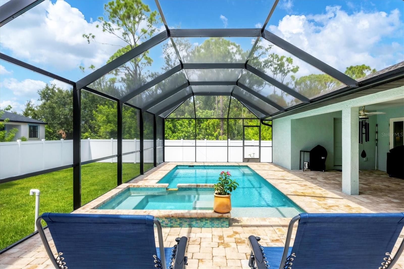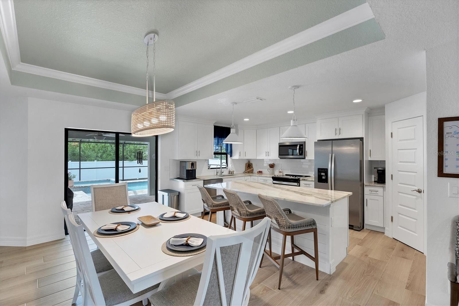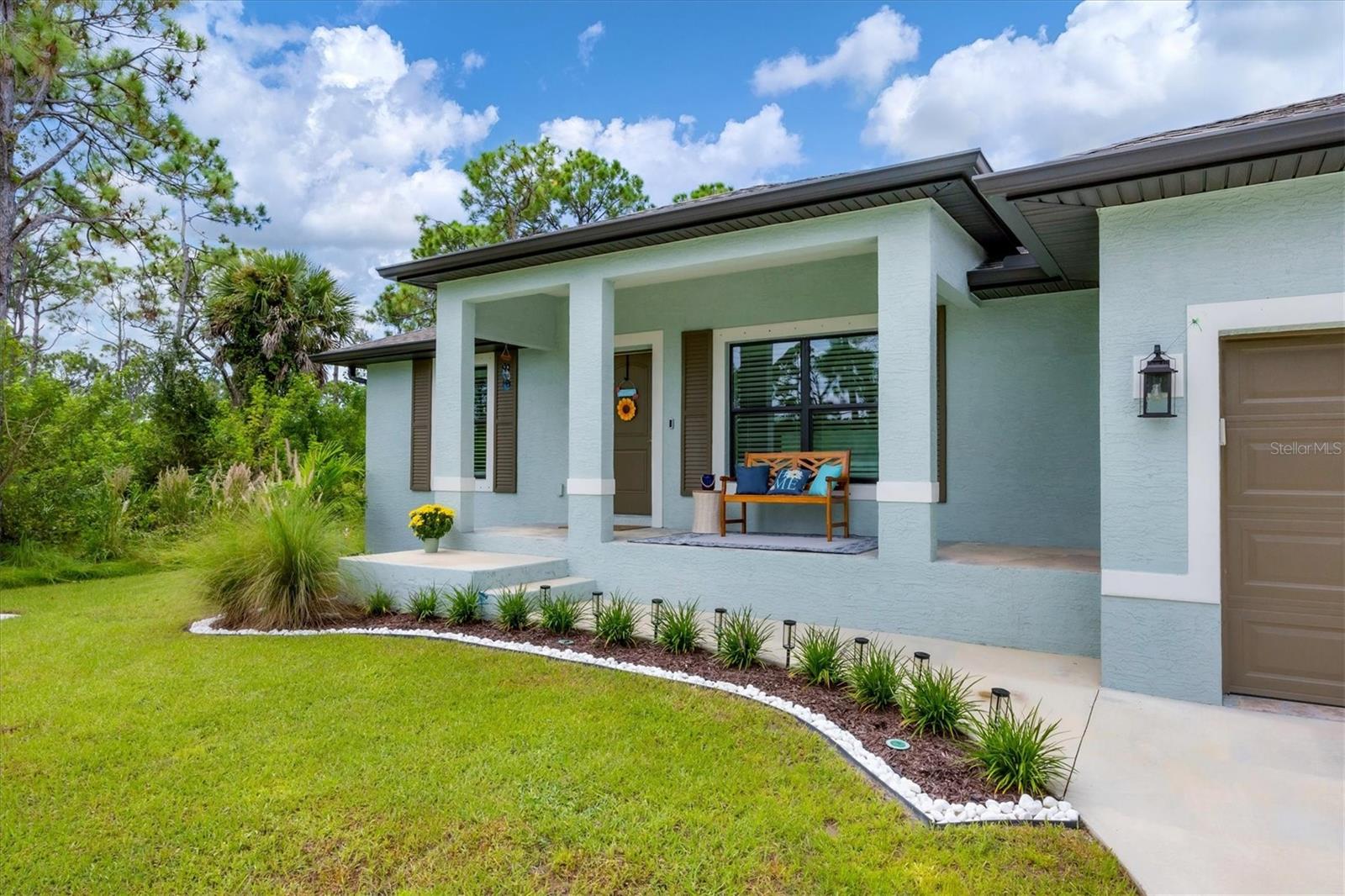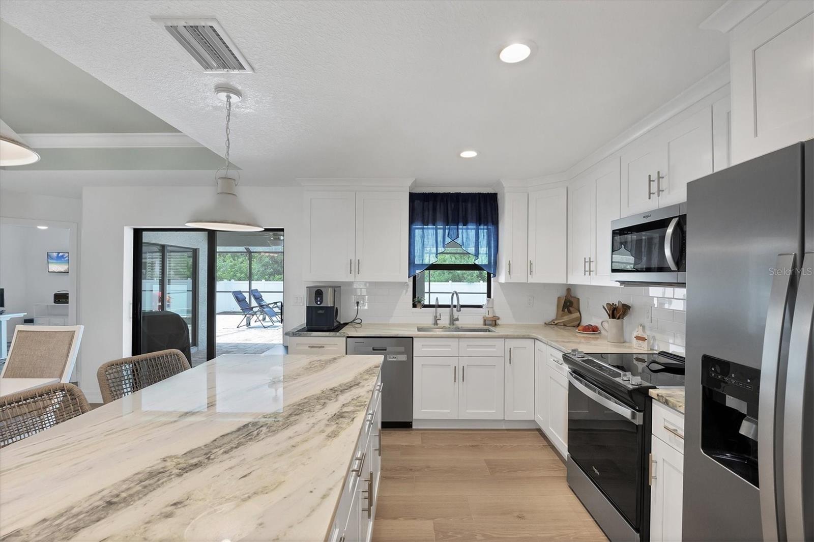 Short Sale. Nearly new coastal-style home with 3 bedrooms PLUS an office/den/flex room, 2 baths, and an oversized 3-car garage with a saltwater pool and spa in desirable South Gulf Cove! This open-concept retreat highlights crown molding, tray ceilings, shiplap accents, porcelain plank tile, and level 4 granite throughout. The chef's kitchen boasts solid wood soft-close cabinetry, Whirlpool stainless steel appliances, TWO pantries, tiled backsplash, and a large center island. The private owner's suite offers direct patio access, a large walk-in closet and pool access. Two guest bedrooms feature spacious closets, while the versatile flex room overlooks the pool and lanai through sliding glass doors. Both bathrooms are beautifully appointed with tiled showers and benches. Step outside to your backyard oasis, complete with a saltwater heated pool and spa, a spacious covered lanai, and a massive screened paver deck with sunny SW exposure. The fully fenced yard provides both privacy and space to relax or entertain. Additional highlights include a laundry room with sink and a linen closet, hurricane shutters, and high-end fixtures throughout. Flood insurance is transferable offering peace of mind and convenience for the new owner. This boater's paradise also offers an optional community boat ramp with Gulf access, and you'll be just minutes from beaches, fishing, golf, shopping, and dining. Move right in and enjoy the Florida lifestyle!