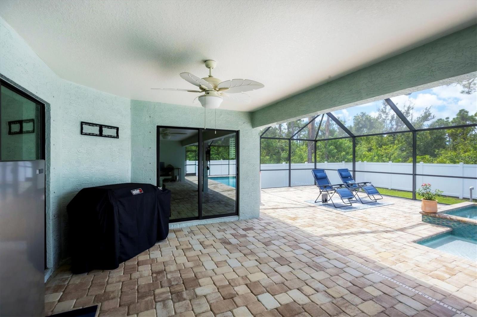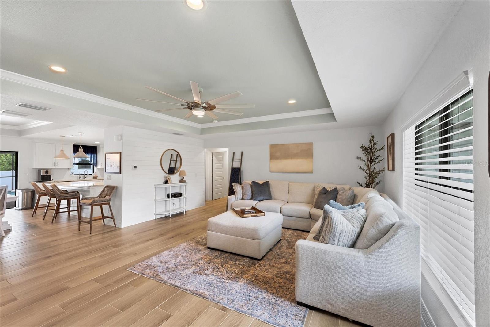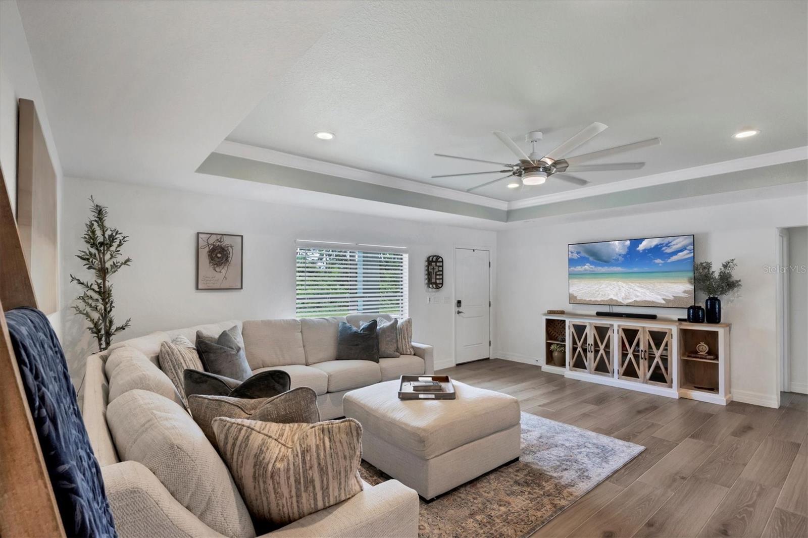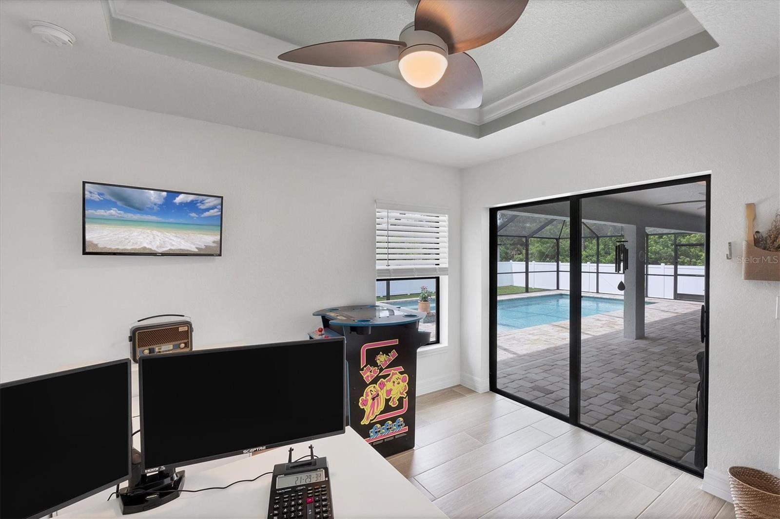 Short Sale. Nearly new coastal-style home with 3 bedrooms PLUS an office/den/flex room, 2 baths, and an oversized 3-car garage with a saltwater pool and spa in desirable South Gulf Cove! This open-concept retreat highlights crown molding, tray ceilings, shiplap accents, porcelain plank tile, and level 4 granite throughout. The chef's kitchen boasts solid wood soft-close cabinetry, Whirlpool stainless steel appliances, TWO pantries, tiled backsplash, and a large center island. The private owner's suite offers direct patio access, a large walk-in closet and pool access. Two guest bedrooms feature spacious closets, while the versatile flex room overlooks the pool and lanai through sliding glass doors. Both bathrooms are beautifully appointed with tiled showers and benches. Step outside to your backyard oasis, complete with a saltwater heated pool and spa, a spacious covered lanai, and a massive screened paver deck with sunny SW exposure. The fully fenced yard provides both privacy and space to relax or entertain. Additional highlights include a laundry room with sink and a linen closet, hurricane shutters, and high-end fixtures throughout. Flood insurance is transferable offering peace of mind and convenience for the new owner. This boater's paradise also offers an optional community boat ramp with Gulf access, and you'll be just minutes from beaches, fishing, golf, shopping, and dining. Move right in and enjoy the Florida lifestyle!
