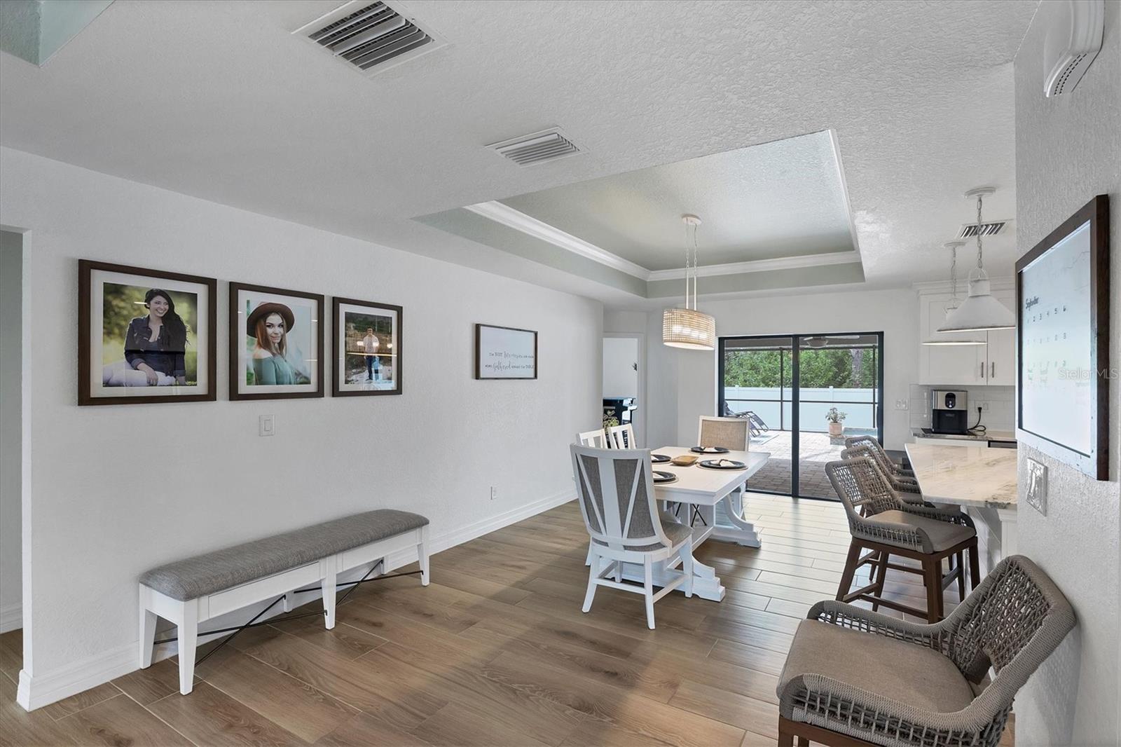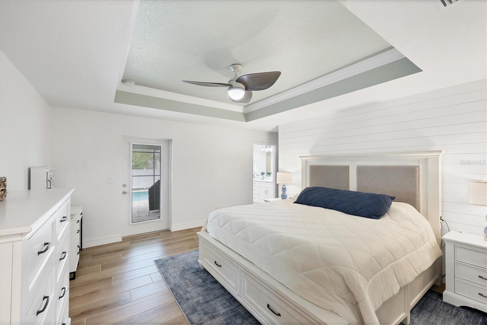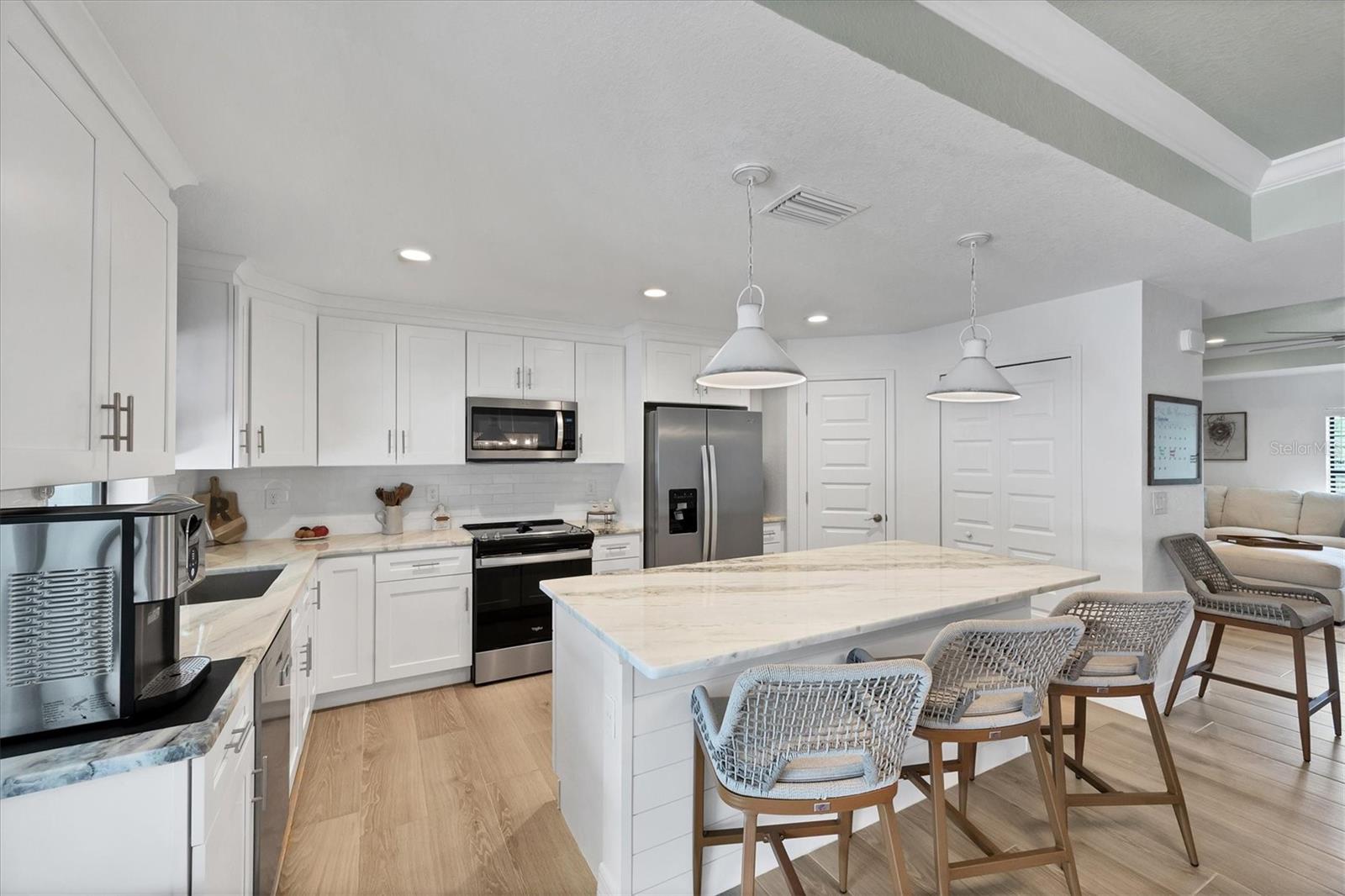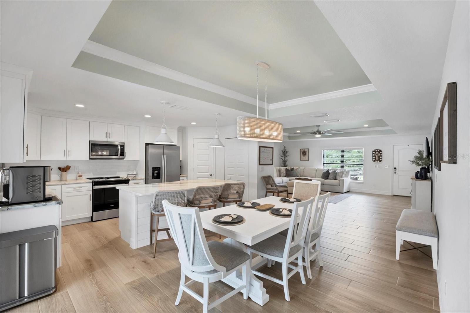 Short Sale. Nearly new coastal-style home with 3 bedrooms PLUS an office/den/flex room, 2 baths, and an oversized 3-car garage with a saltwater pool and spa in desirable South Gulf Cove! This open-concept retreat highlights crown molding, tray ceilings, shiplap accents, porcelain plank tile, and level 4 granite throughout. The chef's kitchen boasts solid wood soft-close cabinetry, Whirlpool stainless steel appliances, TWO pantries, tiled backsplash, and a large center island. The private owner's suite offers direct patio access, a large walk-in closet and pool access. Two guest bedrooms feature spacious closets, while the versatile flex room overlooks the pool and lanai through sliding glass doors. Both bathrooms are beautifully appointed with tiled showers and benches. Step outside to your backyard oasis, complete with a saltwater heated pool and spa, a spacious covered lanai, and a massive screened paver deck with sunny SW exposure. The fully fenced yard provides both privacy and space to relax or entertain. Additional highlights include a laundry room with sink and a linen closet, hurricane shutters, and high-end fixtures throughout. Flood insurance is transferable offering peace of mind and convenience for the new owner. This boater's paradise also offers an optional community boat ramp with Gulf access, and you'll be just minutes from beaches, fishing, golf, shopping, and dining. Move right in and enjoy the Florida lifestyle!