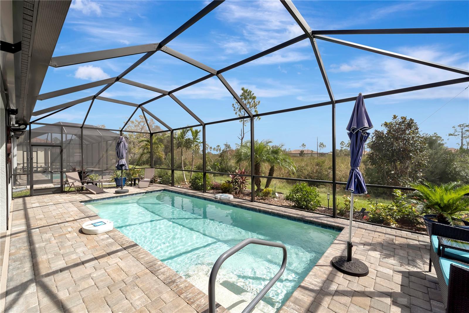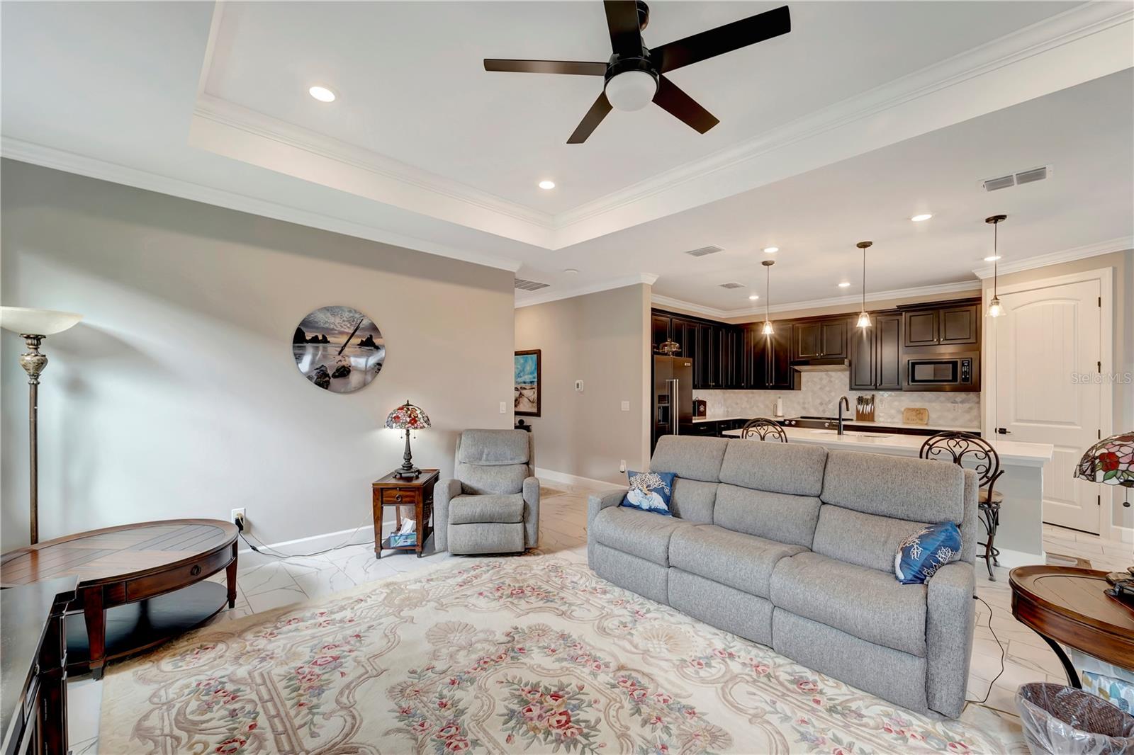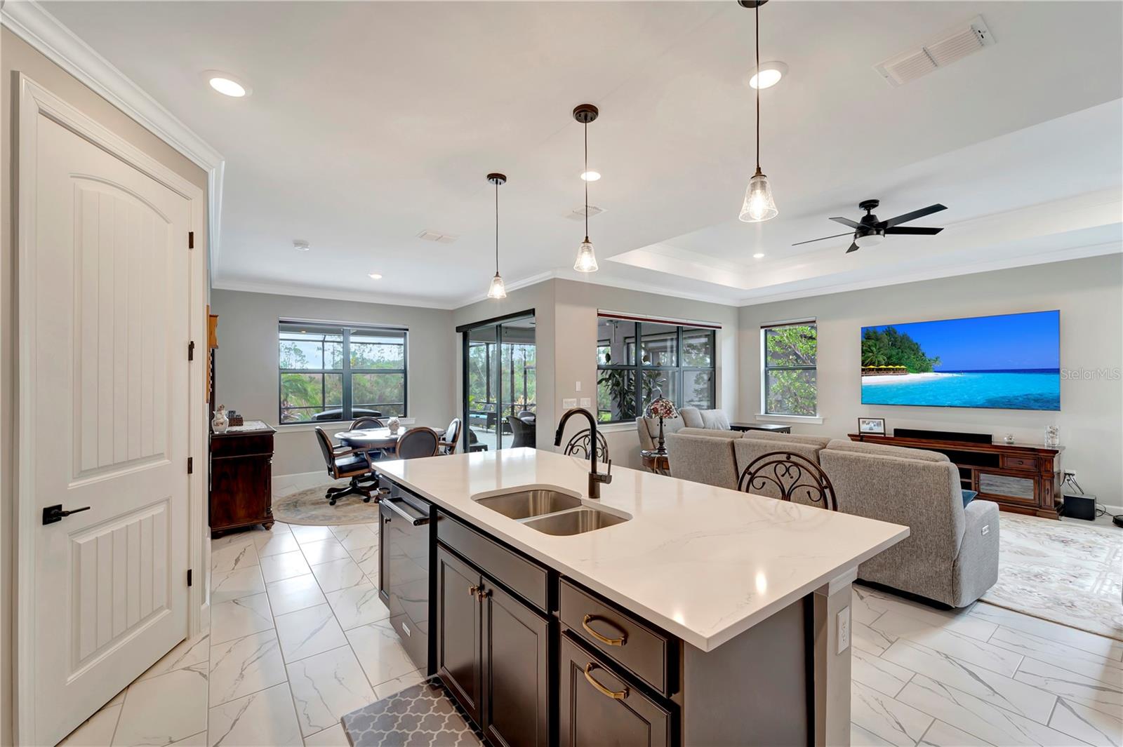 One or more photo(s) has been virtually staged. BIG PRICE IMPROVEMENT!! BRING OFFERS!! THIS HOME IS NOT IN A FLOOD ZONE!! Welcome home to this stunning 2-bedroom, den and 2-bathroom haven nestled in Del Webb Cypress Falls at the Woodlands pool Home, an exclusive 55+ gated community tailored for active adults. Situated just a short drive from the Gulf beaches, this residence boasts impeccable curb appeal with upgraded landscaping and custom curbing that sets the tone for what lies beyond. Step through the front door and be greeted by the intricate etched glass, a prelude to the elegance that awaits within. The spacious entry hall beckons you further into the home, where you'll find 8' doors, crown molding throughout the entire living space and window treatments adorning every window, exuding a sense of refined luxury. High-quality ceiling fans grace each bedroom and the living room, ensuring comfort throughout. The heart of the home is its expansive open-concept living space, ideal for hosting gatherings with loved ones. The generously sized guest room and den, complete with a shared bathroom featuring quartz countertops and a tall vanity, provide comfortable accommodations for guests. The kitchen is a chef's dream, boasting an upgraded appliance package, quartz countertops, a tile backsplash, and 42" upper cabinets surrounding a large island. Meanwhile, the primary bedroom, tucked away at the rear of the home, offers tranquility and serenity with its picturesque view of the preserve. Here, you'll find a tray ceiling and a high-quality ceiling fan, adding a touch of sophistication. The primary bathroom is a sanctuary unto itself, featuring a spacious walk-in shower with upgraded tile, a tall vanity with dual bowls, and quartz countertops. A large walk-in closet with ample shelving provides plenty of storage space for your wardrobe. Conveniently located near the garage, the laundry room boasts cabinetry and a laundry sink for added convenience. Step outside from the Dining room area onto the large lanai, partially covered with an extension that houses the saltwater pool that overlooks the preserve--a perfect setting for outdoor entertainment and relaxation. This home has recently installed hurricane shutters though out as well as Hurricane blockers in all roof vents. Remote control Privacy screens inside the dining room, and on two of the covered openings in the Lanai were also recently Added. The garage, with its 4' extension, offers ample space for vehicles, golf cart parking, as well as a full filtration and water softener and additional storage. TV'S ARE INCLUDED (EXCEPT FOR THE PRIMARY BEDROOM). Beyond the confines of this exquisite abode lies Cypress Falls, a meticulously maintained gated community teeming with activities and amenities. From the expansive clubhouse and resort-style pools to the fitness center, Tennis courts, Pickleball Courts, horseshoes, bocce and social events, there's something for everyone here. With a full-time activities director and a plethora of clubs and events, you're not just buying a home--you're buying into a vibrant and thriving community. Come see for yourself what makes this home and community truly exceptional!