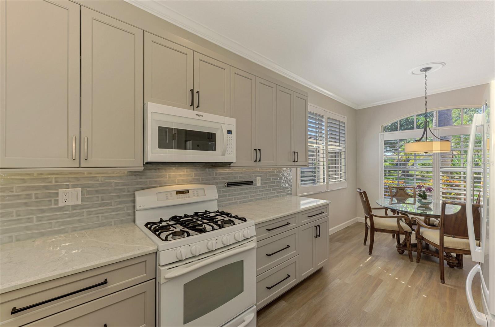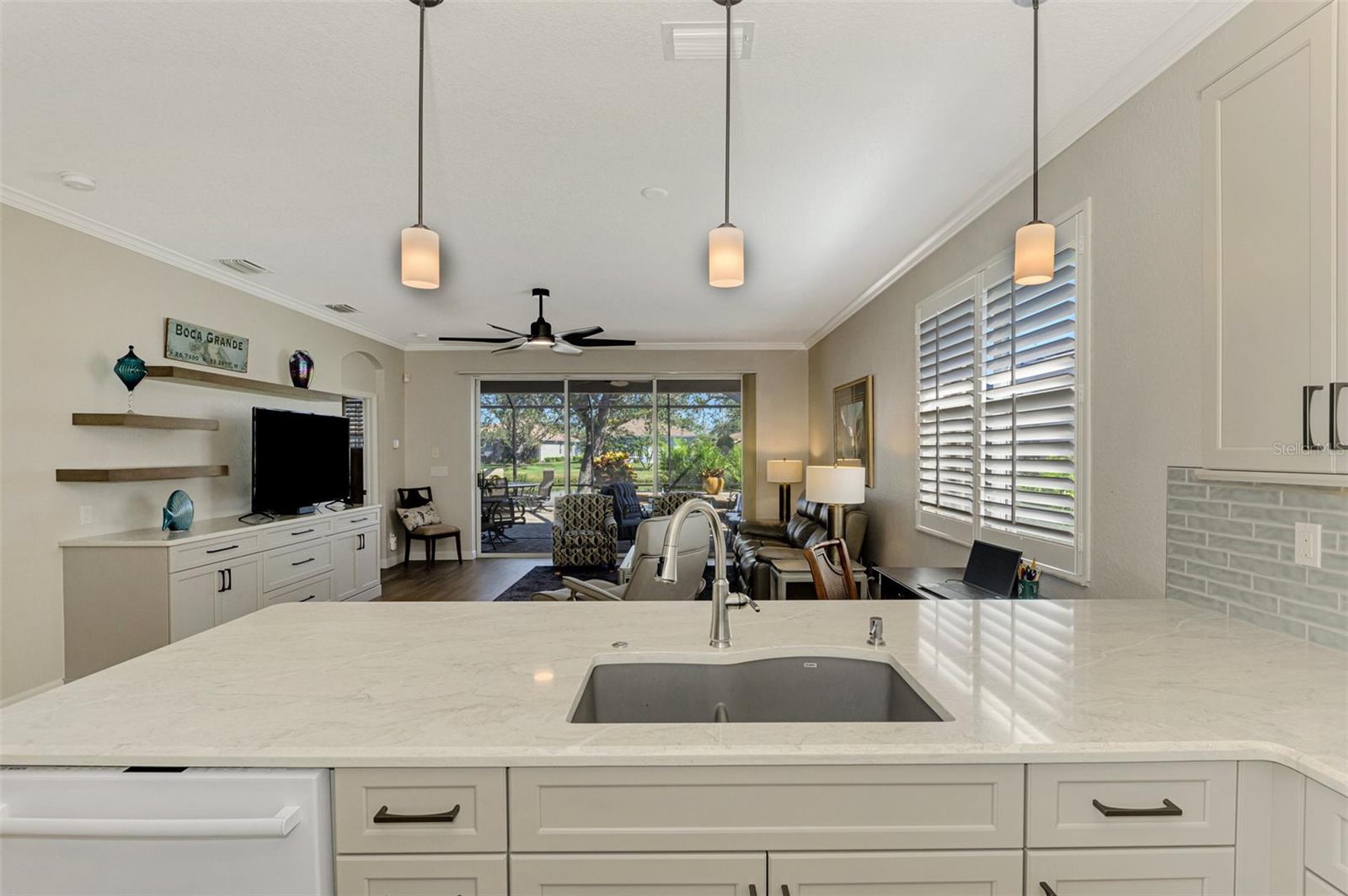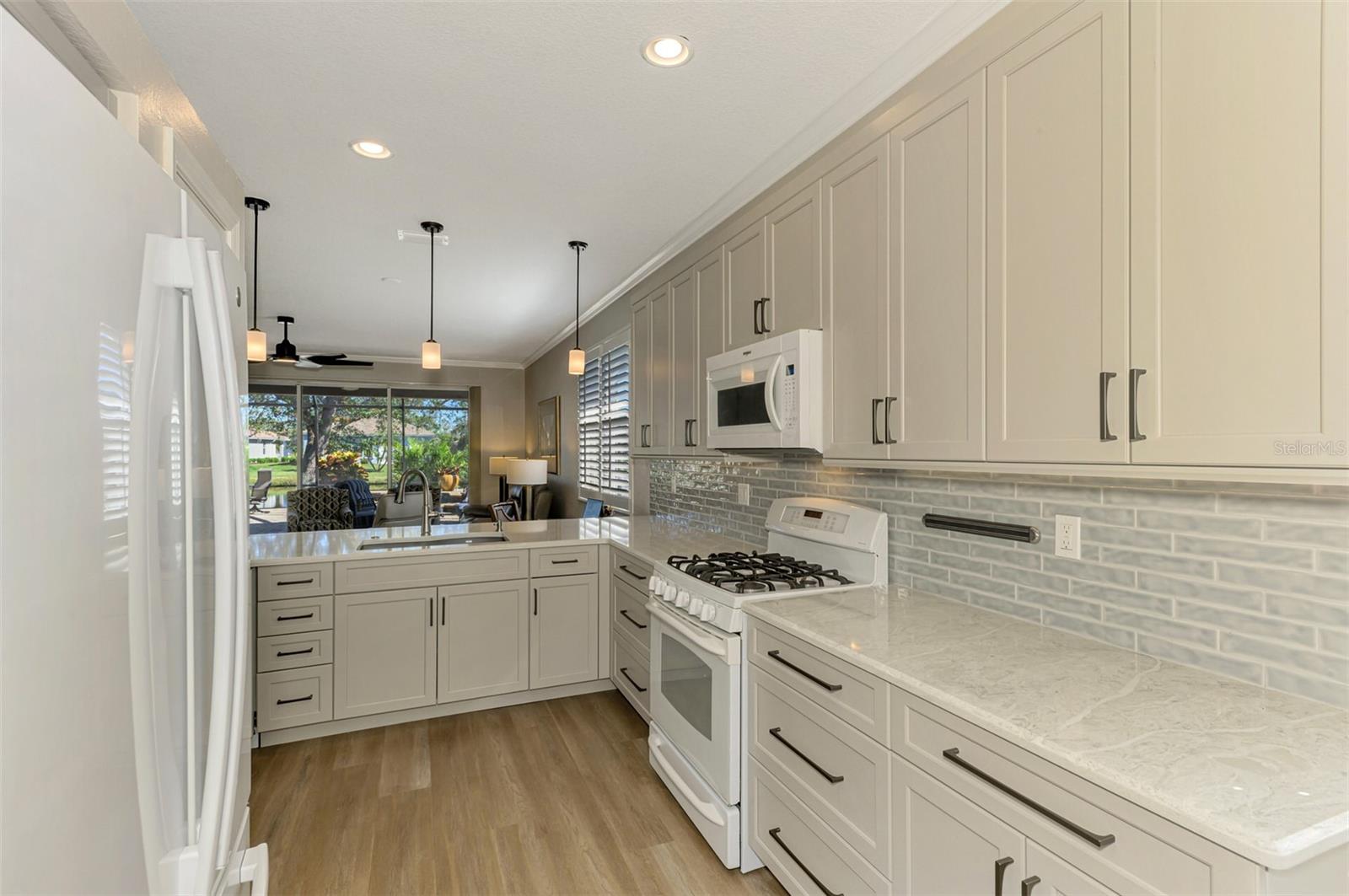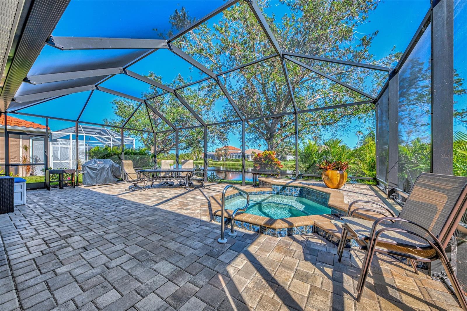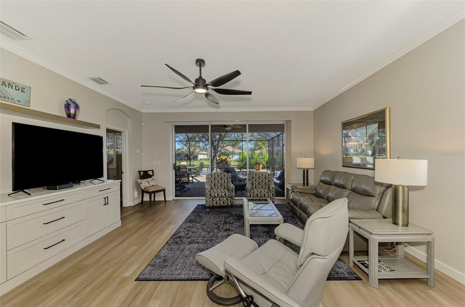 This FULLY REMODELED home with today's MODERN TRENDS is a SHOWSTOPPER- From the home's inviting curb appeal and well-maintained landscaping to its expansive outdoor lanai, this 3 Bedroom 2 Bathroom home is ready for you to move right in! The expansive lanai for relaxation and entertaining features a heated oversized spa with decorative tile accents and a planter, all conveniently controlled with electronic settings. Surrounded by Florida's natural beauty, the home offers serene water views that provide a peaceful and private retreat. Inside, the updated interior strikes the perfect balance between modern style and everyday comfort. Highlights include quality cabinetry, sleek quartz countertops and replaced appliances, complemented by upgraded luxury vinyl floors, a stylish tiled backsplash and a custom-built entertainment center. Plantation shutters, crown molding and other charming details add character throughout. The primary bedroom features a renovated bathroom with an expansive Roman walk-in shower and two closets for extra storage. The third bedroom offers versatility with a built-in desk and a Murphy bed, making it ideal for a home office or guest space. Adding even more value, this home includes a 2023 NEW METAL ROOF for peace of mind. Nestled in the resort-style, gated community of Riverwood, this home is perfectly situated to enjoy all the amenities and activities the neighborhood provides. Residents love the tree-lined walking and biking paths, tennis and pickleball courts, a lap and resort-style pool with a hot tub, fitness center, and a variety of social activities and classes at the Activity Center. Golf enthusiasts can take advantage of the Riverwood Golf Club's Par 72 Championship course, while pet owners will appreciate the R.O.M.P. Dog Park. Members can also enjoy access to the exclusive Beach Club on Manasota Key (membership based on availability). Conveniently located between Sarasota and Fort Myers on Florida's stunning West Coast, Riverwood provides easy access to boating, cultural events, dining, shopping, and the gorgeous beaches of Southwest Florida. This home is the ideal blend of relaxed living and stylish upgrades. Don't wait--contact your agent today to view all that this well-appointed Riverwood Home and Community provides.
