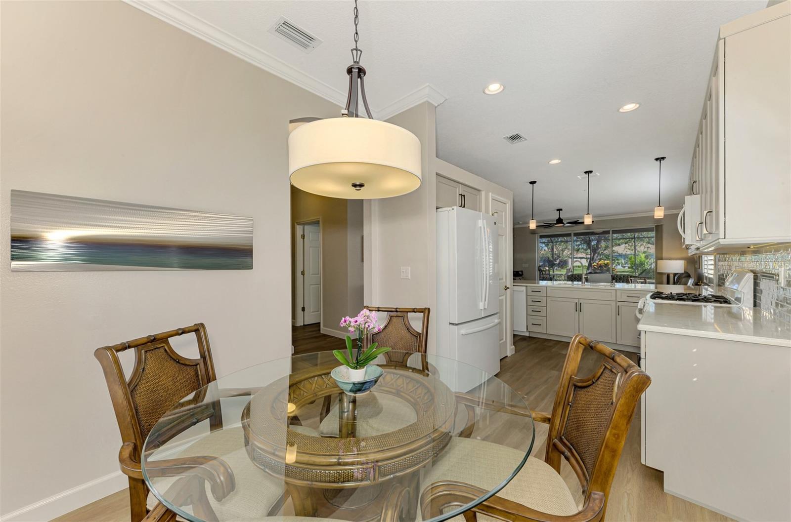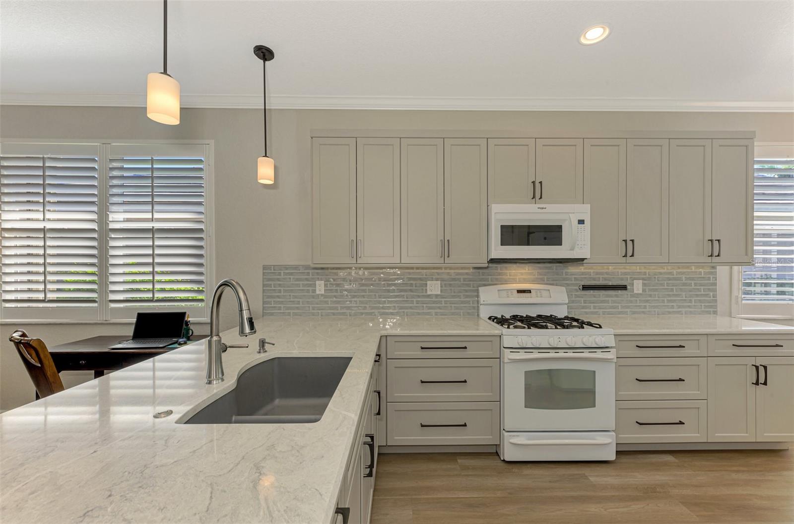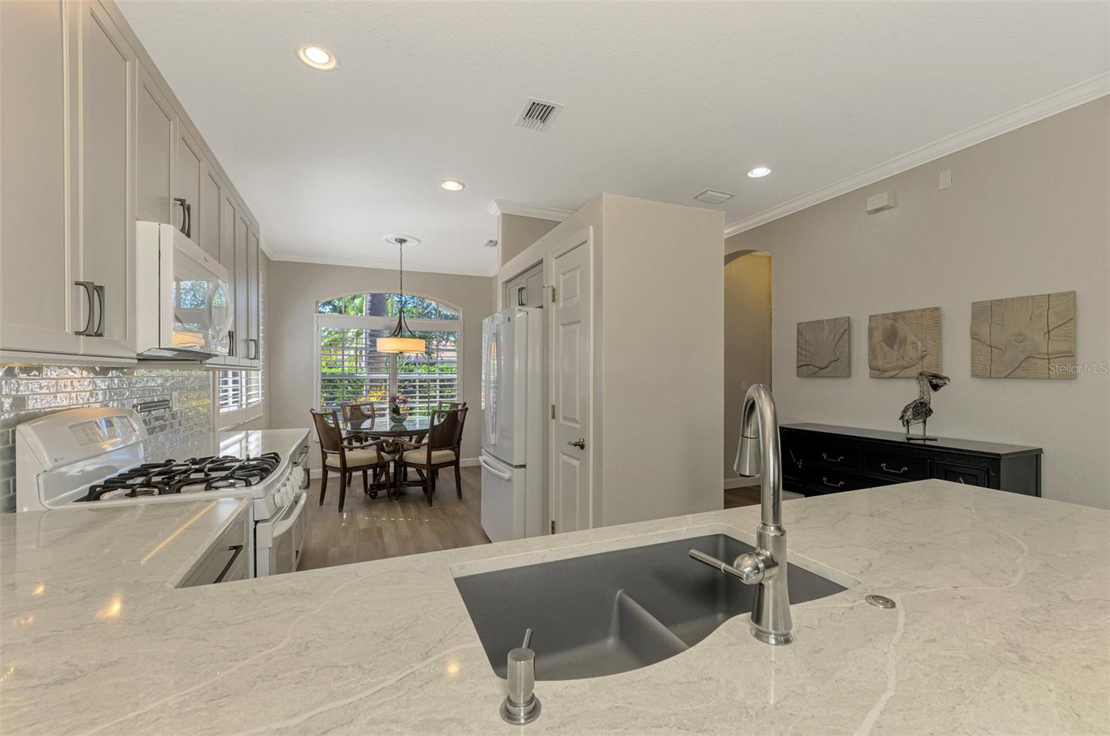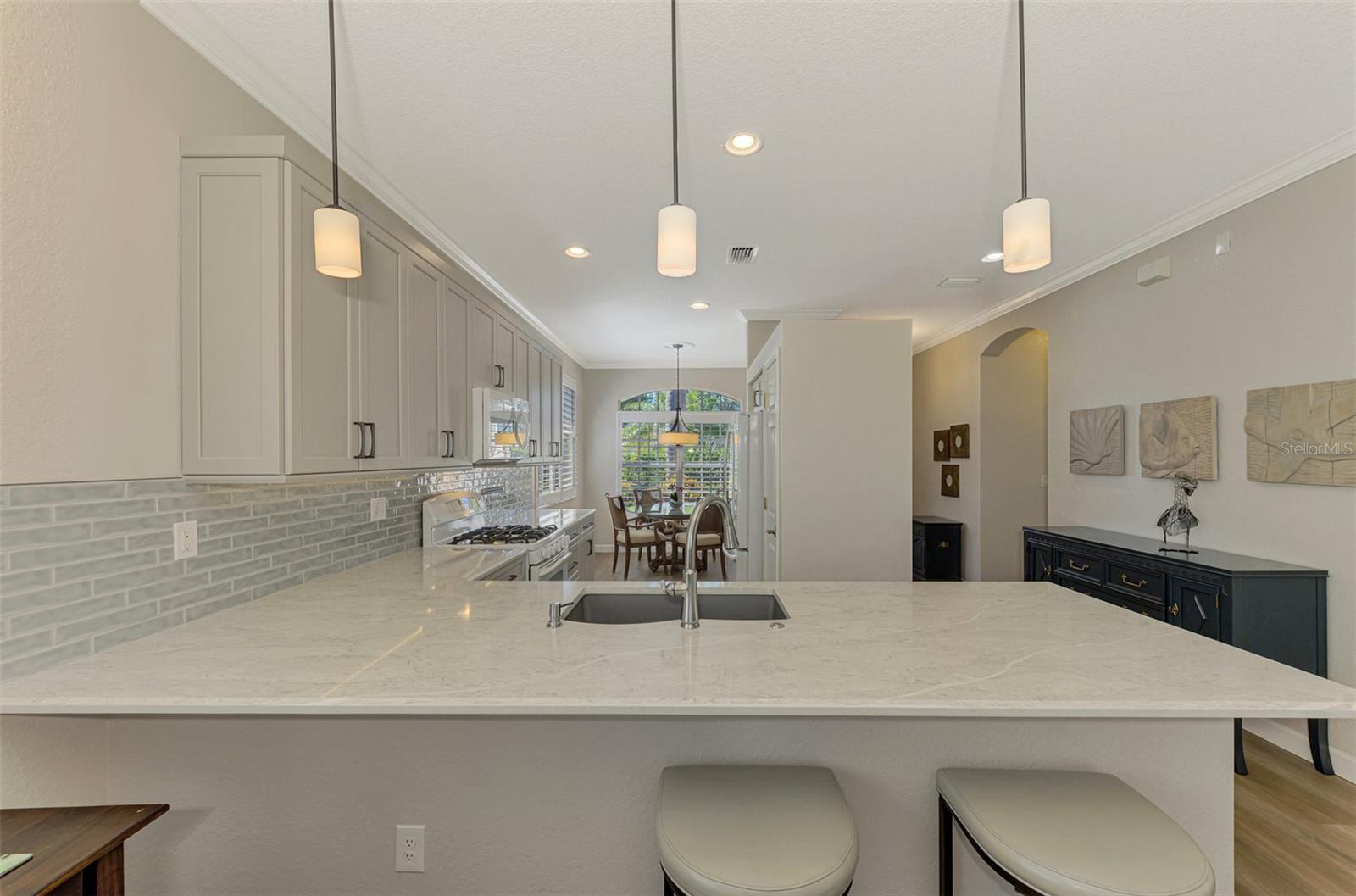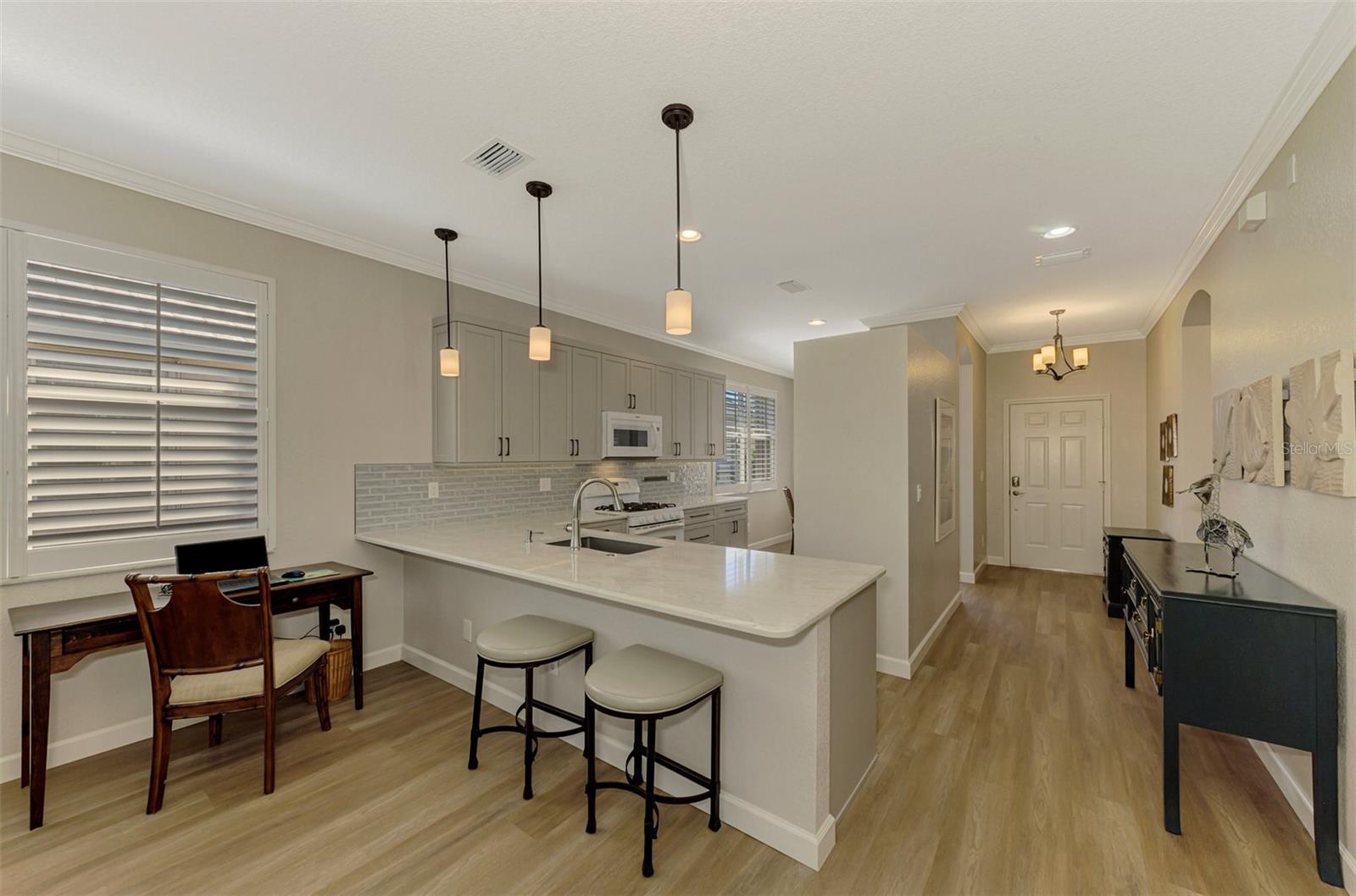 This FULLY REMODELED home with today's MODERN TRENDS is a SHOWSTOPPER- From the home's inviting curb appeal and well-maintained landscaping to its expansive outdoor lanai, this 3 Bedroom 2 Bathroom home is ready for you to move right in! The expansive lanai for relaxation and entertaining features a heated oversized spa with decorative tile accents and a planter, all conveniently controlled with electronic settings. Surrounded by Florida's natural beauty, the home offers serene water views that provide a peaceful and private retreat. Inside, the updated interior strikes the perfect balance between modern style and everyday comfort. Highlights include quality cabinetry, sleek quartz countertops and replaced appliances, complemented by upgraded luxury vinyl floors, a stylish tiled backsplash and a custom-built entertainment center. Plantation shutters, crown molding and other charming details add character throughout. The primary bedroom features a renovated bathroom with an expansive Roman walk-in shower and two closets for extra storage. The third bedroom offers versatility with a built-in desk and a Murphy bed, making it ideal for a home office or guest space. Adding even more value, this home includes a 2023 NEW METAL ROOF for peace of mind. Nestled in the resort-style, gated community of Riverwood, this home is perfectly situated to enjoy all the amenities and activities the neighborhood provides. Residents love the tree-lined walking and biking paths, tennis and pickleball courts, a lap and resort-style pool with a hot tub, fitness center, and a variety of social activities and classes at the Activity Center. Golf enthusiasts can take advantage of the Riverwood Golf Club's Par 72 Championship course, while pet owners will appreciate the R.O.M.P. Dog Park. Members can also enjoy access to the exclusive Beach Club on Manasota Key (membership based on availability). Conveniently located between Sarasota and Fort Myers on Florida's stunning West Coast, Riverwood provides easy access to boating, cultural events, dining, shopping, and the gorgeous beaches of Southwest Florida. This home is the ideal blend of relaxed living and stylish upgrades. Don't wait--contact your agent today to view all that this well-appointed Riverwood Home and Community provides.