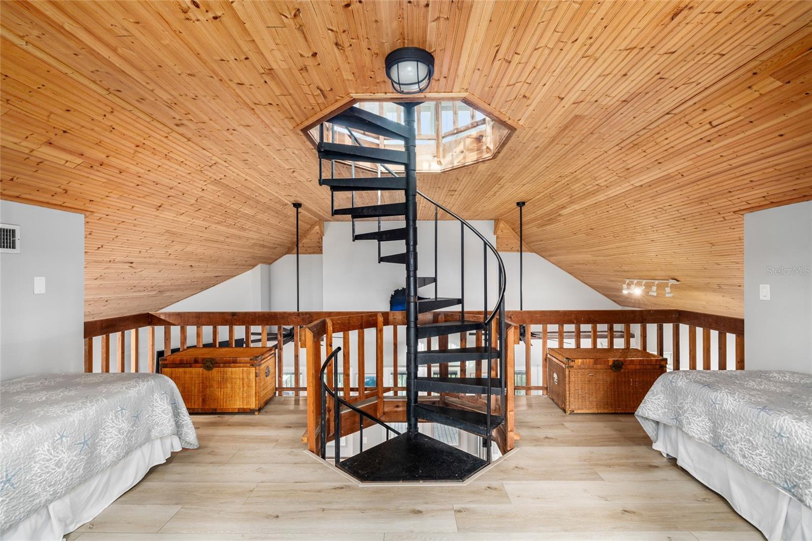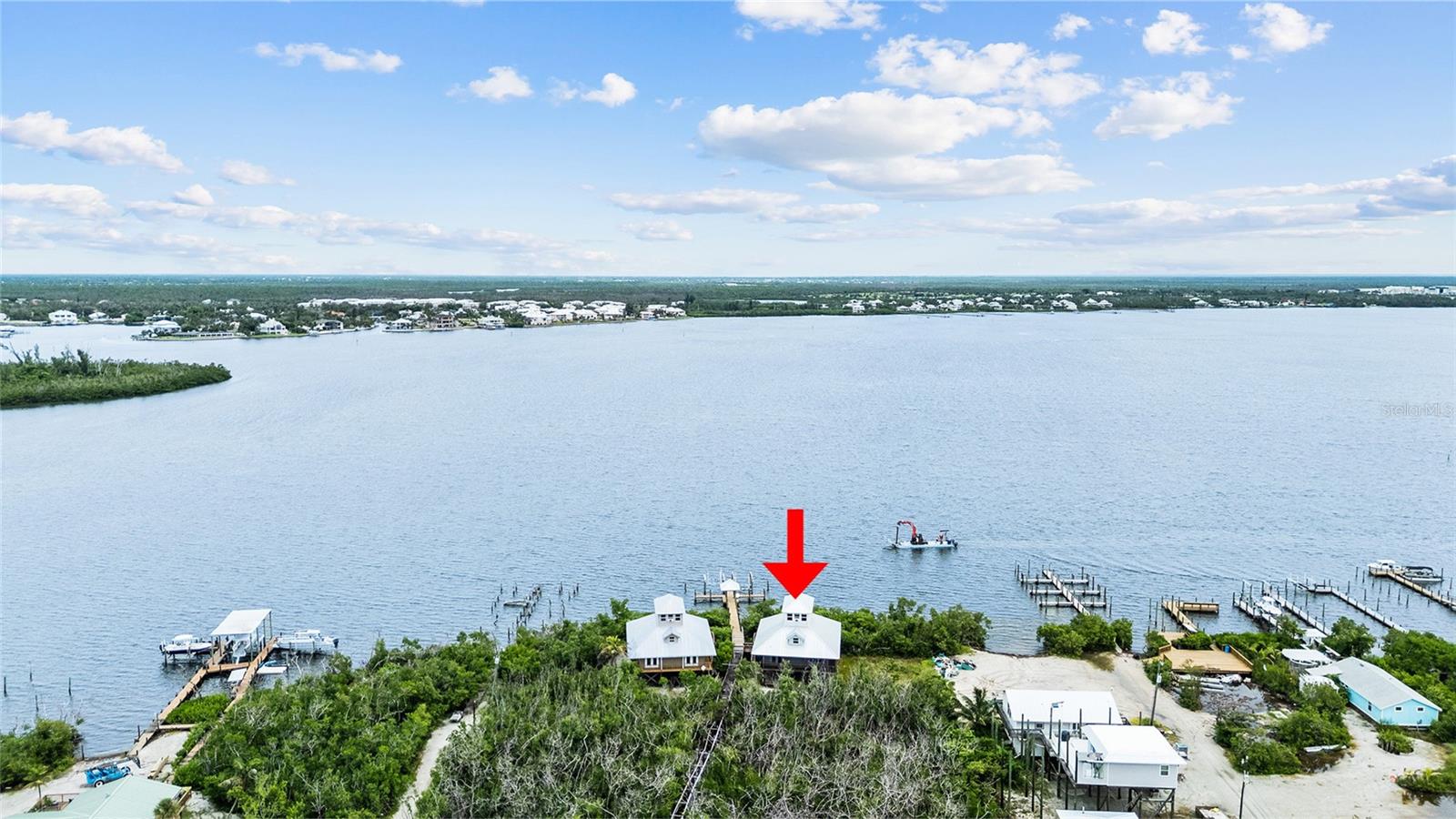 Price reduced on this beautiful home which is one of the iconic twin bayfront homes on Little Gasparilla Island, a bridgeless barrier island off the Cape Haze peninsula. A 10-minute boat ride brings you to the new shared boat dock with 10,000# boat lift. The home was updated in 2023, including a new roof, and comes furnished. On the first floor there are 2 bedrooms, 2 bathrooms, living room, kitchen, and laundry closet. The living room and kitchen are open and spacious with vaulted wood ceilings and three sets of French doors on the front of the house that lead out to the large screened in front porch that overlooks Placida Harbor. From there you can sit and watch the sunrise, see the boats go by, the dolphins and manatees swimming, and the birds diving for fish. In the living room there is an electric fireplace with a modern design. The updated kitchen has new soft close cabinets, glass tile backsplash, under counter lighting, stainless steel appliances, quarts countertops, and a large island with seating. Both bathrooms have new vanities with quarts counter tops, and new tile around the shower and tub. Both bedrooms have French doors that lead out to the covered, wrap-around deck. All the windows and doors are impact glass. The stackable, front load, washer and dryer are cleverly hidden behind a barndoor in the hall between the two bedrooms. Up the spiral staircase leads you to the loft, that is being used as a bedroom, with vaulted wood ceilings and a cozy nook that could be used as an office or reading space, and then further up the staircase you come to the 11' x 21' cupola that has shiplap walls, wood ceiling, and stunning views of the bay and the island and is also being used as a bedroom. The lot behind the home, which is almost 2 acres in size, is also for sale MLS #D6143898 and is where the shared septic system is located. The lot will need to be purchased with the home. Little Gasparilla Island doesn't have any grocery stores, restaurants, or shops but we have 3 miles of uncrowded beach to wander on and collect seashells and shark's teeth, swim, or sit with a good book and soak up the sun. There is great fishing in the surrounding waters for redfish, snook, snapper, trout and more. By water there are many wonderful restaurants to cruise to. Then at the end of the day meet your friendly neighbors at the water's edge to watch the sun set on another blissful day in paradise. Come and see this lovely home and find out what it's like to live on island time.