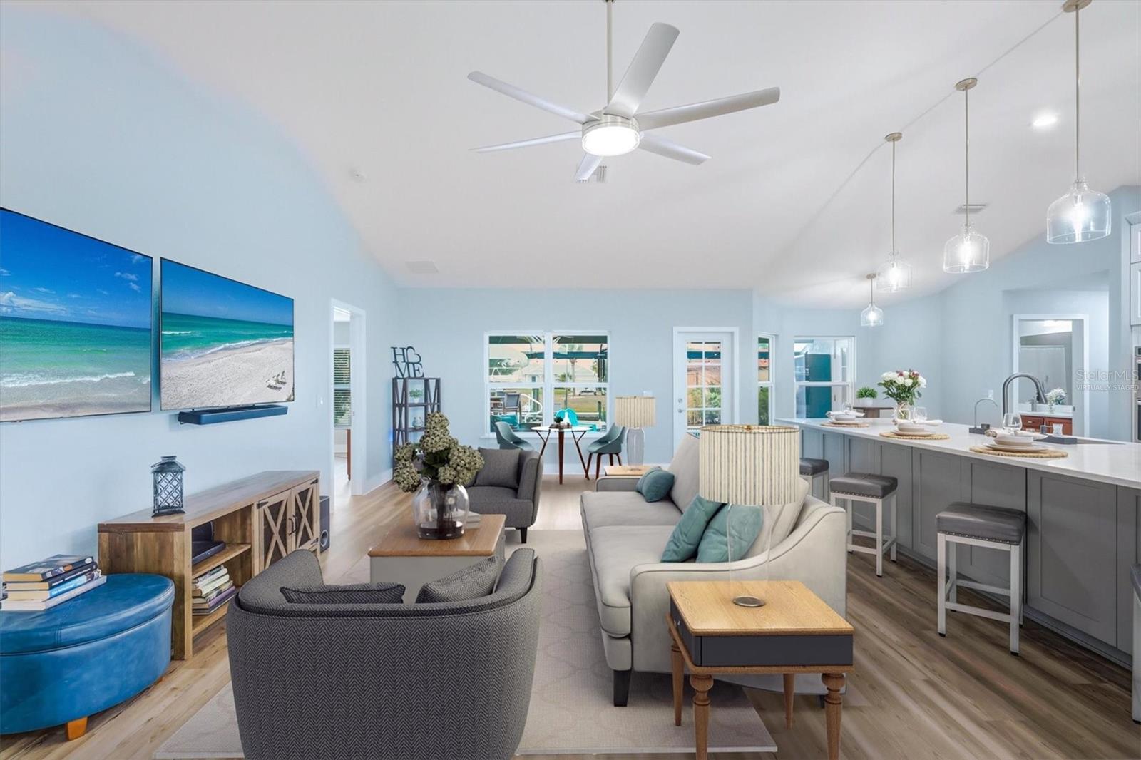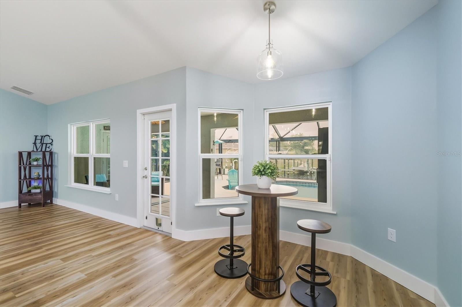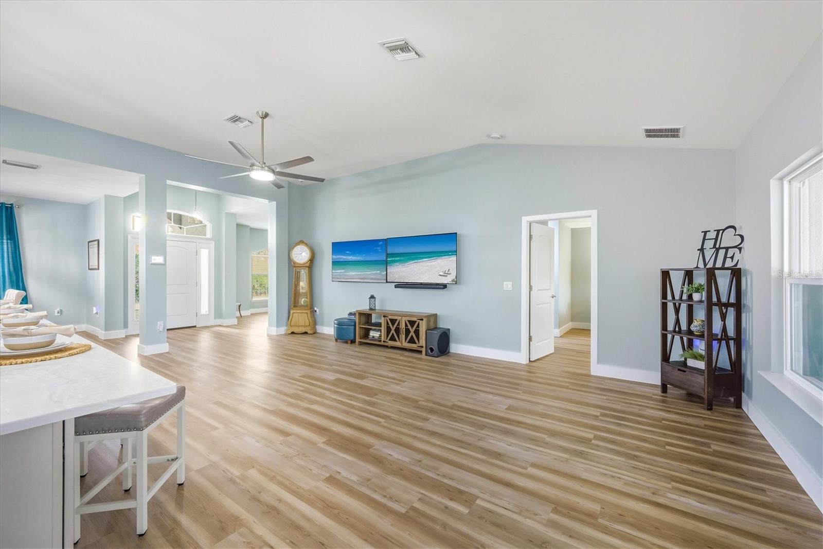 Completely reimagined and meticulously renovated, this waterfront residence presents as an entirely new home, where refined design, modern finishes, and serene canal views come together to create an exceptional coastal retreat. Significant improvements include a new roof (2023), fresh interior paint throughout, and luxury vinyl plank flooring installed in 2025. The screened lanai features a new pool enclosure, while the expanded laundry room offers a utility sink and direct access to the two-car garage, adding both function and convenience. The kitchen stands as a striking focal point of the home, curated for both everyday living and elevated entertaining. It features new upgraded cabinetry, all-new appliances (2025), and a dramatic oversized quartz island measuring approximately 15 feet by 4.5 feet. A statement Lefton multi-function sink with custom water controls adds a refined touch. Gas cooking is supported by an on-site propane tank and a pot filler above the range. Hidden behind a sliding barn door, a striking custom pantry wall features expansive shelving and curated lighting, thoughtfully designed to reveal a concealed coffee bar, an elevated detail that speaks to craftsmanship and intention. Upon entry, canal views set an immediate sense of calm and connection to the outdoors. Just off the foyer, a formal dining area is accented by a statement chandelier, while a custom bonus room on the opposite side features a floor-to-ceiling built-in library wall with a rolling ladder, an exceptional space for a private office, study, or flex room. An additional room located near the pantry and laundry offers further versatility as a guest room or secondary office. The living area anchors the center of the home, framed by expansive windows that overlook the lanai and water beyond. At the rear of the residence, two guest bedrooms and a shared bath are positioned on one side, while the primary suite enjoys privacy on the other. The shared bath has been fully renovated, featuring new quartz countertops and updated sinks. The primary bedroom offers direct lanai access, dual walk-in closets, and a fully renovated en suite bath showcasing new vanities, sinks, quartz countertops, updated lighting, and new flooring. Outdoor living is equally compelling, featuring a heated pool with attached spa. Beyond the screened lanai, a composite dock with electricity, pre-wired for a boat lift, extends along the canal and includes a flagpole and canal-fed irrigation system. This is a rare opportunity to own a meticulously renovated waterfront home where the most significant upgrades have already been completed, offering refined interiors, thoughtful design, and an exceptional outdoor lifestyle.