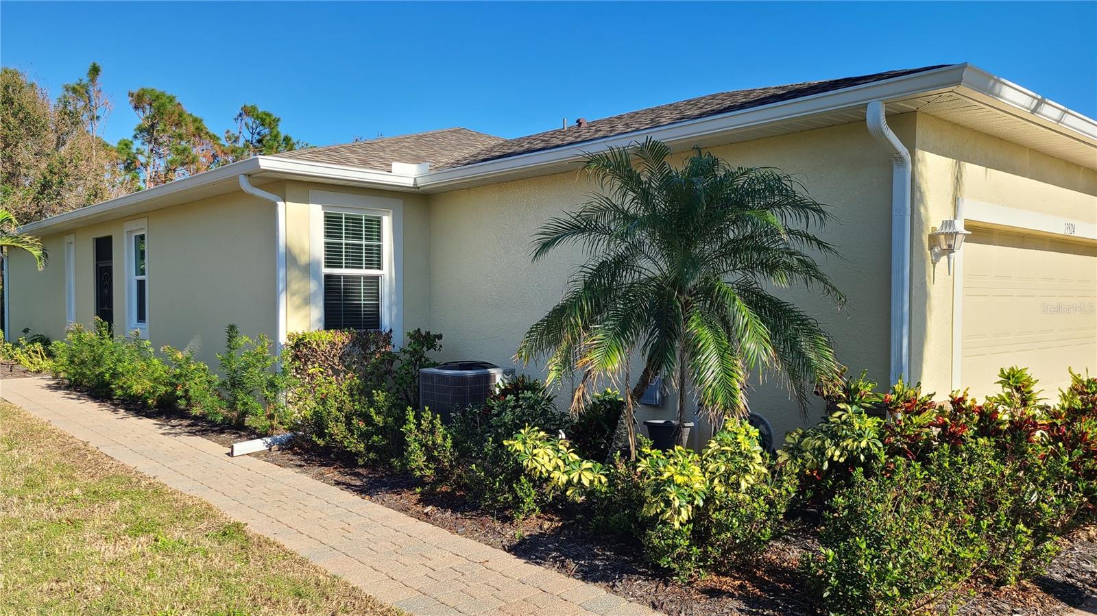 Exterior: Rain Gutters, Sidewalk, Sliding Doors