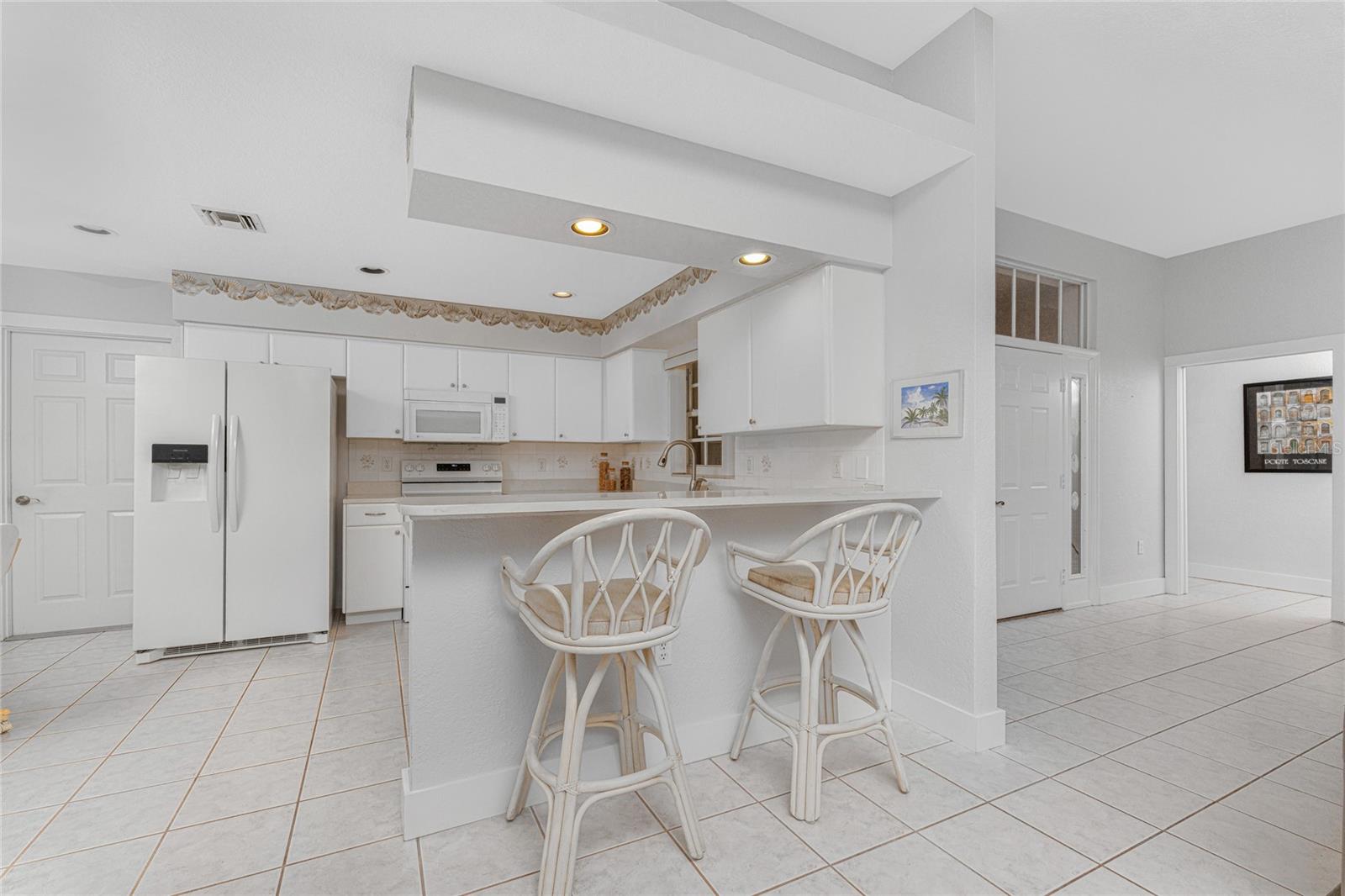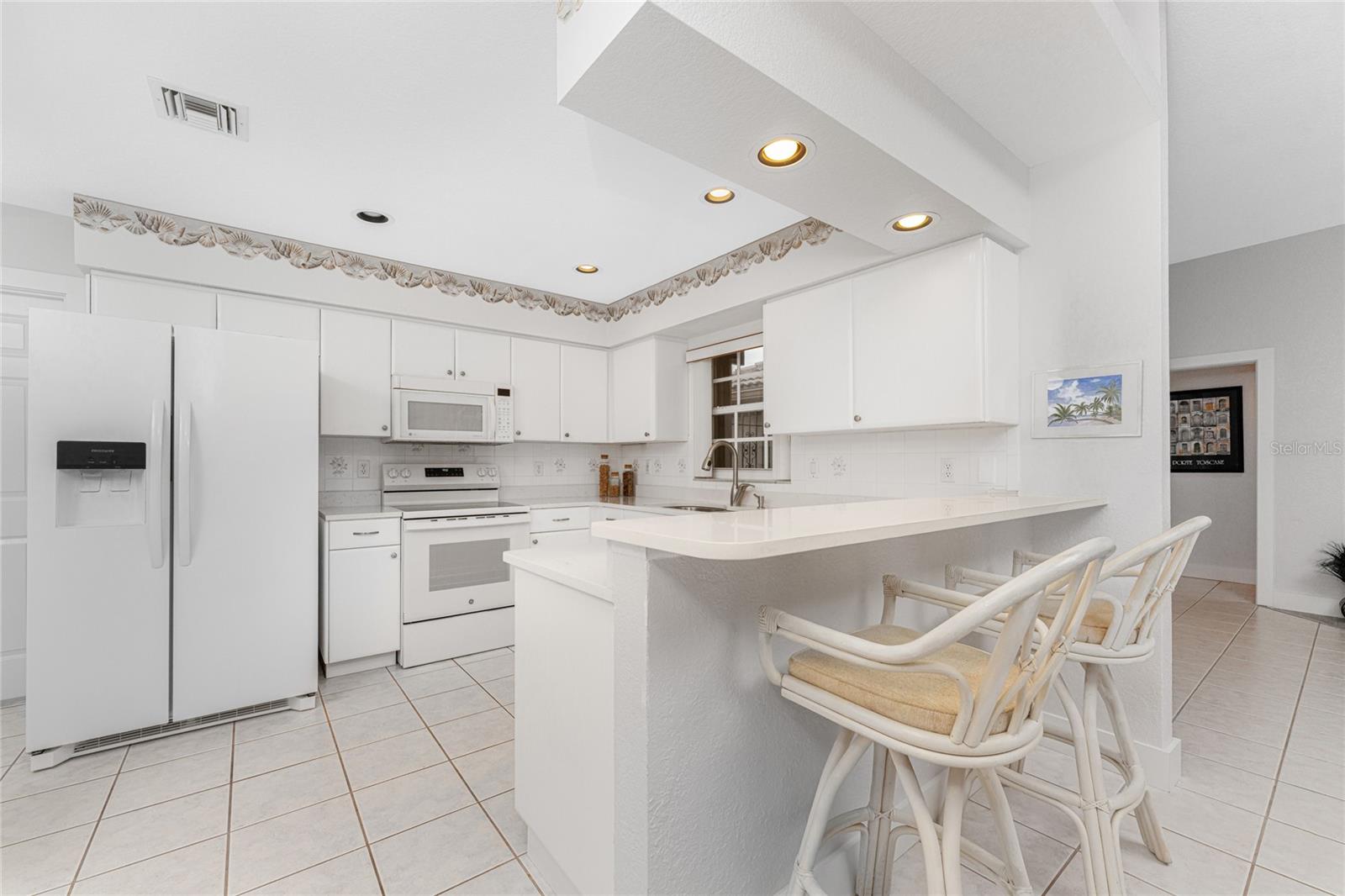 Light, bright, and filled with peaceful pond views, this beautifully remodeled two bedroom, two bathroom home is located in Oyster Creek, a 24 hour gated Golf and Country Club community with resort style amenities. Enjoy endless outdoor living from the oversized lanai, where wildlife and tranquil water views create the perfect Florida backdrop. This home is being sold furnished, making it easy to move right in and start enjoying the lifestyle. The exterior offers numerous updates, including a 2021 barrel tile roof, mature landscaping, a paver driveway resealed in 2023, hurricane rated impact windows installed in 2023, a welcoming front entry with transom window and sidelights, a screened garage door, and an epoxy coated garage floor. Inside, laminate wood and tile flooring throughout provide easy maintenance, while multiple sliding glass doors fill the home with natural light and showcase pool and pond views. The kitchen features a tray ceiling, white cabinetry, quartz countertops, and a breakfast bar, creating a bright and inviting space. A charming breakfast nook just off the kitchen is the perfect spot to enjoy morning coffee. The ensuite primary bedroom offers a spacious bathroom with a fully tiled walk in shower, dual quartz topped vanity, walk in closet, and linen closet. The guest bedroom is thoughtfully designed with a built-in desk and Murphy bed, allowing it to function as both a bedroom and home office. The guest bathroom includes a tub and shower combination and a quartz topped vanity. Outdoor living truly shines with a screened lanai and a resurfaced pebble finish pool completed in 2016, ideal for relaxing while enjoying serene pond views and the sounds of nature. Oyster Creek is a golf cart friendly community, and HOA fees include internet, TV, WiFi, landscaping, and waste pickup. Residents enjoy access to a community pool, fitness center, pickleball and tennis courts, and a busy social calendar, while the public Oyster Creek Golf Course offers optional golfing without mandatory golf membership. The location is excellent, just minutes from Ann Dever Park with walking trails and a Paw Park, nearby Gulf beaches, two Major League Baseball spring training facilities, dining, live entertainment, doctors offices, and a major retailer conveniently located near the community entrance. The public golf course upgrades are complete, offering a well maintained, challenging course suitable for golfers of all ages and skill levels, along with a pro shop, snack bar, and putting green. Do not miss the opportunity to own this move-in ready home at 8358 Pondview Lane and enjoy the best of Florida living.