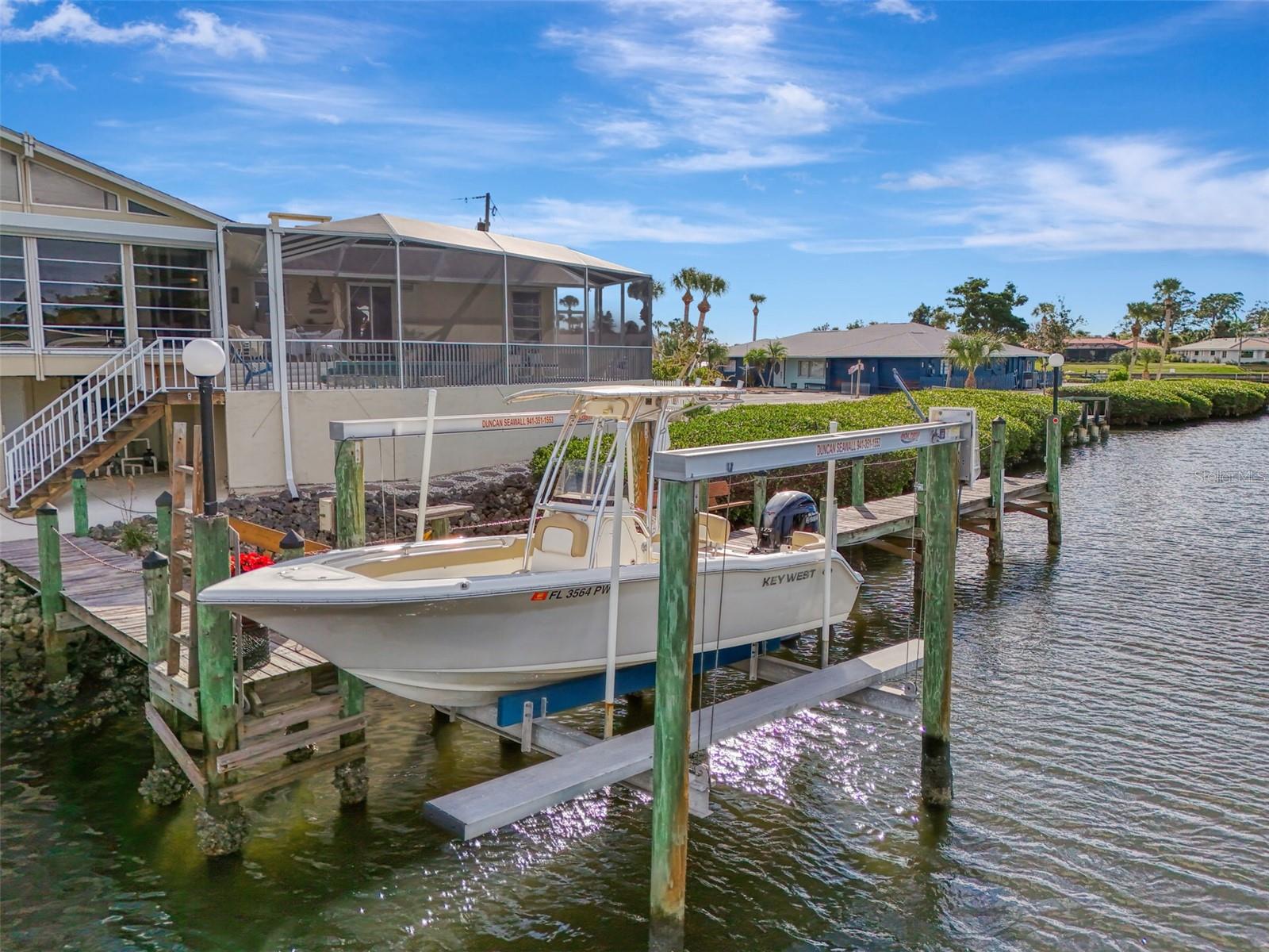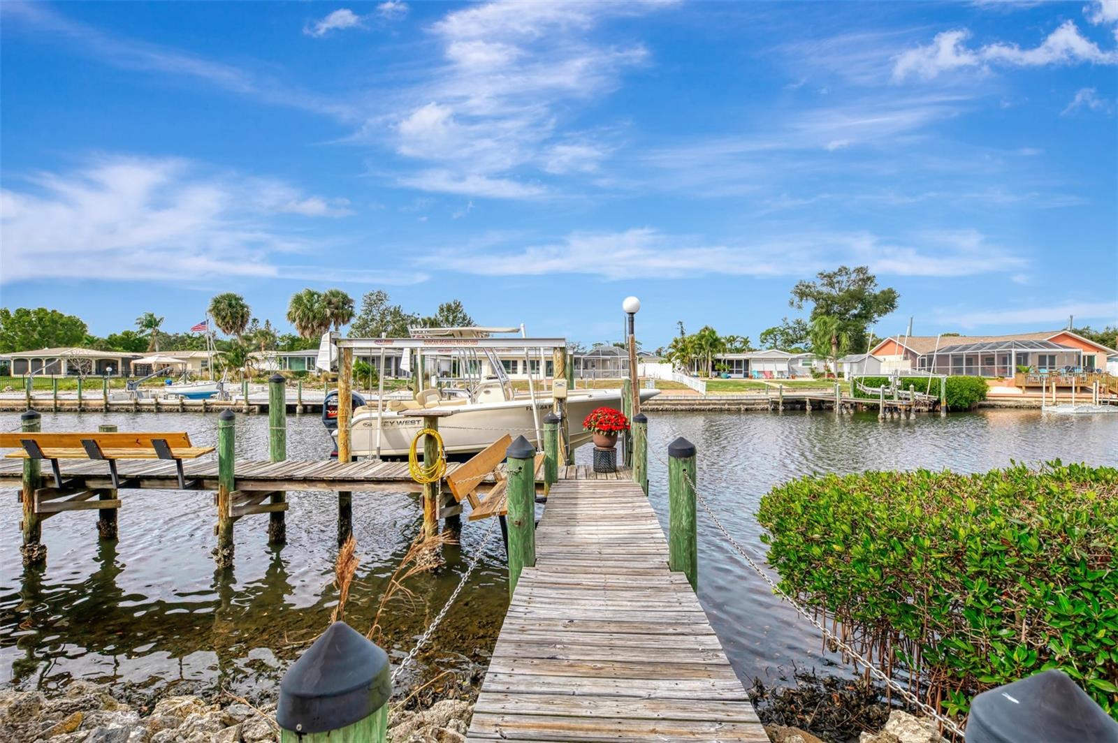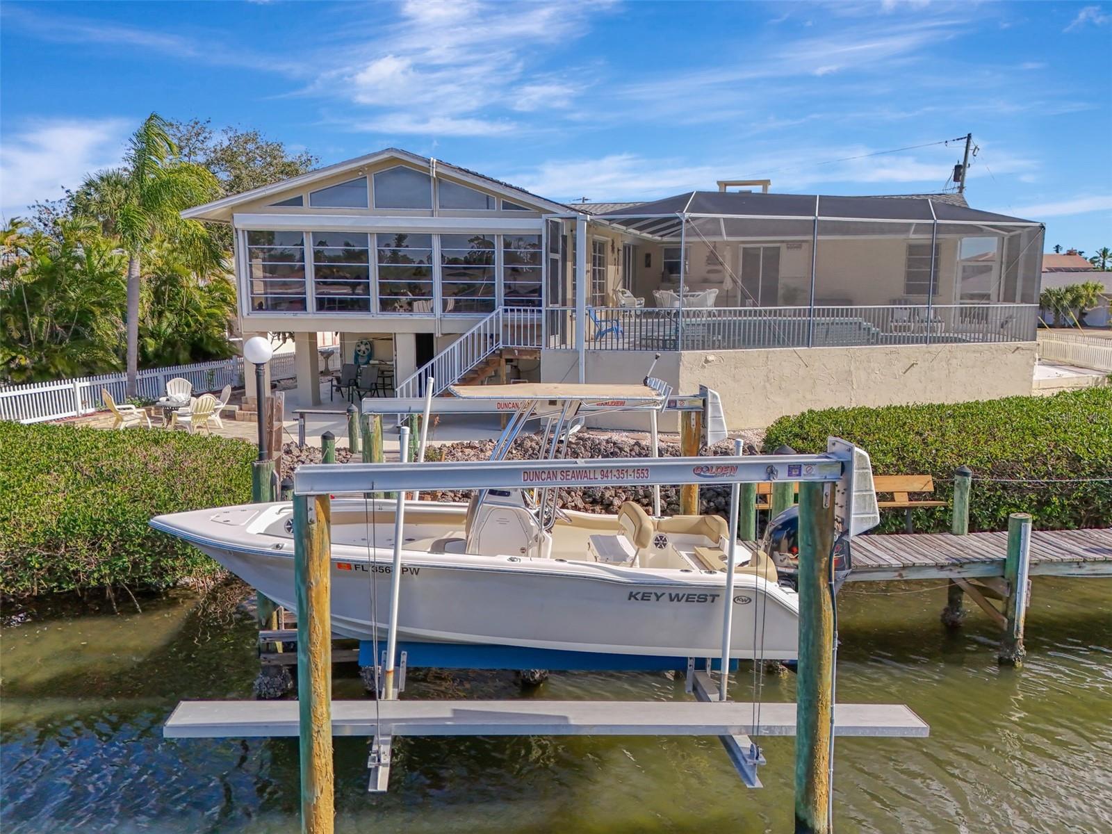 Welcome to your waterfront dream home in the highly sought-after Overbrook Gardens community in Englewood. Perfectly positioned on deep sailboat water with no fixed bridges, this elevated 3-bedroom, 3-bath residence offers direct access to Lemon Bay and the Gulf of Mexico, making it an ideal retreat for serious boaters and water lovers alike. Enjoy breathtaking sunset views and spectacular water vistas from the expansive elevated pool deck, where outdoor living takes center stage. The property features a 60' private boat dock complete with a 10,000-lb boat lift, offering effortless days on the water right from your backyard. Inside, the home impresses with a sprawling and thoughtfully designed layout, featuring three generously sized en-suite bedrooms, providing comfort, privacy, and flexibility for hosting guests. The kitchen is designed for both everyday living and entertaining, showcasing solid surface countertops, a large center island, and a wet bar, seamlessly flowing into the dining room highlighted by a cozy fireplace. A tranquil Florida room offers the perfect spot to enjoy quiet mornings or unwind in the evening while taking in peaceful surroundings. This home is well equipped for Florida living with electric Rolladen hurricane shutters on the west side and additional metal hurricane shutters for peace of mind. The two-car garage extends into a spacious lower-level basement area, ideal for storage, a workshop, or hobby space, and includes a window A/C unit. Situated on a quiet cul-de-sac, this exceptional waterfront property combines privacy, boating convenience, and the relaxed coastal lifestyle Englewood is known for. This is a rare opportunity to own a true boater's paradise in one of Englewood's most desirable waterfront neighborhoods.