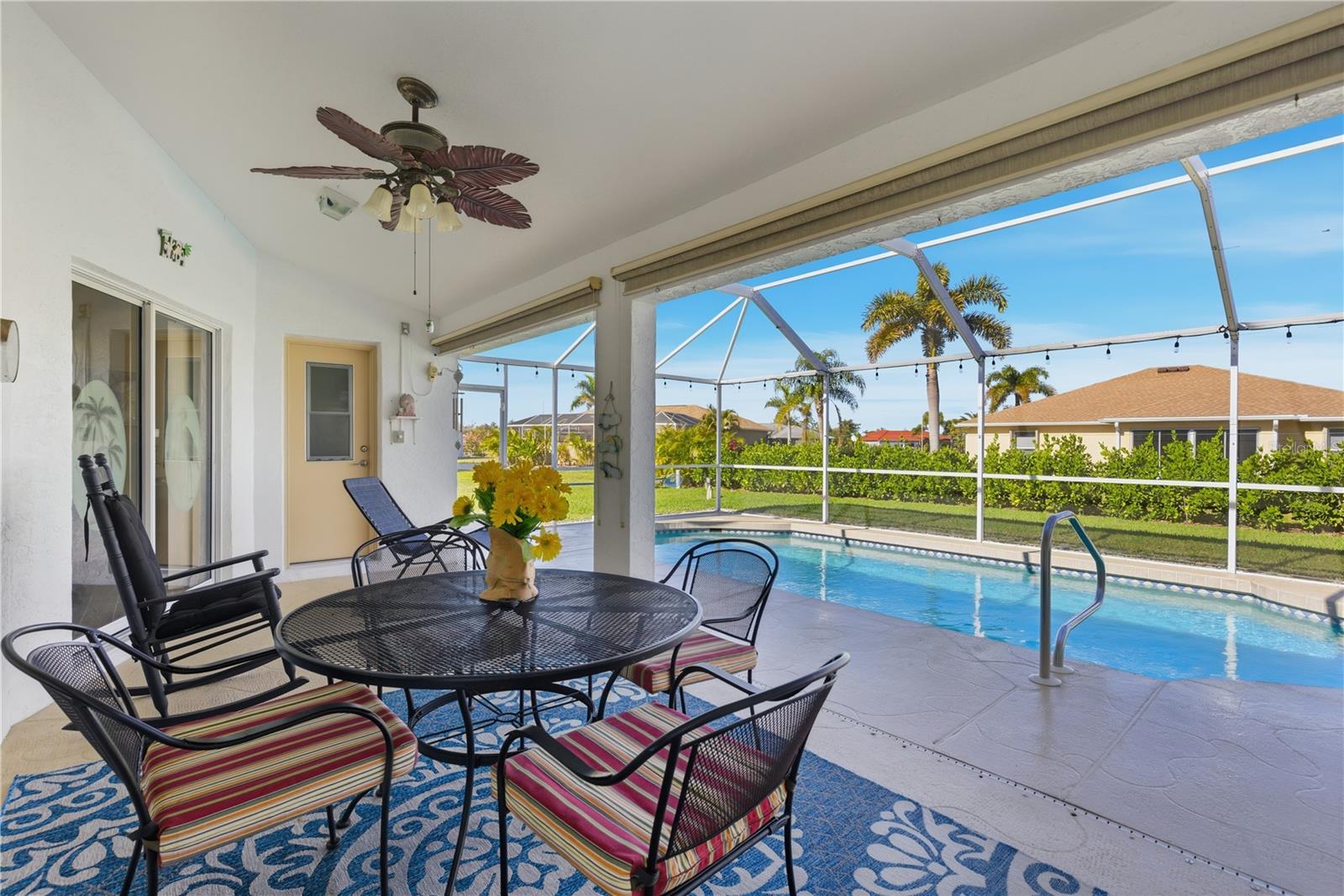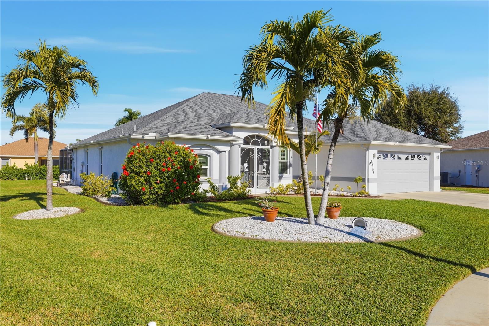 Welcome to this beautifully maintained 3-bedroom, 2.5-bath pool home with an oversized 2.5-car garage, ideally located in the sought-after Gardens of Gulf Cove community. From the moment you arrive, you'll appreciate the perfectly manicured lawn, mature landscaping, and pride of ownership throughout. Inside, the home features vaulted ceilings and a light, open split floor plan designed for both comfort and privacy. Triple sliding glass doors open to an impressive 52' screened lanai, creating a seamless indoor-outdoor living experience. The lanai offers a private pool and a beautiful covered sitting area, making it the perfect space for outdoor dining, relaxing, and entertaining year-round. The spacious primary suite includes an ensuite bathroom with his-and-her walk-in closets, a quartz vanity top, whirlpool tub, and plenty of natural light. Beautiful tile floors flow throughout the main living areas, while plantation shutters enhance the kitchen and dining room with timeless style. This home is thoughtfully equipped with impact windows, hurricane shutters, a deep well irrigation system, and built-in surge protection for added peace of mind. Additional features include a 12' x 16' wired storage shed, and the home is pre-wired for ADT security (not currently in use). Offering exceptional outdoor living, quality upgrades, and a prime location close to Gulf Coast beaches, shopping, and dining, this home is a true Florida gem ready to be enjoyed.
