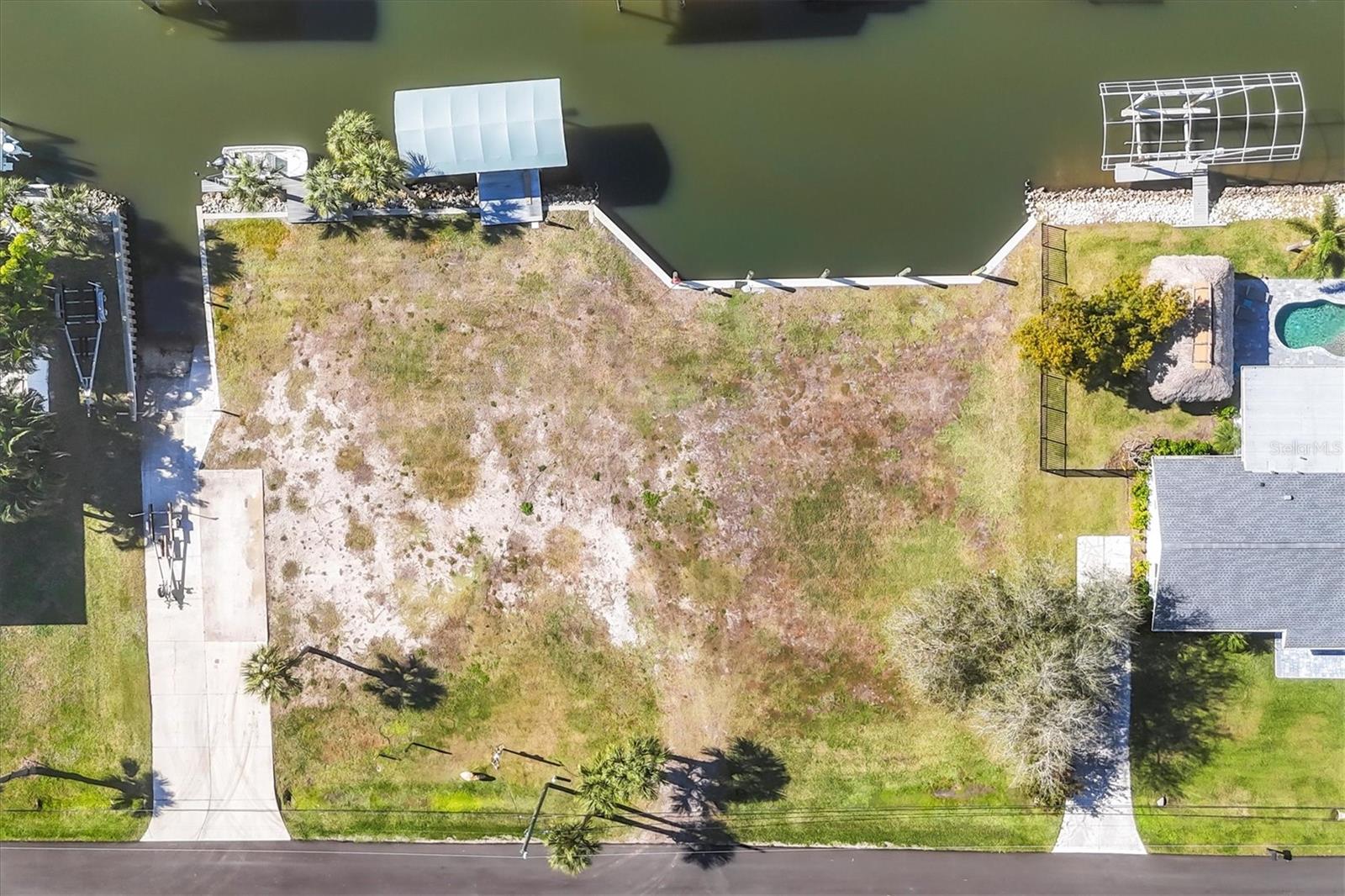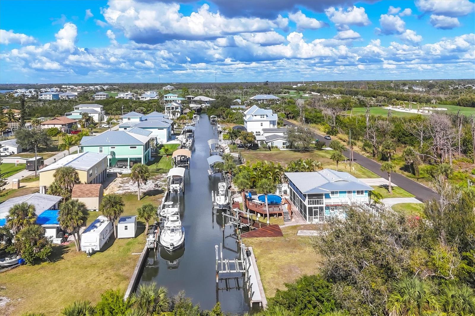 Unique opportunity to own a cleared .46-acre buildable DOUBLE LOT in Palm Point with DIRECT ACCESS to the ICW and Gulf with NO bridges to navigate by boat! This is not just vacant lots on a canal... Lot 9 comes with your own Private BOAT RAMP, a DOCK, a Boat LIFT and WATERFRONT shoreline featuring professionally installed riprap with a reinforced concrete cap, providing long-term erosion protection and a clean, finished appearance. The boat lift capacity is 12,000 to 15,000 lbs. with a new heavy duty hoist bottom and is supported by stainless steel pilings. Lot 8 has a new 90 Foot concrete SEAWALL and 5 new Mooring Pilings. This lot offers a generous BASIN with ample dockage for large watercraft up to about 40 Feet. Prefer to not own a boat and maybe rent out your boating spaces, there is no HOA to contend with in this nook of Englewood. Planning ahead and considering turning this amazing retreat into an AIRBNB? Your guests are steps away from the Cape Haze Marina and Freedom Boat Club and just minutes away by boat or in vehicle to numerous Tiki Bars, Restaurants, Live Entertainment, Fishing, Golfing and Beaches. Boating enthusiasts ...Don't hesitate on this rare opportunity to design your ultimate waterfront retreat in Paradise! Amazing opportunity to design your new custom-built home on a blank slate. Plenty of room to add a circular driveway and angle the pool side of your home facing our stunning SW Florida sunsets. End your day by sitting on your sundeck or taking a sunset boat ride out to Stump Pass. Love privacy and wildlife? On the frontside of your property you are facing Raymond Street. Embrace the serene woodlands and the sounds of nature. This land is located at the end of owned of a local golf course. Make your offer soon!
