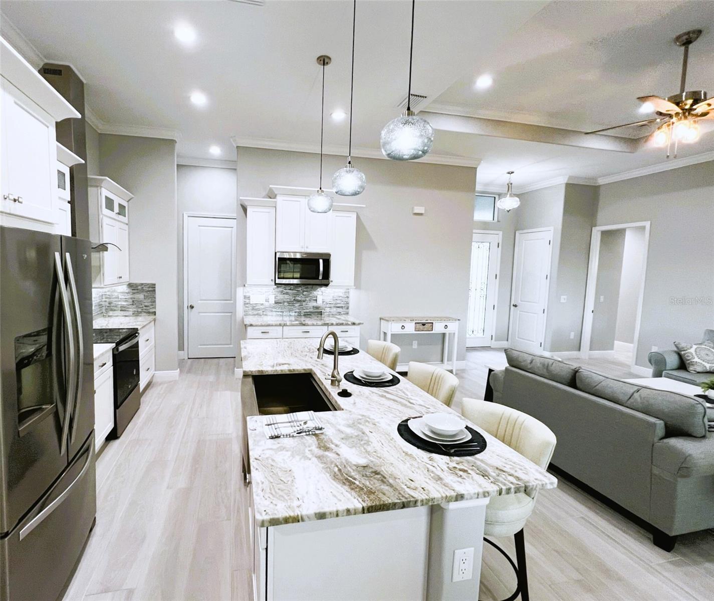 Welcome to your dream home in the heart of Rotonda West, Florida! This stunning recently constructed residence offers modern luxury living with thoughtful upgrades and Florida's signature indoor-outdoor flow, perfect for year-round enjoyment.Note the oversized paver driveway with ample parking space, then step inside to an open-concept great room that seamlessly blends the living area, dining space, and fabulous kitchen. Bathed in natural light from expansive pocketing sliding glass doors, the space feels bright and airy with elegant neutral gray tones, tray ceilings, and stylish ceiling fans throughout.The kitchen is a showstopper, featuring a large center island, luxurious stone countertops, white shaker cabinetry, stainless steel appliances and a sleek farmhouse sink. Pendant lighting and glass globe fixtures add a touch of sophistication.The home boasts 3 spacious bedrooms, including a serene primary suite with tray ceilings, direct access to the outdoor oasis, and a spa-like ensuite bathroom complete with a walk-in shower featuring gray tile, vibrant teal accents, a modern rain showerhead in addition to the wall mounted hand-held, and a luxurious huge bench.The true highlight is the expansive screened lanai and private pool -- your personal tropical retreat! Enjoy Florida's beautiful weather in the fully enclosed, paver-surrounded outdoor living space with plenty of room for lounging, dining, and entertaining. The oversized 16,000 sq ft lot provides plenty of additional yard space for other outdoor activities as well.This move-in-ready gem combines contemporary elegance with the best of Florida lifestyle living. Don't miss your opportunity to own this exceptional property -- schedule your private tour today! All windows and doors are impact rated.***The home has never been occupied, it has been used as a builder's model home and the garage is set up to be used as an office, including 2 mini-split A/C units.