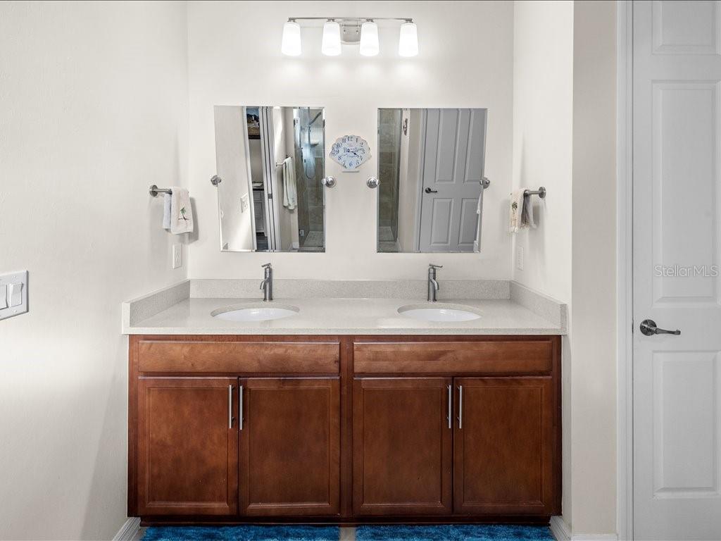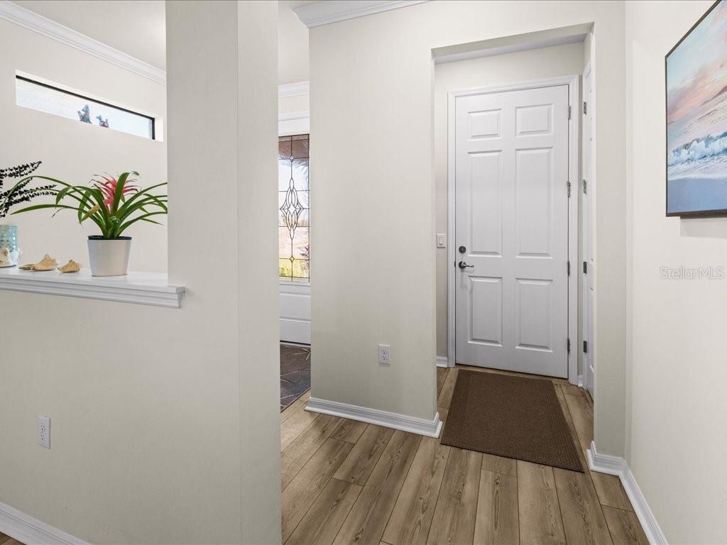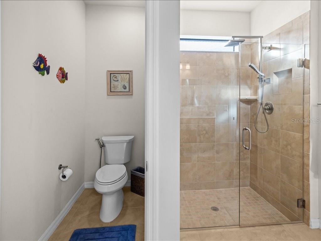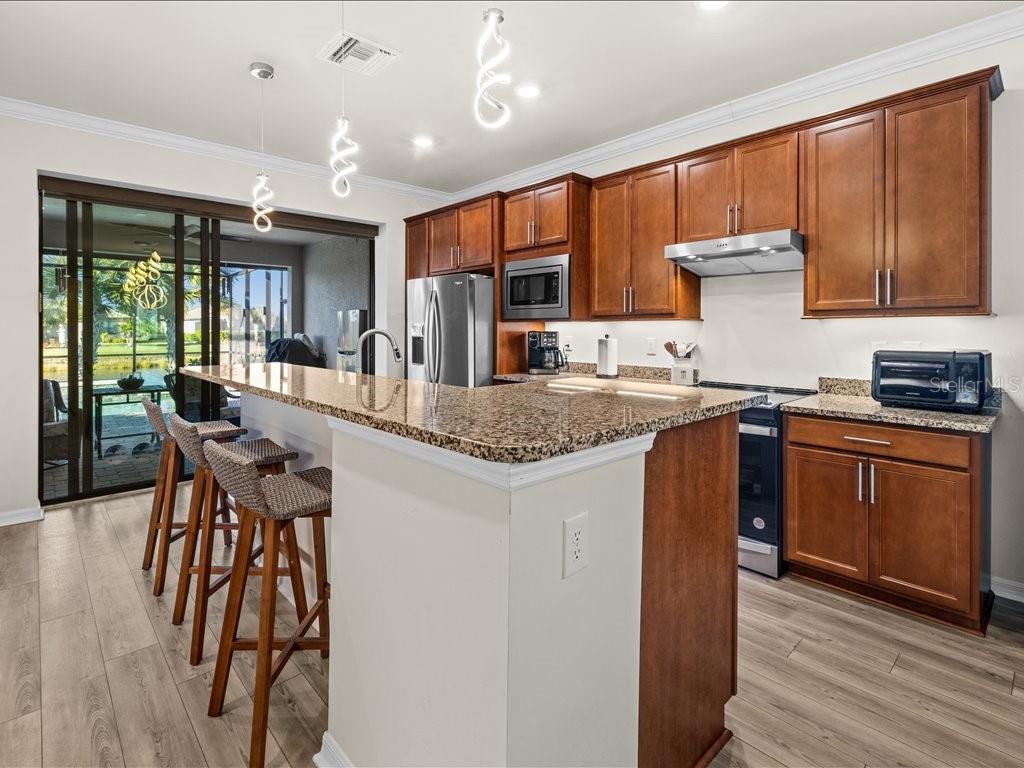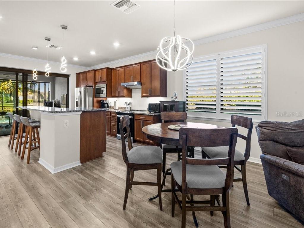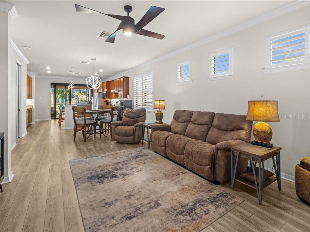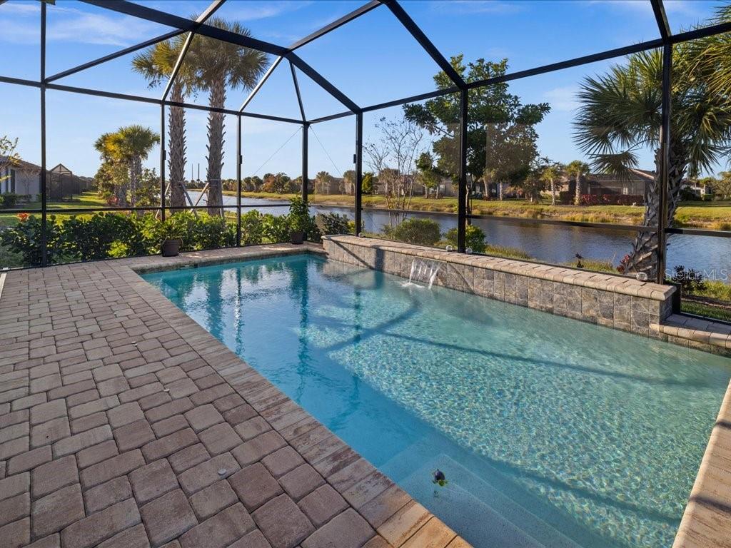 Live the Florida lifestyle you've been dreaming of in this beautifully appointed 3-bedroom, 2-bath home situated on a corner lot located in the highly desirable IslandWalk at the West Villages in Venice. From the moment you step through the decorative glass front door, your eyes are drawn through the open living space to the sliding glass doors and out to the heated saltwater pool overlooking a tranquil lake--the perfect setting for morning coffee, sunset swims, or entertaining friends. The pool boast of a built up wall, waterfall and the upgraded lighting. It has been plumbed for an outdoor kitchen. Electric rolling Impact Ultra Shield Screens and hand override were installed on the lanai. Clear guard storm panels for all windows.The thoughtfully designed kitchen blends style and function with granite countertops, upgraded cabinetry, stainless steel appliances, under-cabinet lighting, a raised dishwasher, pull-out cabinet trays, and a built-in trash bin.The primary suite is a private retreat featuring a custom walk-in closet, spa-like bath with double vanity, private water closet, and a walk-in shower with a rain showerhead. Two guest bedrooms and a well-appointed guest bath provide comfort and privacy for family or visitors. Additional highlights include a laundry room with cabinetry, sink, and a convenient pass-through laundry chute, crown molding and plantation shutters throughout, smart-home wiring, and a digital front door lock. The recently epoxied two-car garage includes upgraded shelving for ample storage.Enjoy resort-style living in a peaceful lakefront setting--this home truly has it all.IslandWalk Amenities: Gated, resort-style community with clubhouse, lagoon & lap pools, spa, fitness center, pickleball & tennis courts, bocce, walking/biking trails, dog parks, playground, and year-round social activities. Maintenance-free living with lawn care included and convenient access to Wellen Park