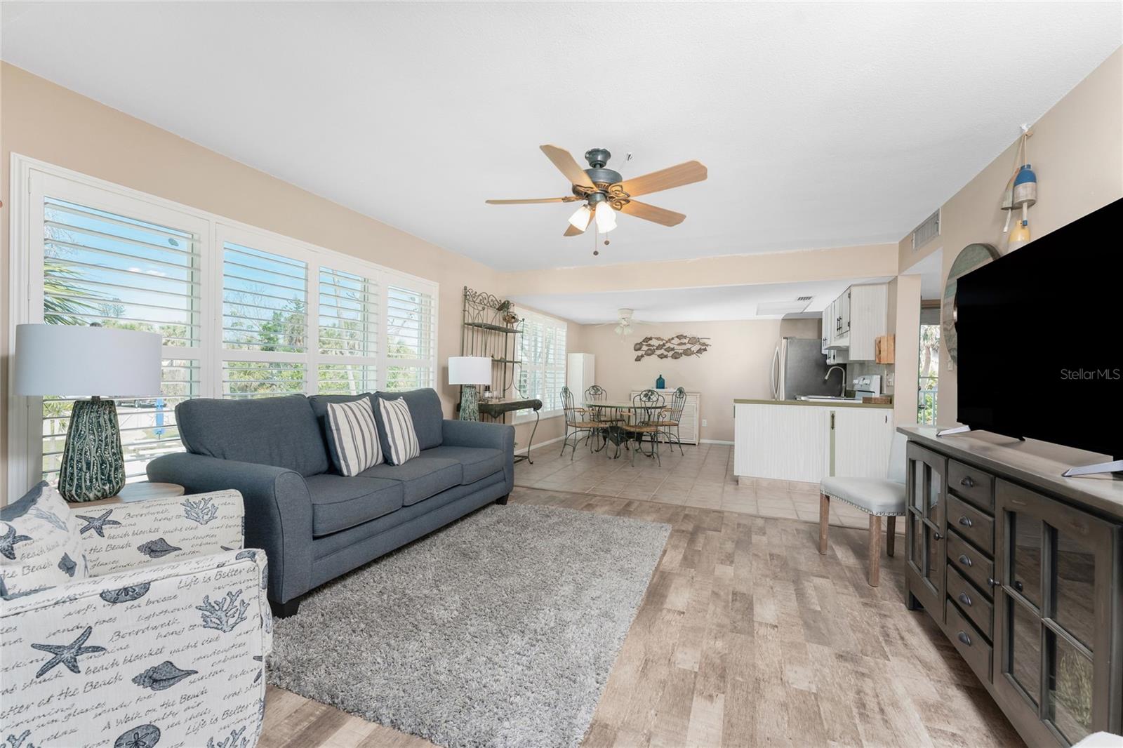Imagine starting your mornings on Manasota Key, where salty breezes drift through your windows, the pace is unhurried, and each day revolves around sunshine, water, and relaxation. This coastal inspired end unit condo is located in the popular Tiki Bayfront community and offers an easygoing lifestyle from the moment you arrive. Offered turnkey furnished, this two bedroom, one bathroom residence features impact windows for peace of mind and a bright, open layout designed for comfortable coastal living. Ceramic tile and wood look laminate flooring flow throughout the main living areas and bathroom, while natural light fills the space through oversized windows in both the living room and kitchen. Plantation shutters add coastal charm and allow you to control the light while enjoying beautiful views of the community pool. The kitchen offers generous counter space and a cozy breakfast nook that opens to the living area, making it ideal for casual meals. Both bedrooms feature large reach in closets and provide inviting spaces to unwind at the end of the day. Whether you are looking for a full time residence, a weekend retreat, or an income producing property, this condo offers flexibility with no rental restrictions in place. Community amenities include a heated pool with lounge chairs, shaded seating areas, a BBQ grill area for outdoor dining, community laundry facilities, and an all new community dock along the seawall on Lemon Bay, perfect for tying up your boat and enjoying the waterfront setting. At this condo, you can easily enjoy the best of island living! Englewood Beach, waterfront dining, and fun tiki bars are just 1.5 miles away. Historic Dearborn Street is five miles from home, and Wellen Park, home of Atlanta Braves spring training plus plenty of shopping and dining options, is an easy drive. This is a place where life slows down, sunsets become part of your routine, and coastal living feels effortless. Experience it for yourself at 5055 N. Beach Road on Manasota Key.