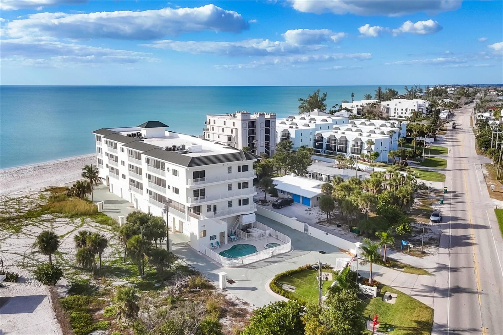 GULF FRONT, DIRECT BEACHFRONT LIVING! Rarely available top-floor residence in the intimate Gulf Island Strand, a boutique building with only 11 units located directly on the sands of Manasota Key. Wake up to breathtaking Gulf views, enjoy morning coffee on your private lanai as dolphins play in the surf, and unwind each evening with stunning sunsets over the water. This beautifully maintained 3-bedroom, 2-bath, plus half-bath condo offers over 1,800 square feet of thoughtfully designed living space with an open floor plan that captures panoramic views from nearly every room. The kitchen has an island and features quartz countertops, updated cabinetry, new appliances, and two pantries, providing exceptional storage and functionality. The living area is ideal for entertaining, complete with 9' tray ceilings, a wet bar, and a spacious lanai that easily accommodates guests. The primary suite is a true retreat with direct lanai access and a spa-inspired en suite bath offering a roman shower, jetted soaking tub, and dual-sink vanity. A split-bedroom layout places two generously sized guest bedrooms near a well-appointed guest bath, while an additional half bath is conveniently located near the foyer. The dedicated laundry room is conveniently located off the kitchen behind a pocket door and features extra storage and a utility sink. This turn key fully furnished residence is move-in ready! Additional features include impact-rated windows and doors, a private 2-car garage perfect for your car and gulf cart, as well as an additional storge room for your beach gear and tools! Gulf Island Strand residents enjoy a heated community pool and spa, fitness room, and a community room with kitchenette and pool table, along with private beach access. Immaculately maintained and ideally positioned, this exceptional beachfront condo offers the very best of island living. Live the dream, your Manasota Key beachfront lifestyle awaits.