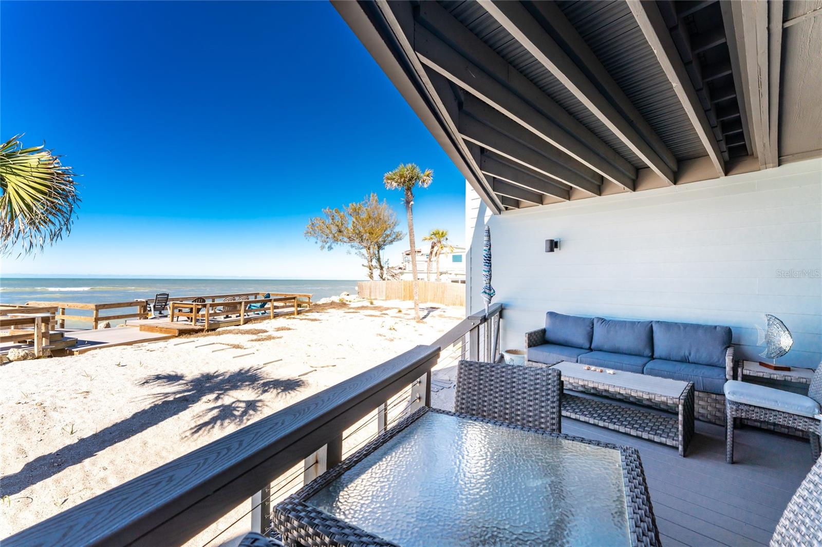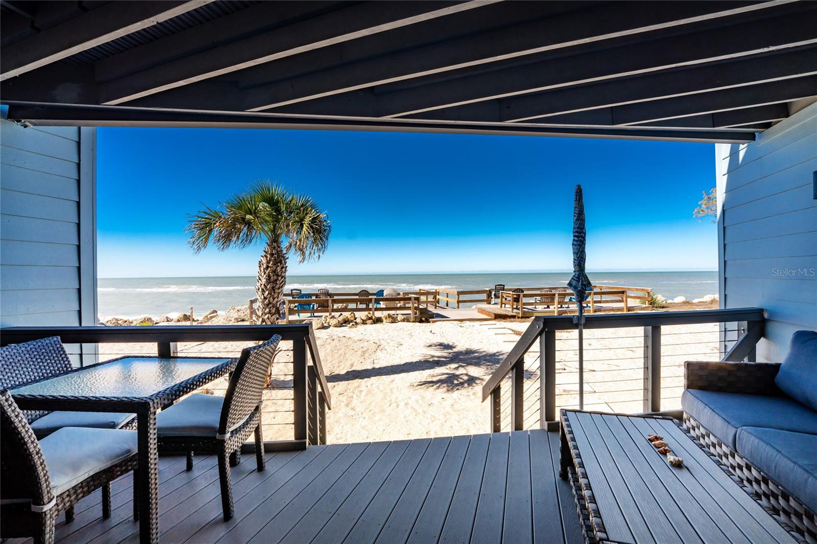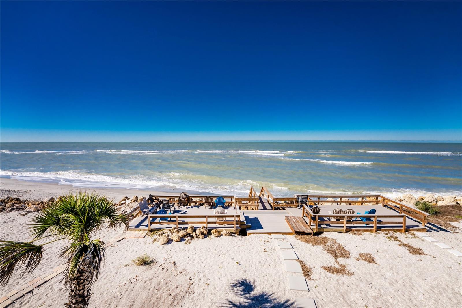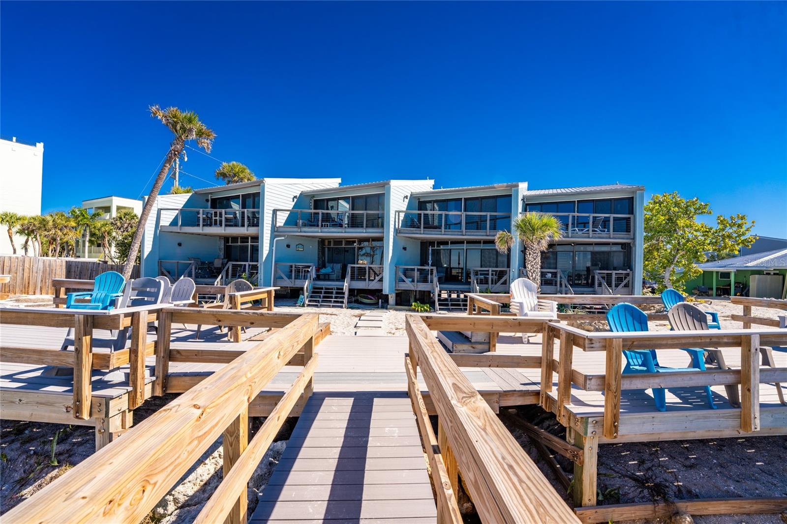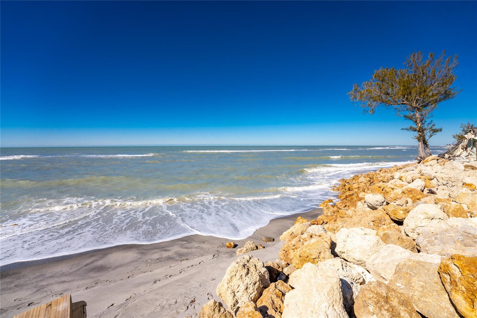 Welcome to Banyan Bluff Condominiums, a private four-residence townhome community set directly along the Gulf front of Manasota Key in Englewood, Florida. This lovely 3-bedroom, 2-bath multi-level townhome offers privacy and a tranquil atmosphere, positioned on more than an acre and comfortably set back from North Beach Road for added seclusion. The first living level is elevated on pilings approximately 16 feet above sea level, and the layout maximizes sweeping Gulf views and breathtaking sunsets from most rooms. A covered balcony off the main living area creates an inviting indoor-outdoor living space, ideal for dining outside or unwinding at day's end. The beautifully updated kitchen includes new stainless steel appliances and quartz countertops. Upstairs, the top floor primary bedroom suite offers a vaulted ceiling, walk-in closet, an updated en-suite bathroom, and recently replaced storm-rated sliders that open to a private open balcony overlooking the Gulf. Both guest bedrooms include storm-rated windows and the guest bathroom is located just beyond the kitchen and adjoining dining area. Convenient parking includes two under-building spaces and an EV charging port. The tiled entry foyer includes an adjoining utility room with a new washer/dryer, utility sink and room for storage. The townhome is being offered turnkey furnished. Whether you choose to make it your own or place it in a rental program, this condo offers outstanding versatility. Banyan Bluff residents also enjoy a Gulf-front wooden deck, perfect for soaking up the sun or enjoying evening sunsets. Other notable updates include a metal roof in 2023, a newer electrical panel, and tankless water heater. A rare opportunity to own a stunning beachfront townhome in a quiet, exclusive setting.