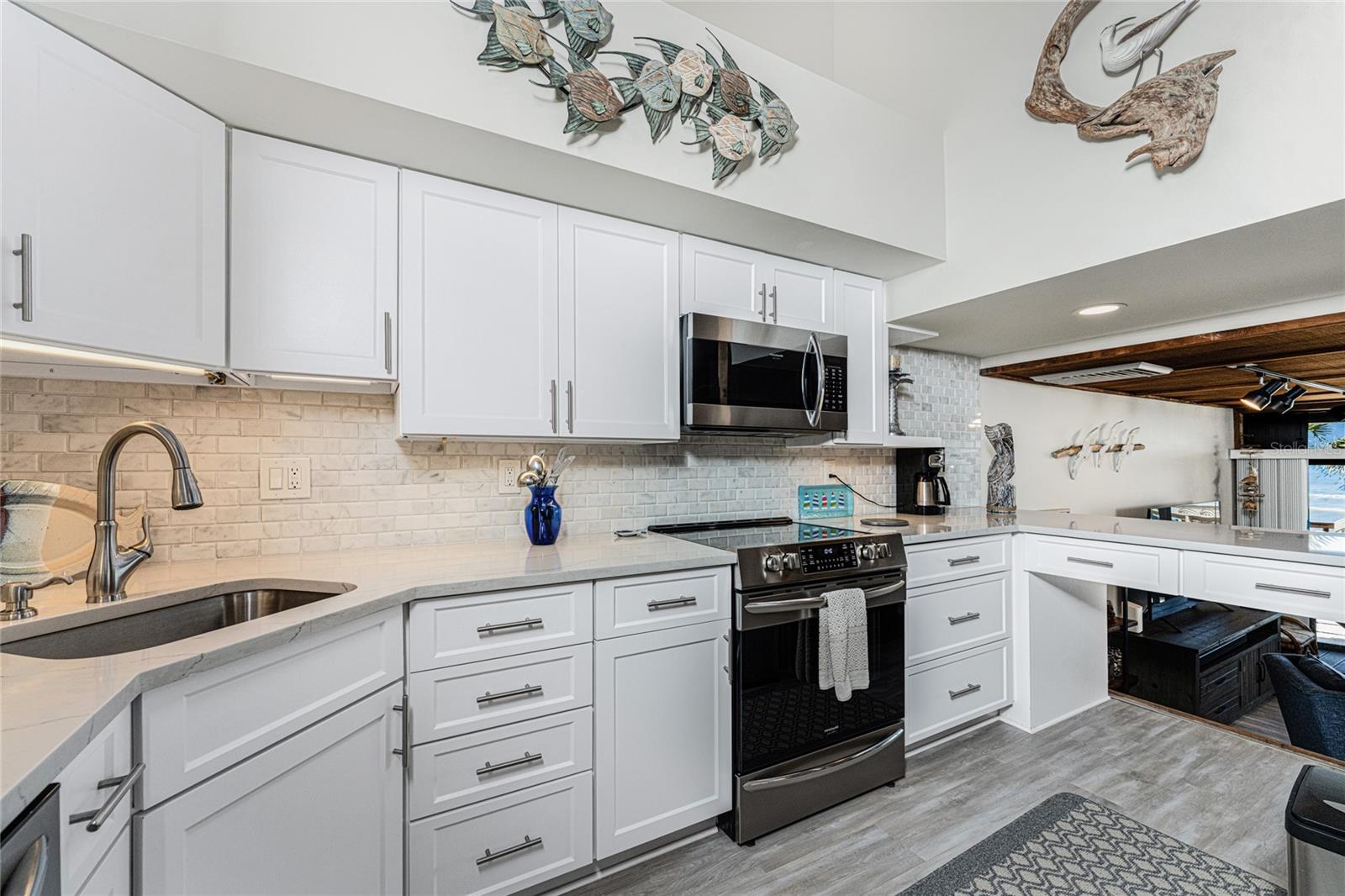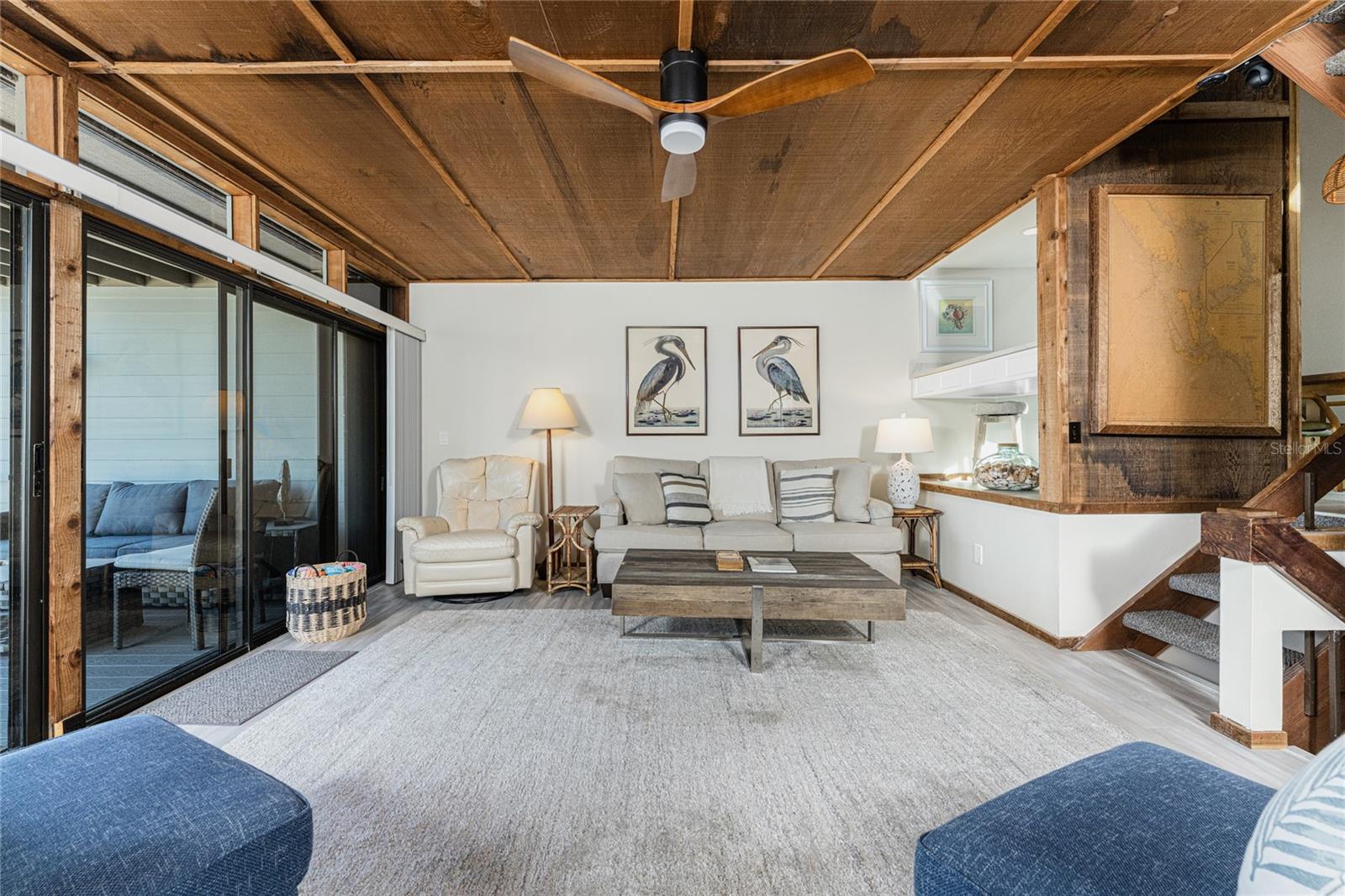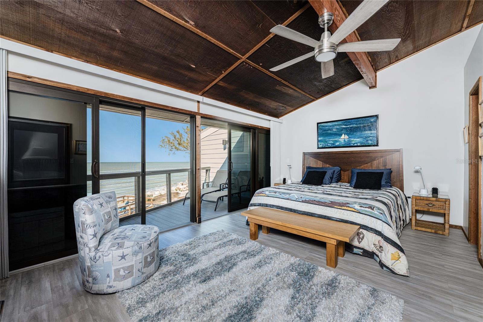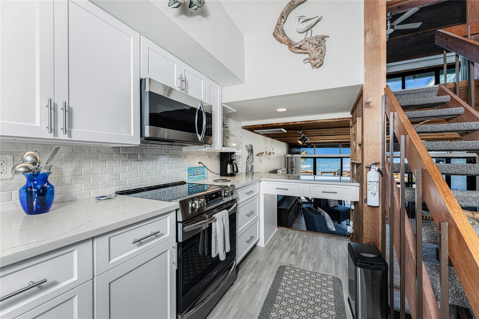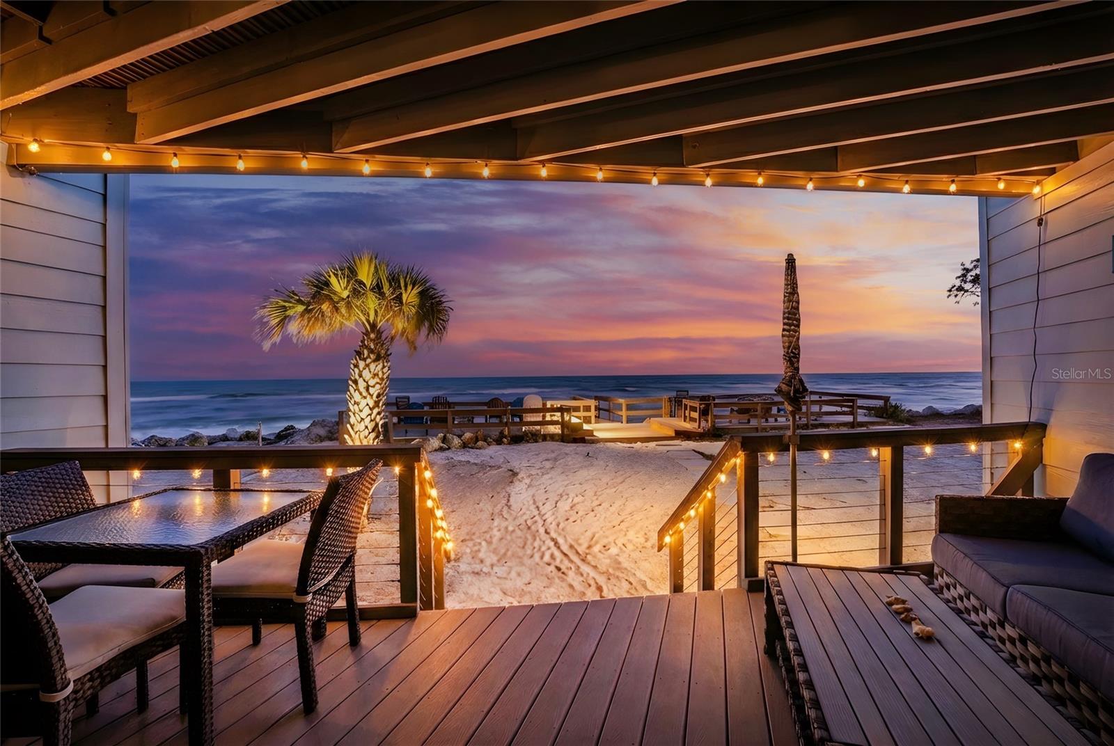 Welcome to Banyan Bluff Condominiums, a private four-residence townhome community set directly along the Gulf front of Manasota Key in Englewood, Florida. This lovely 3-bedroom, 2-bath multi-level townhome offers privacy and a tranquil atmosphere, positioned on more than an acre and comfortably set back from North Beach Road for added seclusion. The first living level is elevated on pilings approximately 16 feet above sea level, and the layout maximizes sweeping Gulf views and breathtaking sunsets from most rooms. A covered balcony off the main living area creates an inviting indoor-outdoor living space, ideal for dining outside or unwinding at day's end. The beautifully updated kitchen includes new stainless steel appliances and quartz countertops. Upstairs, the top floor primary bedroom suite offers a vaulted ceiling, walk-in closet, an updated en-suite bathroom, and recently replaced storm-rated sliders that open to a private open balcony overlooking the Gulf. Both guest bedrooms include storm-rated windows and the guest bathroom is located just beyond the kitchen and adjoining dining area. Convenient parking includes two under-building spaces and an EV charging port. The tiled entry foyer includes an adjoining utility room with a new washer/dryer, utility sink and room for storage. The townhome is being offered turnkey furnished. Whether you choose to make it your own or place it in a rental program, this condo offers outstanding versatility. Banyan Bluff residents also enjoy a Gulf-front wooden deck, perfect for soaking up the sun or enjoying evening sunsets. Other notable updates include a metal roof in 2023, a newer electrical panel, and tankless water heater. A rare opportunity to own a stunning beachfront townhome in a quiet, exclusive setting.