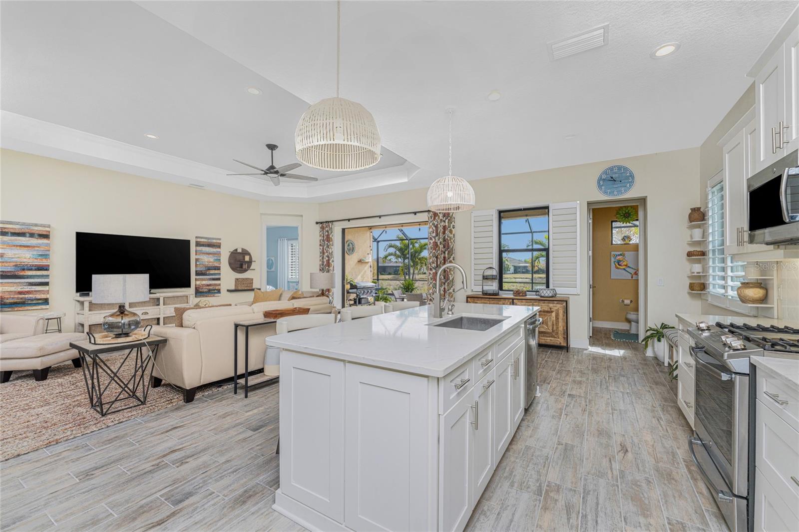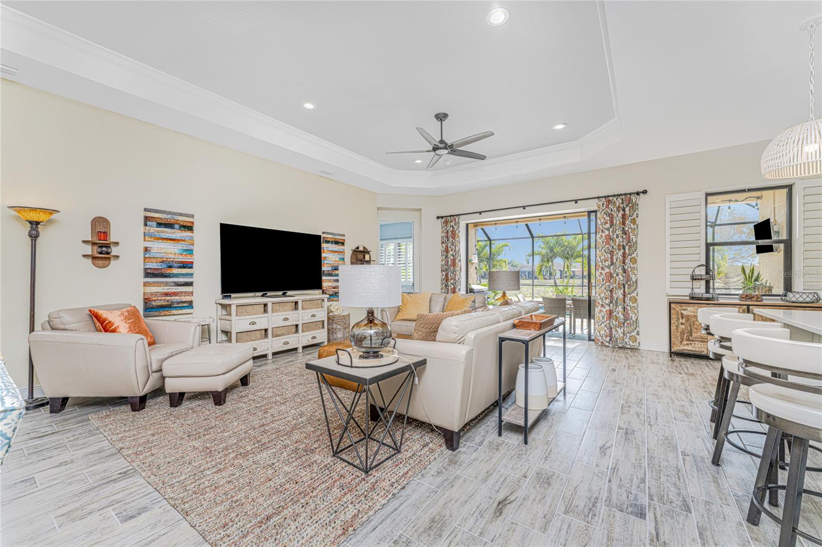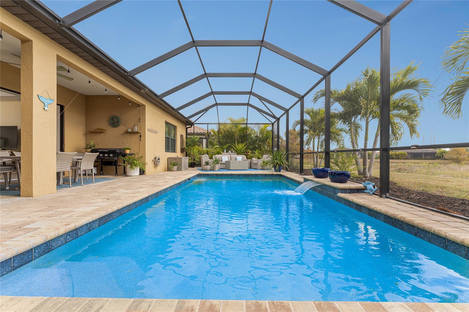 Set within the desirable, gated enclave of Boca Royale, this thoughtfully designed residence is one that truly must be experienced in person to be fully appreciated. Set on a peaceful lake with SUNRISE VIEWS, the home offers a sense of privacy, calm, and understated luxury that unfolds room by room. Upon arrival at 26853 Weiskopf Drive, the care and intention behind every detail are immediately evident with upgraded 8-foot doors, coffered ceilings, pocketing sliding glass doors and porcelain plank tile throughout the main space with a serene color palette and cohesive design flow. The OPEN-CONCEPT GREAT ROOM is designed for easy living and effortless entertaining, anchored by a gourmet kitchen featuring an expansive island, London Sky quartz countertops, stainless steel appliances, a GAS RANGE, and generous dining space. Behind elegant French doors, a FLEXIBLE DEN offers the option of a home office, sitting room, or THIRD BEDROOM when needed. The PRIMARY SUITE is both inviting and refined, showcasing a tray ceiling, abundant natural light, peaceful backyard views, a large walk-in closet, and a spacious ensuite bath with dual vanities, walk-in shower, and private water closet. A well-sized guest bedroom and adjacent guest bath are tucked away down a separate hallway, offering comfort and privacy for visitors. Additional features to note include the interior laundry room, plantation shutters and the desirable POOL BATH. The home's appeal extends seamlessly outdoors, where the EXTENDED, FULLY SCREENED LANAI captures a rare and picturesque blend of lake and marshland views--an ever-changing natural backdrop with birds wading and gliding through the landscape. Ample shaded and sunlit seating surrounds the CUSTOM HEATED SALTWATER POOL WITH WATERFALL, creating an ideal setting for both quiet mornings and relaxed gatherings. Whether returning from a round at the 18-hole semi-private golf course, a tennis match, or a day at the nearby beaches, this outdoor space invites you to unwind. Residents also enjoy access to the RESORT-STYLE POOL, CLUBHOUSE, AND HOT TUB, ALL INCLUDED IN THE HOA, ALONG WITH LAWN CARE AND IRRIGATION. Boca Royale Golf & Country Club further enhances the lifestyle with pickleball courts, a fitness center, dog park, and a beautifully renovated full-service clubhouse with restaurant. A home defined by setting, comfort, and thoughtful design--this is one best appreciated in person. PEACE OF MIND comes with the concrete tile roof, whole home hurricane protection, all new insulation and X FLOOD ZONE! FURNISHINGS NEGOTIABLE.