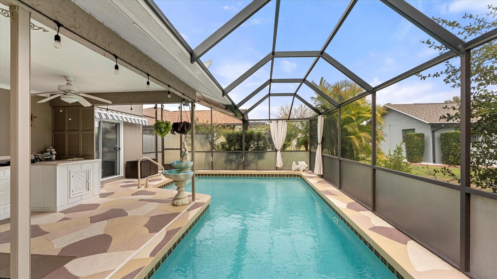 Life is spectacular at Gulf View Estates, where residents enjoy being less than three miles from Manasota Key Beach and the public boat ramp. This thoughtfully updated pool home offers two bedrooms and two bathrooms and is located in the X flood zone, providing added peace of mind. Mature landscaping and a welcoming walkway lead to the screened entry, where double glass doors open into a light and inviting interior. Vaulted ceilings, a skylight, and a chandelier immediately create a warm sense of arrival. The open floor plan connects the great room, formal dining area, and kitchen, making the home ideal for both everyday living and entertaining. A brick fireplace adds character to the great room, while a triple set of French doors fills the space with natural light and opens to the outdoor living area. The galley-style kitchen is both functional and inviting, featuring wood cabinetry, granite countertops, a glass tile backsplash, and a tray ceiling with crown molding. A cozy breakfast nook includes two sets of sliding doors, offering easy access to the pool and lanai. The formal dining area is accented by a bay window and chandelier, creating an elegant setting for meals and special gatherings. The ensuite primary bedroom features vaulted ceilings and French doors that bring in abundant natural light. A walk-in closet provides generous storage, and the ensuite bathroom is designed for comfort with a spacious walk-in shower that includes dual skylights, multiple showerheads, built-in niches, and a convenient fold-down seat. On the opposite side of the home, the guest suite offers privacy and includes sliding doors that open directly to the pool area. The nearby guest bathroom features a uniquely designed fully tiled shower with sliding doors that also provide access to the lanai. Built-in cabinetry and a laundry sink in the separate laundry room add valuable storage and functionality. Outdoor living is truly exceptional. The partially covered and screened lanai features custom concrete flooring, ceiling fans, and an outdoor kitchen complete with a wet bar and Jenn-Air grill. An outdoor shower, a thoughtfully designed corner heated pool, privacy screening along the lower portion of the cage, an open area with a roll-out awning, and mature landscaping surrounding the enclosure create a private and relaxing retreat. Additional highlights include a 2021 roof, a 2020 air conditioning system, and an upgraded electrical panel. Located in the well-established Gulf View Estates community, this home offers close proximity to Venice, where beaches, boating, fishing, dining, and year-round events define the Florida lifestyle. With no CDD fees and a low annual HOA fee to keep the community beautiful, this pet friendly residence offers both comfort and convenience. Everything comes together beautifully at 5859 Monroe Road, a place designed for relaxed living, easy entertaining, and enjoying the very best of coastal Florida.