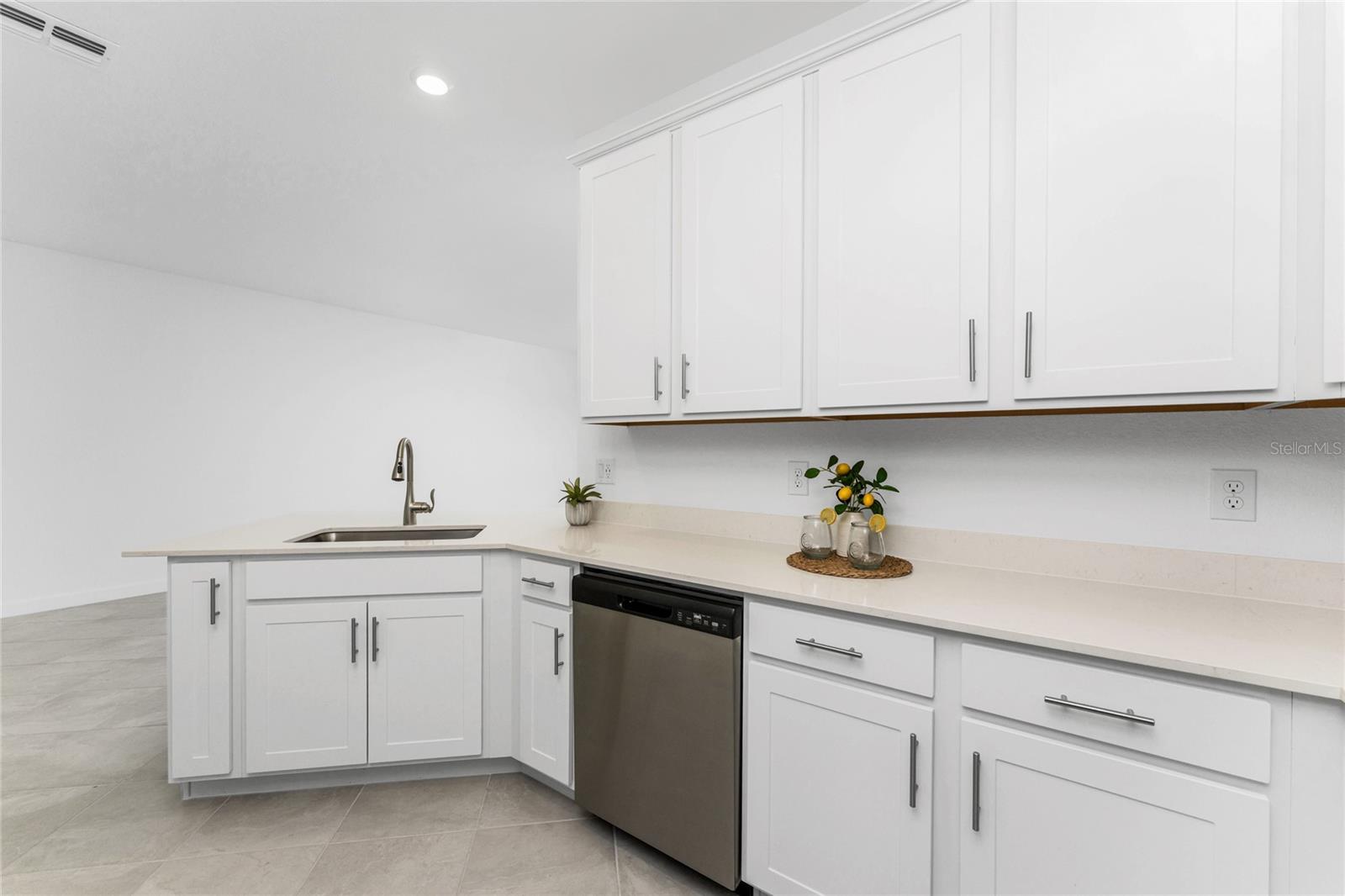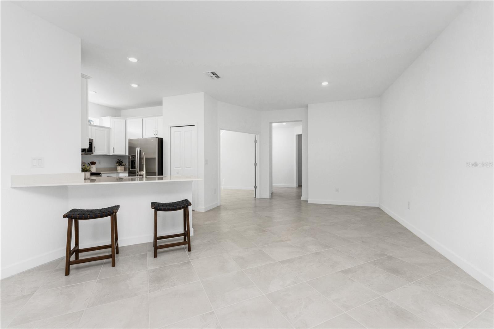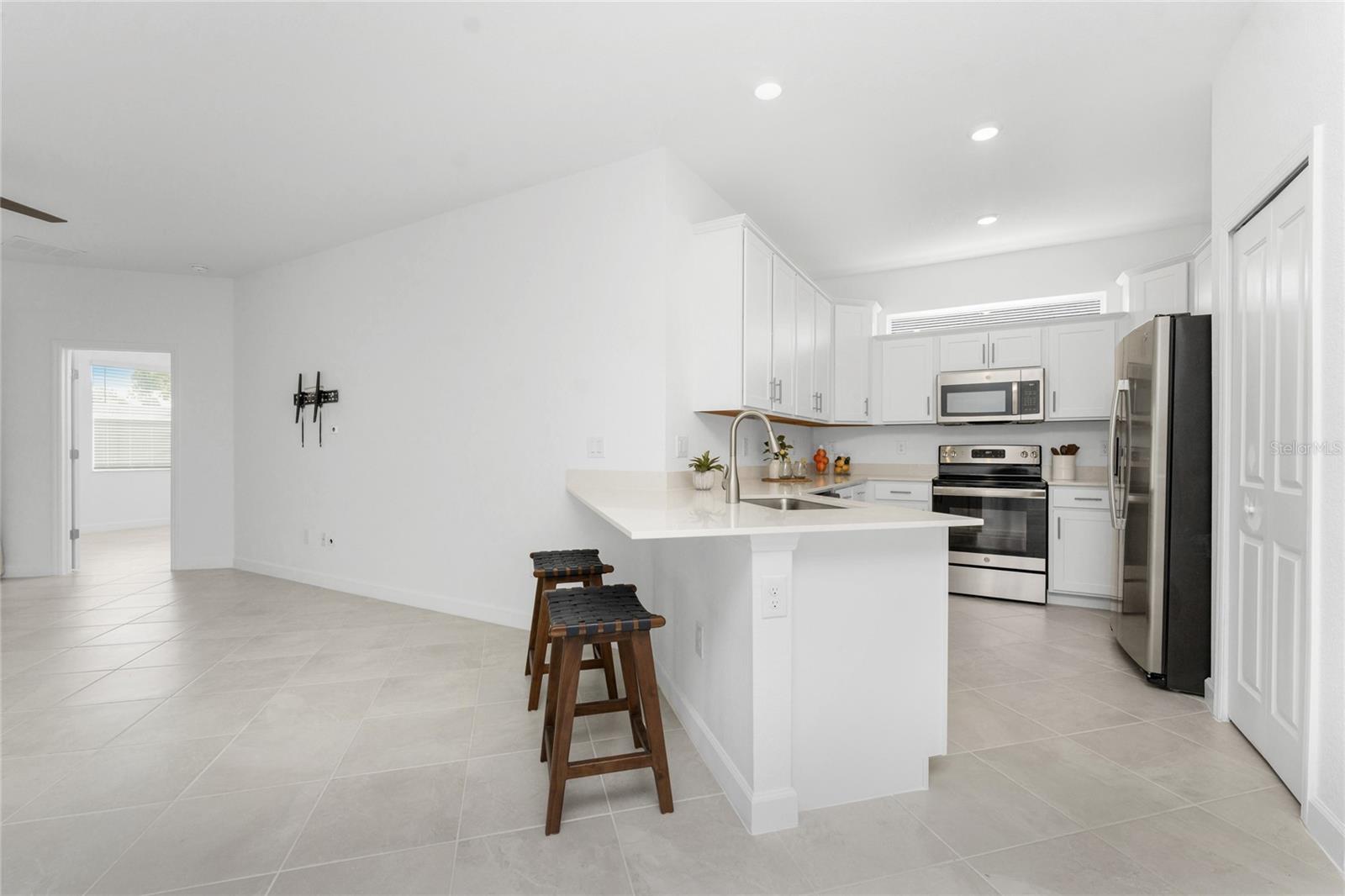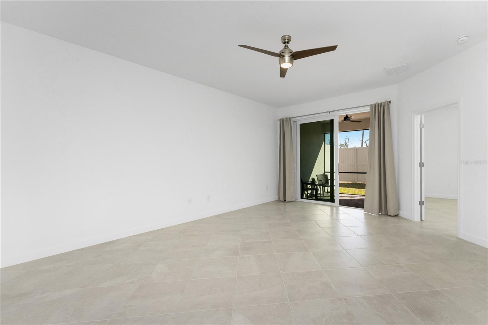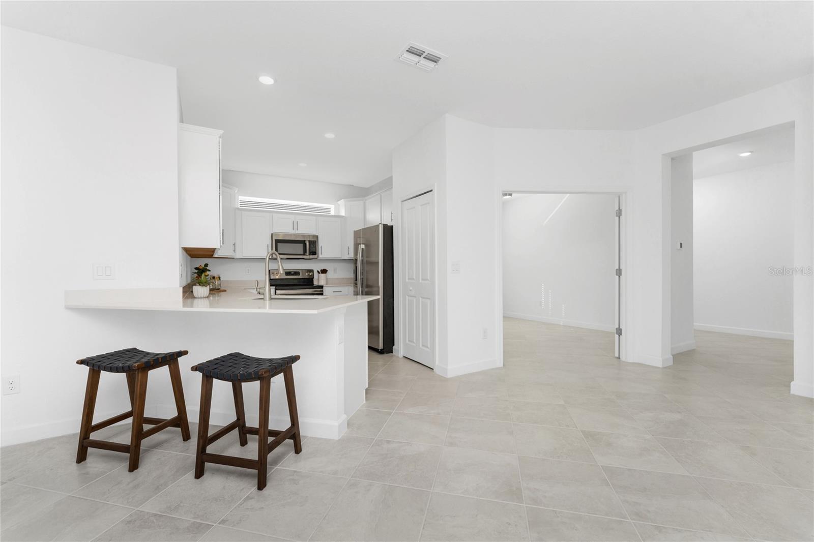Welcome to Palm Lake at Coco Bay, a gated, master planned community in Englewood where coastal living meets modern, easy comfort. Built in 2024 by Lennar Homes, this beautifully maintained three bedroom plus den, two bathroom villa is ideal for anyone seeking a low maintenance, active Florida lifestyle. As an added bonus, this property has a Letter of Map Revision from FEMA, moving it into the X Flood Zone. A paver driveway sets the tone as you arrive, leading into a bright, open layout that is very welcoming. Diagonally set tile flooring flows throughout the home, there are impact windows and doors, and a like new condition that lets you move right in and start enjoying the good life. The kitchen is designed for both everyday living and entertaining, opening seamlessly to the great room and featuring quartz countertops, an abundance of white shaker style cabinetry, a breakfast bar, and a spacious closet pantry. Sliding glass doors extend the living space outdoors to a covered, screened paver lanai, the perfect spot to enjoy a quiet morning with a book or unwind in the evening with your favorite cocktail. The ensuite primary bedroom is a peaceful retreat, offering a walk-in closet, a walk-in shower, and dual separate quartz topped vanity sinks. The guest bedroom includes a reach-in closet, while the guest bathroom features a quartz topped vanity and a shower tub combination, ideal for visiting friends or family. An interior laundry room adds convenience along with extra storage space. Life at Palm Lake at Coco Bay is all about balance. The community offers a vibrant blend of relaxation and activity, with a clubhouse, resort style pool, and pickleball courts that make it easy to meet neighbors and enjoy friendly competition. Sidewalk lined streets invite evening strolls and morning walks, adding to the welcoming neighborhood feel. Quarterly HOA fees cover lawn maintenance, irrigation, and internet, allowing you more time to enjoy everything Southwest Florida has to offer. Located at 8117 Shore Lake Drive, this home is conveniently less than six miles from the beach and offers easy access to shopping, dining, and entertainment in both Englewood and Boca Grande. This is Florida living done right, simple, stylish, and designed for enjoying every day.