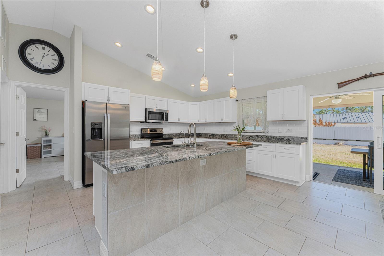 Like-New 2023 Built North Port Home Close to Shopping, Dining, and I-75 Convenience! This three bedroom, two bathroom home offers an open, split floor plan and sits on an oversized lot with a fully privacy fenced backyard, providing plenty of space and privacy with room to add a pool. Inside, tile flooring runs consistently throughout the home, creating a cohesive look while offering easy maintenance. The great room features vaulted ceilings and is filled with natural light, while the formal dining area and kitchen both open to the main living space, creating an ideal layout for everyday living and entertaining. Sliding glass doors lead to the screened lanai, allowing for easy indoor and outdoor gatherings. The chef in the family will appreciate the spacious kitchen featuring abundant white shaker-style, full-overlay cabinets with soft-close features, generous granite countertop space, a glass tile backsplash, stainless steel appliances, and a center island perfect for meal prep and keeping everything organized. The spacious ensuite primary bedroom includes a walk-in closet, while the primary bathroom offers dual sinks, granite countertops, and a fully tiled walk-in shower. Both guest bedrooms are nicely sized with reach-in closets, and the guest bathroom is thoughtfully designed with a tub and shower combination and a granite-topped vanity. An interior laundry room adds convenience with built-in cabinetry and a laundry sink for chores and organization. Outside, evenings on the lanai are especially enjoyable, with panoramic screens that can be raised to allow a great breeze to roll through while enjoying the quiet neighborhood setting. The expansive backyard offers endless possibilities for future expansion, a pool, sports courts, shed, or whatever suits your lifestyle. Built with comfort and peace of mind, the home features hurricane impact, insulated, low-E windows and durable 30-year shingles. Located at 5262 Gaghagen Street, this home places you close to everything North Port has to offer. With easy access to Sumter Boulevard and I-75, commuting to Sarasota, Tampa, Fort Myers, and beyond is simple and convenient. You will also enjoy being near shopping, dining, Wellen Park, and just a short drive from the beautiful Gulf beaches.
