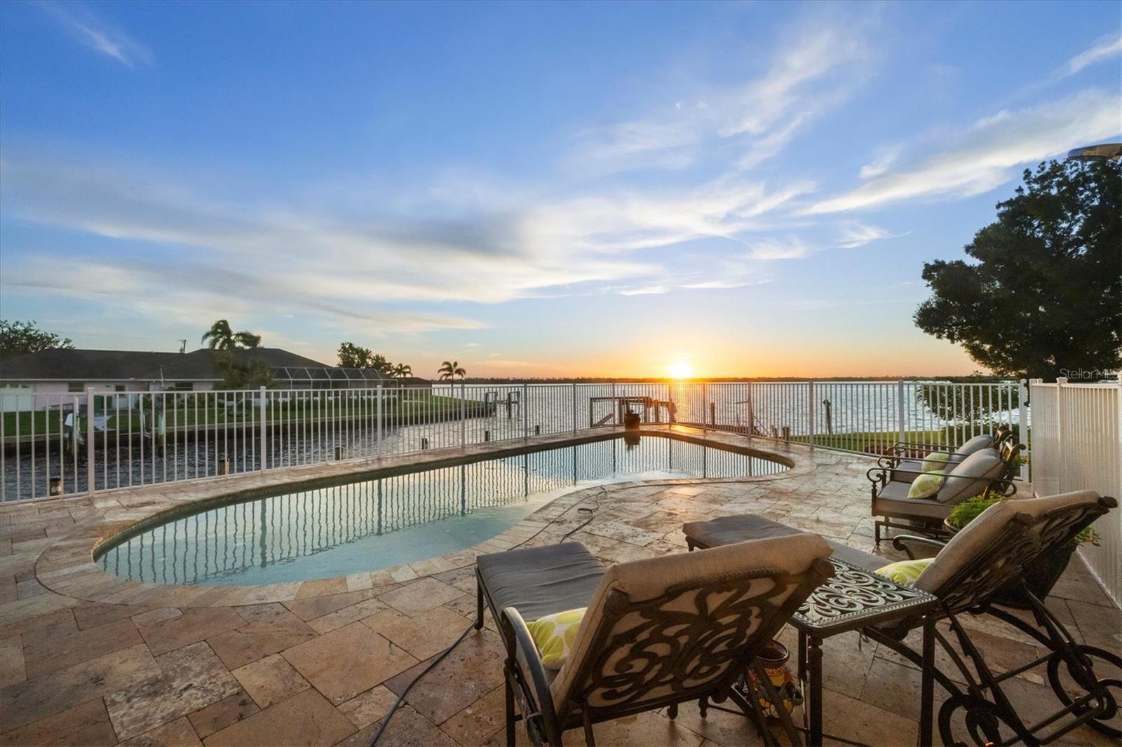 Introducing "River Breeze at Paradise Point" - the whimsical name of this breathtaking property, affectionately bestowed by the current owners. This stunning waterfront estate, stretching across 0.39 acres, is perched along the Myakka River with quick access to Charlotte Harbor and a 30-minute boat ride to the Gulf. It's every boater's dream to the best fishing in Southwest Florida, featuring 185 feet of concrete seawall, a 167-foot captain's walk, and a 2023 metal-roofed boathouse with a 16,000 lb remote-controlled boat lift. Enjoy dolphin, manatee, and bald eagle sightings, or cast a line for record snook, world-renown tarpon, and redfish--all from your backyard. The home offers 3,825 sq ft of living space and a spacious, well-organized 1,327 sq ft 4+ car garage with 10.5-foot ceilings. Inside, the soaring 20-foot foyer with a sweeping staircase leads into a bright music room with 12-foot bamboo tray ceiling, and an entertainer's dream kitchen featuring a massive quartz island, updated cabinetry, stainless appliances, and three built-in dishwashers. The kitchen flows seamlessly into the dining and bar areas and out to a 56-foot screened patio and extended lanai--perfect for year-round indoor-outdoor living. Step out to the heated saltwater pool, surrounded by open-air lounge space ideal for relaxing in the Florida sunshine. The primary suite is a private retreat with a sitting area, two walk-in closets, a luxurious 14x14 bathroom with a 5x7 glass shower, and direct access to a private waterfront balcony. The primary guest suite also features a private balcony and river views. Every bedroom is en suite, ensuring comfort and privacy for guests. Throughout the home, enjoy travertine and engineered wood flooring with porcelain tile in 2nd level bathrooms, detailed crown molding, and abundant storage including multiple custom closets. Additional recent upgrades include a new standing seam metal roof (house and boathouse), two new A/C units with whole-home UV filtration, spray foam insulation, PECS plumbing system, impact-resistant windows and doors throughout, and fresh interior/exterior paint. The pool features a new heat pump, chlorine generator, and variable-speed pump, while rebuilt decks and upgraded kitchen and baths further elevate the home's quality and style. Tucked away in Gulf Cove, a hidden gem community known for its quiet streets, friendly neighbors, and walkable, bike-friendly atmosphere, this exceptional home offers luxury, comfort, and breathtaking water views--delivering unmatched waterfront living in a peaceful coastal setting.