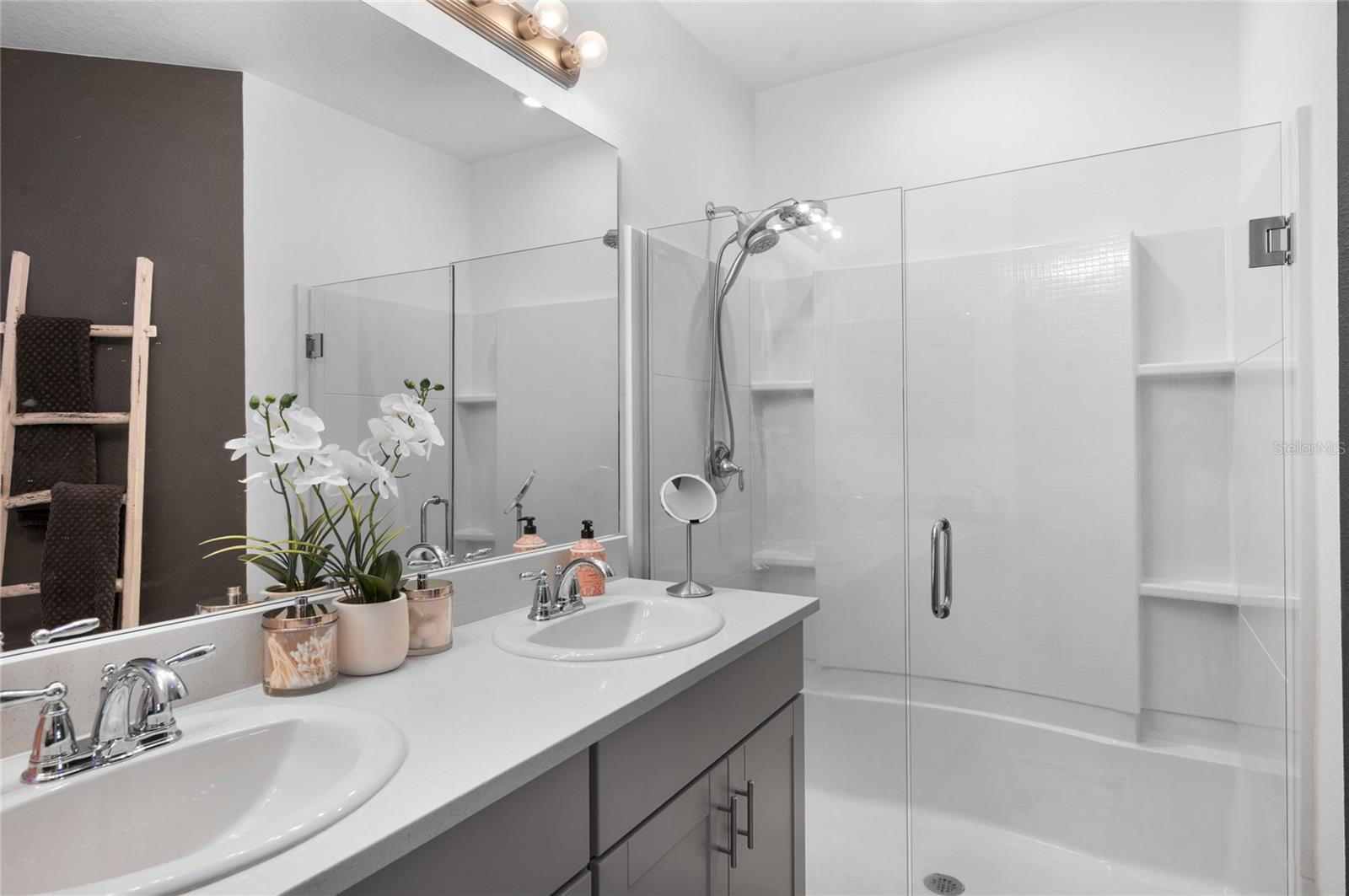 Model-sharp and move-in ready! This beautifully appointed 3-bedroom, 2-bath single-level home showcases stylish upgrades and thoughtful design throughout--with no carpet anywhere in the home for easy maintenance and a clean, modern look. The open-concept layout features quartz countertops, light gray shaker cabinetry, and an upgraded backsplash that adds a custom touch to the kitchen. Plantation shutters throughout and upgraded interior paint create a cohesive, designer feel, while the spacious living room is anchored by a large statement ceiling fan.The owner's suite offers a private retreat with dual vanities, a frameless glass shower, and custom built-in cabinetry for added storage and elegance.Step outside to your oversized, upgraded screened lanai with paver flooring--plus an extended grilling area perfect for entertaining. Beautiful landscaping enhances the home's curb appeal and outdoor enjoyment.Enjoy resort-style community amenities including a pool, fitness center, billiards room, playground, library, and clubhouse.This home truly combines comfort, style, and lifestyle--schedule your showing today! Florida is calling!