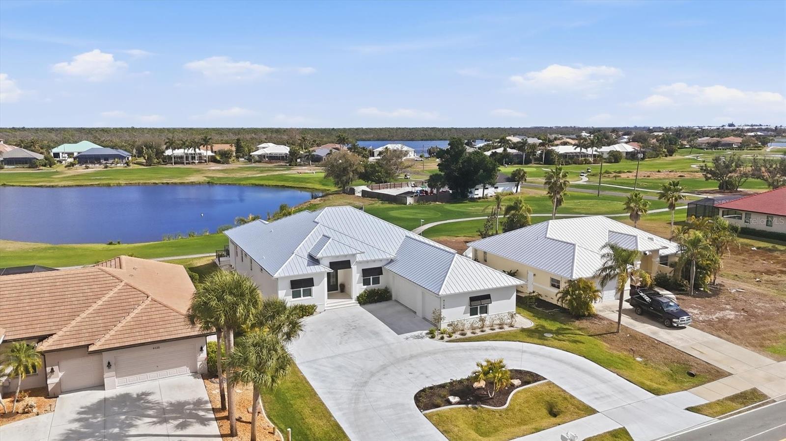 Perfectly positioned on a prime golf course front homesite with breathtaking lake and fairway views, this 2025-built luxury residence showcases awe-inspiring design and uncompromising construction quality. Offering 3 bedrooms plus a spacious den/family room, 3 full baths, and nearly 3,000 square feet under air (approximately 4,700 total square feet), this exceptional home blends elegance, comfort, and superior craftsmanship. A grand double-door entry opens to a dramatic foyer with instant, mesmerizing views of the golf course, lake, and spectacular pool lanai. Expansive living areas are enhanced by soaring 12+ foot ceilings, large-pattern plank tile flooring throughout, and premium designer finishes at every turn. The impeccably appointed kitchen is a true showpiece, featuring stunning Taz Mahal stone countertops, an oversized island wrapped in additional cabinetry, designer tile backsplash, built-in stainless steel appliances, and a generous butler's pantry. The adjoining great room impresses with a towering tray ceiling and a striking large marble feature wall with grand inlay fireplace. A spacious den/family room offers secluded comfort with direct pool access and tranquil views - perfect for relaxing or entertaining. Bathrooms boast exquisite tile work, complemented by premium lighting and plumbing fixtures throughout the home. A bright, oversized laundry room just off the butler's pantry provides abundant storage and workspace. Outdoor living is nothing short of sensational. The heated pool and spa are surrounded by an immense covered lanai, an open-air sitting area with fire pit, and beautiful stone pavers - creating the ultimate setting for quiet evenings or vibrant gatherings. Additional highlights include a metal roof, impact-resistant windows and sliders, a grand circular driveway, and a three-car garage with epoxy-coated flooring and a convenient lift system to the spacious attic. Ideally located in a superb coastal setting just minutes from three marinas, the pristine sandy beaches of Palm Island and Boca Grande, world-class fishing and boating, outstanding private and public golf courses, and within golf cart distance to essential shopping and dining.
