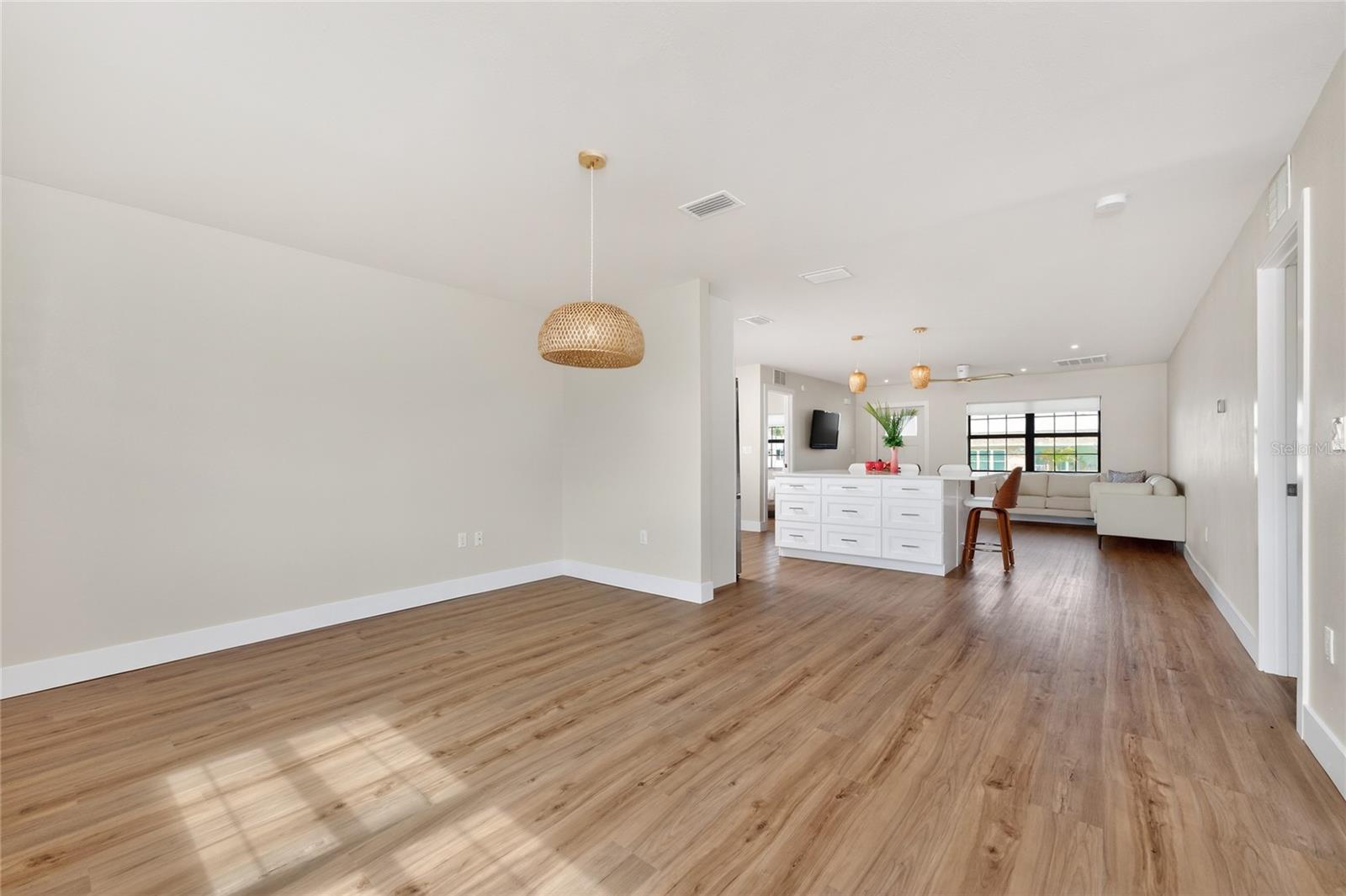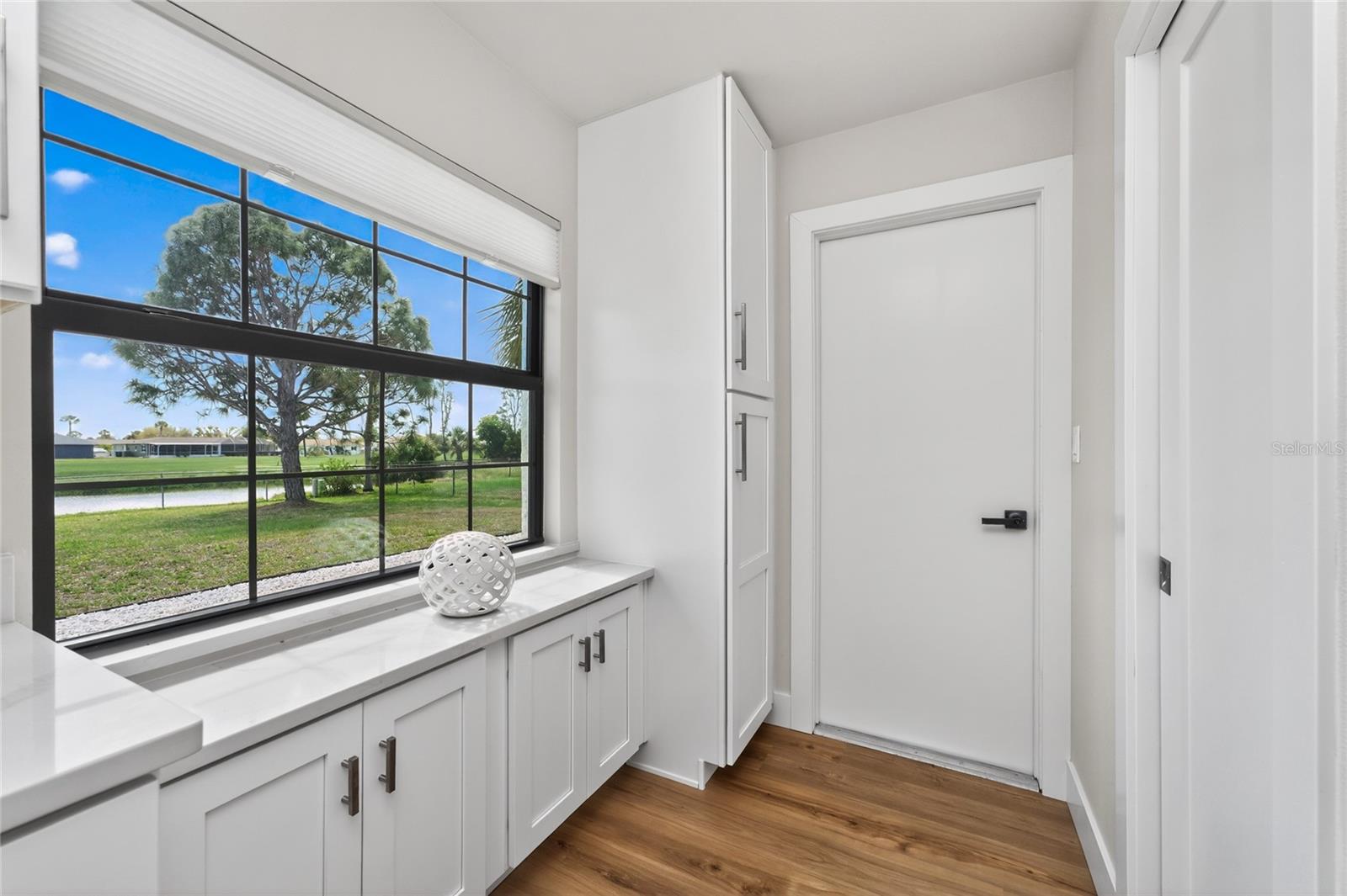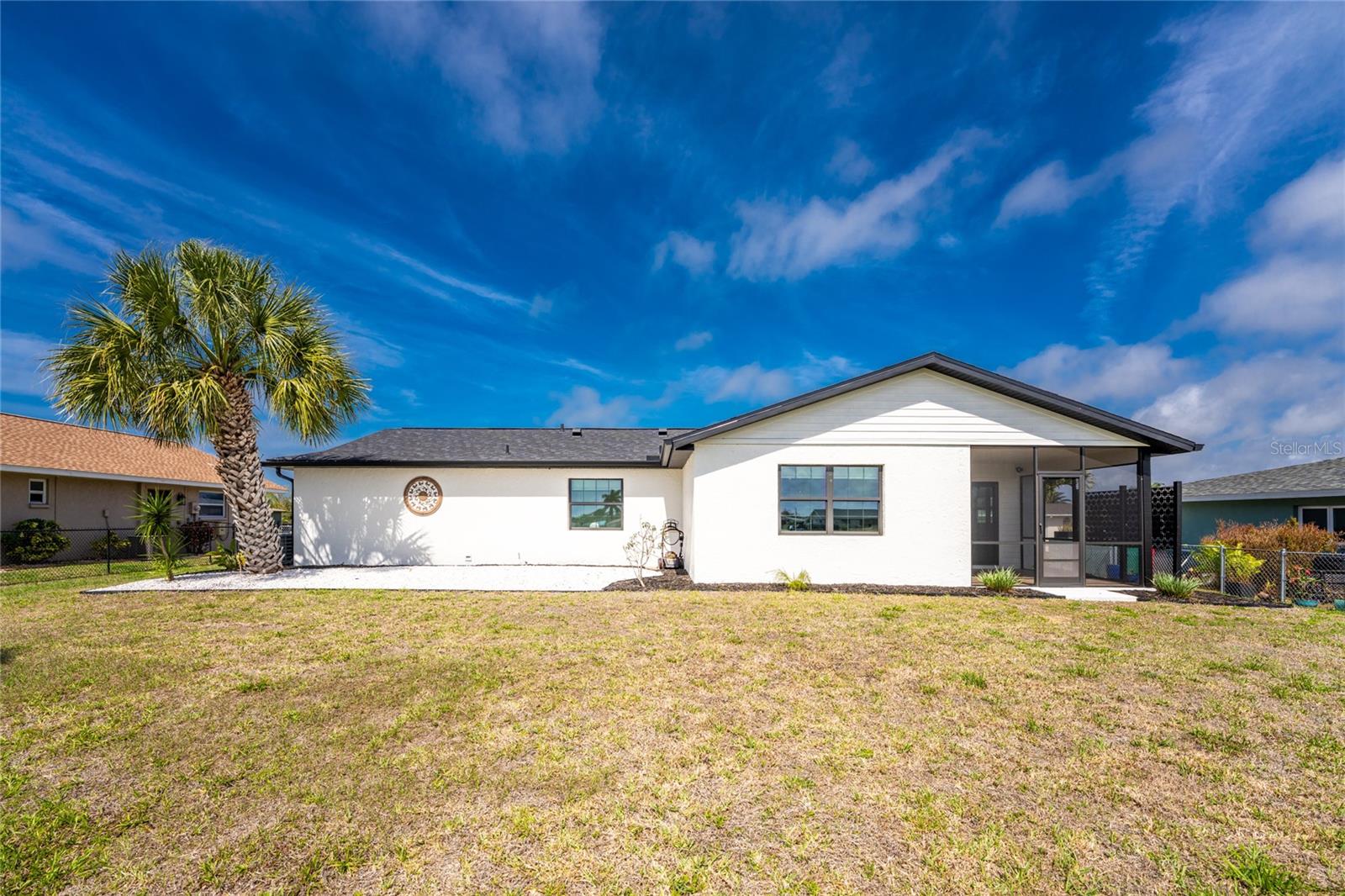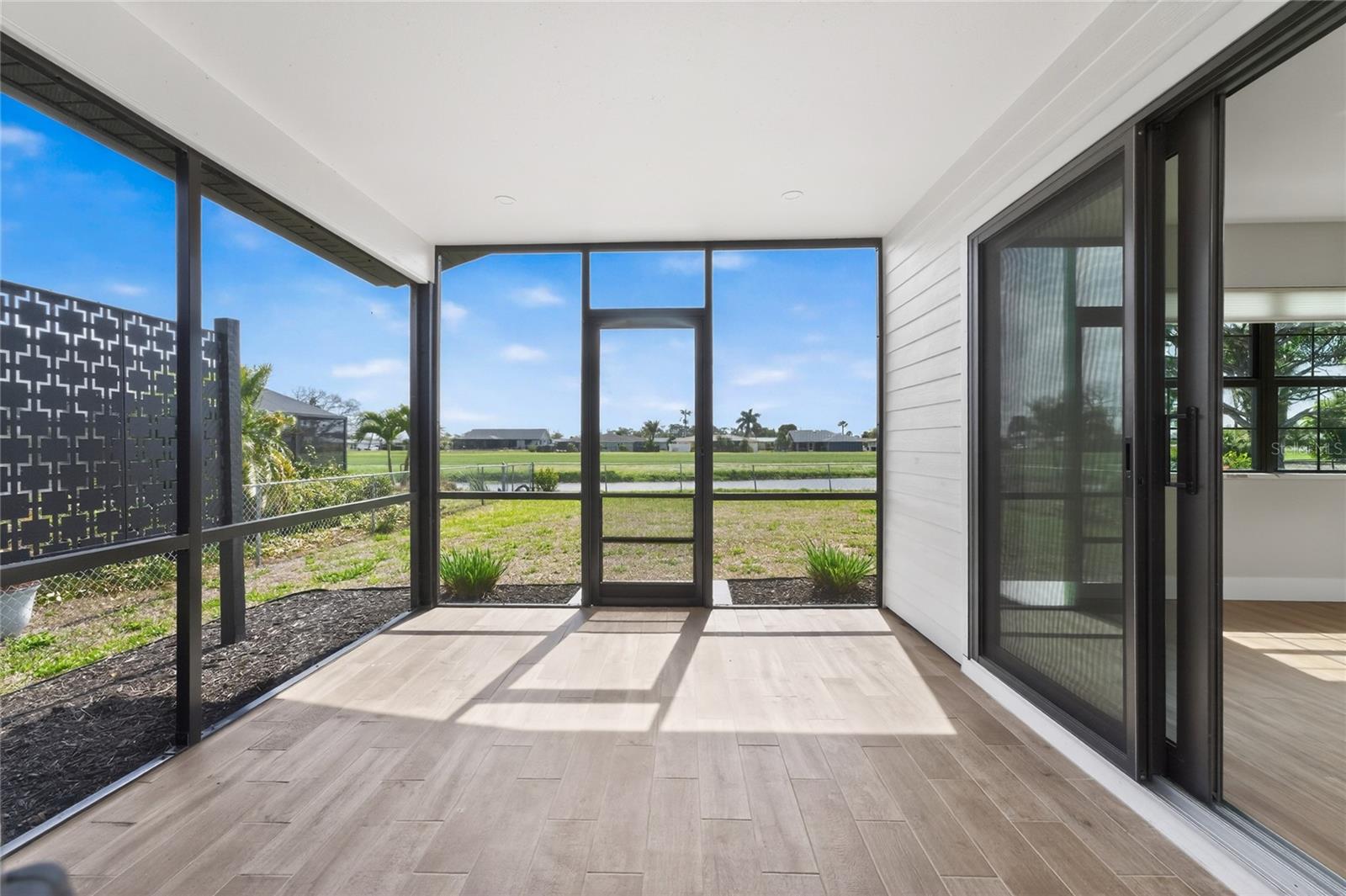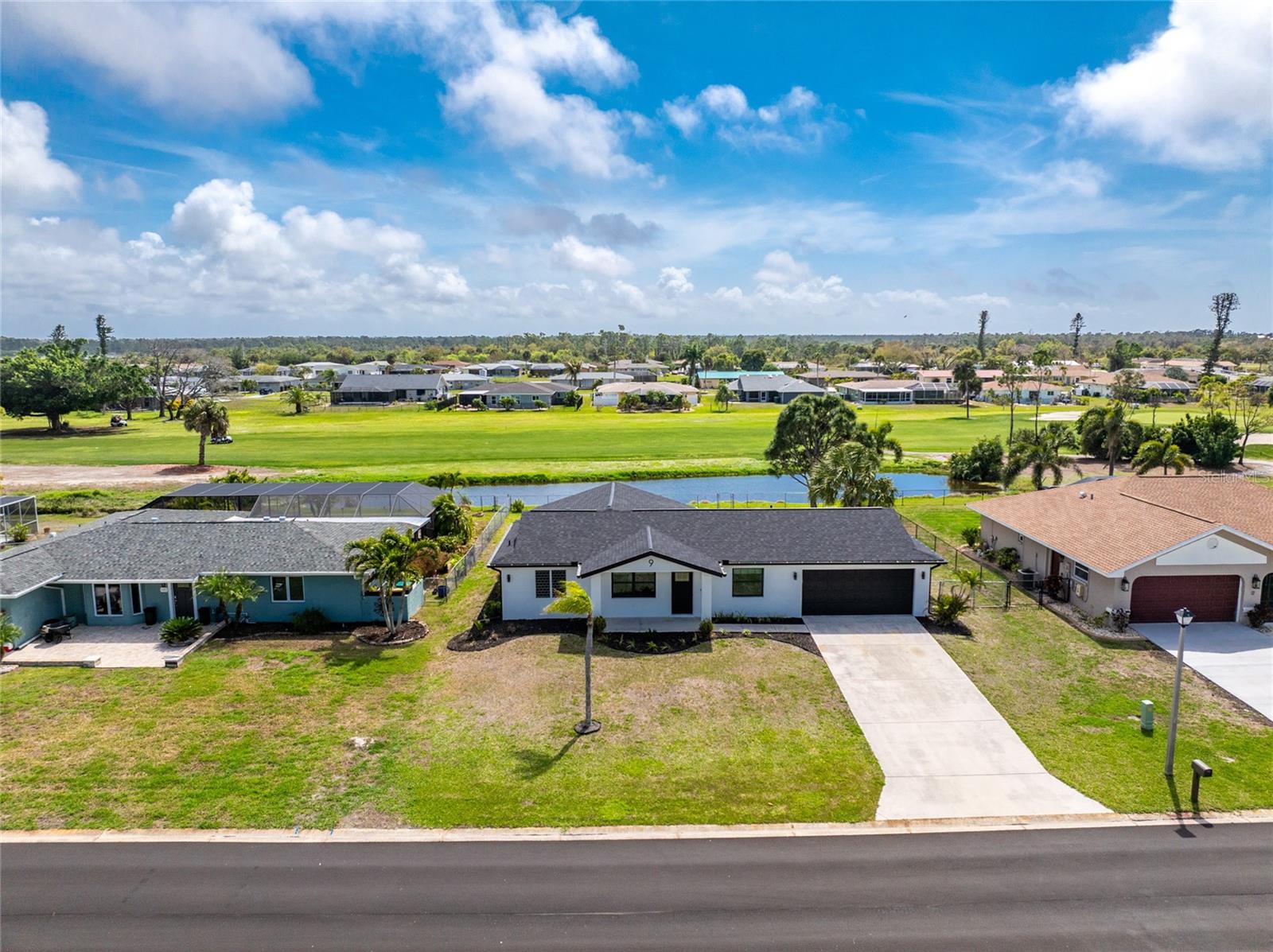 Modern Luxury Meets Beautiful Pond and Golf Course Views in This Fully Remodeled Oakland Hills Home! Enjoy peace of mind with impact windows and an impact garage door, an X flood zone classification for the home structure, a 2024 roof, and a complete interior renovation. The charming exterior, highlighted by a long driveway, refreshed landscaping, and inviting curb appeal, sets the stage for the stylish updates found inside. Luxury vinyl plank flooring flows seamlessly throughout this two bedroom, two bathroom home, creating a cohesive and easy to maintain living space. Neutral paint tones and an open great room floor plan fill the home with natural light and create a bright, welcoming atmosphere. The beautifully updated kitchen features white shaker style cabinetry with soft close hinges, quartz countertops, custom hardware, a farmhouse sink, stainless steel appliances, and a large center island with pendant lighting for easy everyday living. The formal dining area offers flexibility with sliding glass doors that open to the screened patio, making it perfect as a dining room or additional family room space with easy access to outdoor living. The primary bedroom suite features sliding glass doors to the lanai, a spacious walk-in closet with a custom organizer system, and a barn style door leading to the private bathroom. Here you will find a dual sink vanity with quartz countertops and a large fully tiled walk-in shower with niche detail and a rain style shower head. The guest bedroom includes two reach-in closets and also functions as an ensuite with a beautifully updated bathroom featuring a quartz topped vanity and fully tiled walk-in shower. A convenient second door allows this bathroom to be accessed from the kitchen area as well. Step outside to the covered and screened patio with tile flooring that overlooks the backyard and the scenic pond and golf course beyond. The spacious yard offers room to add your own pool, expand the patio, or create a garden or outdoor entertaining area while enjoying peaceful water and golf course views as your backdrop for relaxing evenings under the stars. Located within the Oakland Hills section of Rotonda West, this deed restricted community offers an active Florida lifestyle with golf, tennis, pickleball, hiking trails, community events, and excellent fishing opportunities nearby. The home is also less than ten miles from Englewood Beach where residents can enjoy sunny days on the sand, waterfront dining, local restaurants and tiki bars, or beautiful Gulf Coast sunsets with live entertainment. From morning coffee overlooking the water and golf course to evenings enjoying the peaceful outdoor setting, this beautifully renovated home is ready to be enjoyed at 9 Oakland Hills Court.