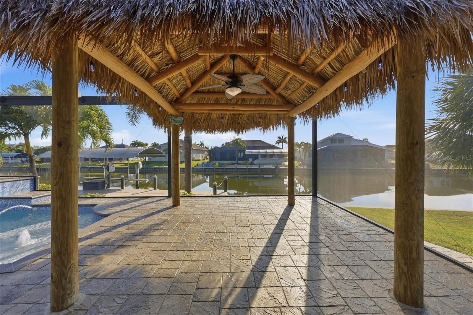 Welcome to SW Florida Living in this Exceptional Waterfront Pool Home. This Stunning 3-bedroom, 2-bathroom 3 car Garage, Pool Home with Tile Roof is Loaded with Luxury Features and No Detail has been Spared on the Exterior or Interior. Feast your Eyes on the Stunning Exterior with Stone Accents and Eye Catching Dimensional Design. The Yard has Mature Landscaping with Concrete Curbing and Decorative Rock all kept Lush and Green with Irrigation. The Paver Driveway and Walkway Lead you to the Impressive Entryway Notice the Double Leaded Glass Doors that Open into a Grand Foyer with Decorative Columns, where your Eyes will be Drawn to the Large Open Space of your Living Room, Kitchen and Dining Area. Who could miss the Impressive Coffered Ceiling or The 9 ft Zero Corner Sliders that Open and Give Inviting Views of the Heated Pool, Tiki Hut and Lanai. The Pool area Features a Paver Decking around the Oversized Pool with an Elevated Waterfall, Jets, and Bubbler on the Lounging Ledge. The Tiki Hut provides an Additional Covered Area for Entertaining with its own Electric & Lighting, the Outdoor Kitchen is Equipped with Refrigerator, Sink and Granite Counters. A Paver Walkway takes you to the Incredible 40' Composite Dock. This Dock is Fully Equipped with Water, Electric, a 10,000 lb Covered Boat Lift, A Fish Light for night time viewing of Fish and an 88' Concrete Seawall, all set in one of the most desirable locations in South Gulf Cove. Inside the Home, the Craftsmanship Shines with Coffered and Tray ceilings Adorned with Crown Molding, Beautiful Fixtures and Accent Paint Color. The Entire home has Porcelain Tile, Wide Baseboards, Hurricane Impact Windows & Doors, Window Coverings and a Super Hurricane Shade for the Lanai. The Chef Inspired Kitchen is a Showstopper, Boasting a Double Deep Center Island, Luxury Stainless Steel Appliances, Refrigerator, Range with Built In Range Hood, Under Cabinet Microwave, and Custom Soft-close All Wood Cabinetry With Crown molding & Under Cabinet Lighting. A Tile Backsplash with Decorative Detail and the Walk-In Pantry add to the Kitchen's Charm. The Nook/Dining Area is Oversized and will Accommodate a Sizeable Table and/or a Buffet Cabinet. The Well Equipped Laundry Room is Located off the Kitchen and Has Great Storage Cabinets with Sink. The Owner's Suite is an Oasis, with Tray Ceilings, Pool access, and 2 Walk-in Closets. The Luxurious Owner's Bath Offers a Large walk-in Shower, Dual Vanities with Vessel Sinks, Granite countertops and a Custom Make-up Vanity. The Room Located to the Front of the Home can Be Used as a Formal Dining Room, Office, or a Flex Space. Two nicely Sized Bedrooms are on the opposite side of the Home and give Privacy for Family or Guests. The Luxurious Second Bath Doubles as the Pool Bath with a Full Shower and Vanity with Vessel Sink. These are Just Some of the Exceptional Details that make this Home the Epitome of Indoor Elegance & Outdoor Paradise. Entertain, Relax, Fish and Boat All from your Back Yard. Come See this Home and what this Community has to See. South Gulf Cove is Nestled along the banks of the Myakka River, this community is just minutes from world-class beaches and championship golf. Perfectly positioned near Boca Grande, Englewood, and the pristine sands of Gasparilla Island. South Gulf Cove maintains a serene, "Old Florida" feel where wide, paved streets, sidewalks and nature preserves give a sense of space that is a rare luxury on the coast.